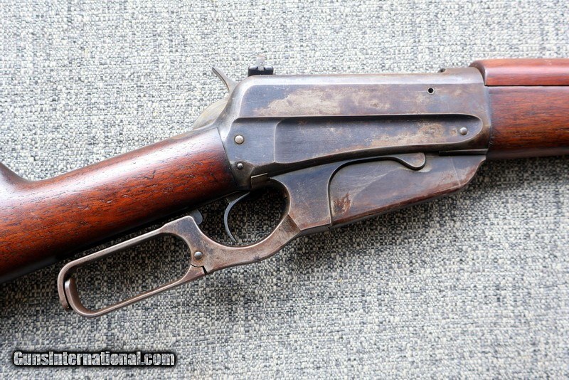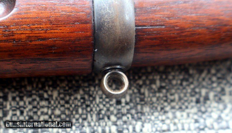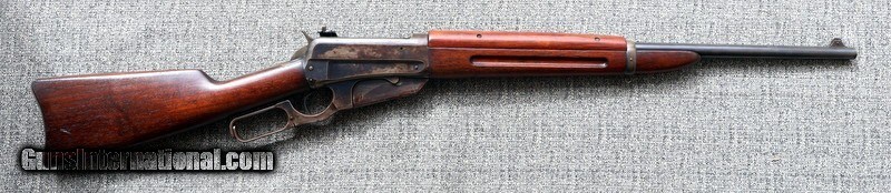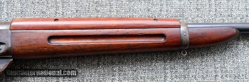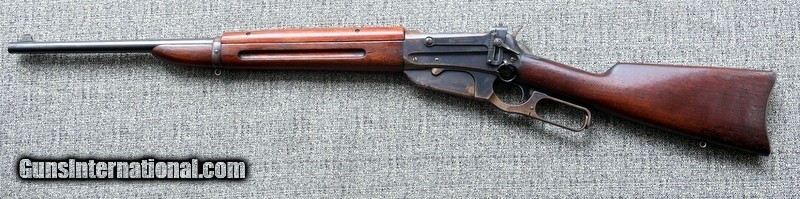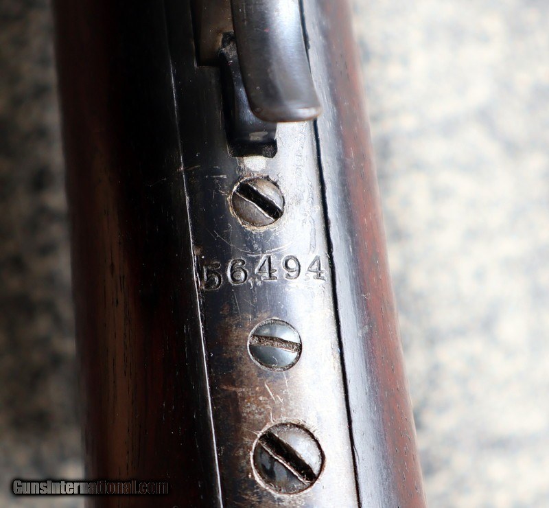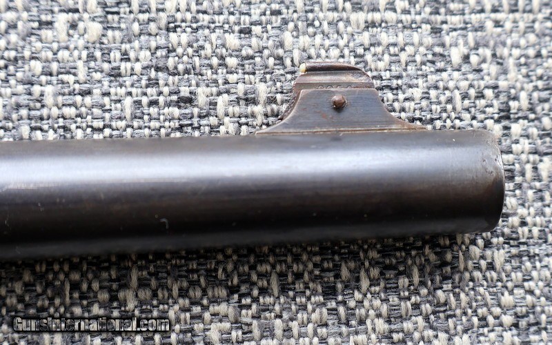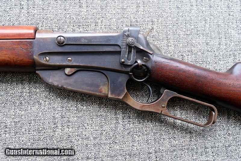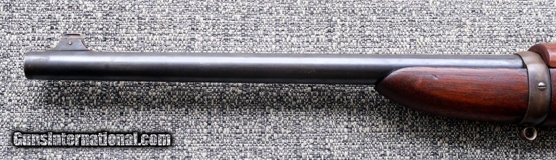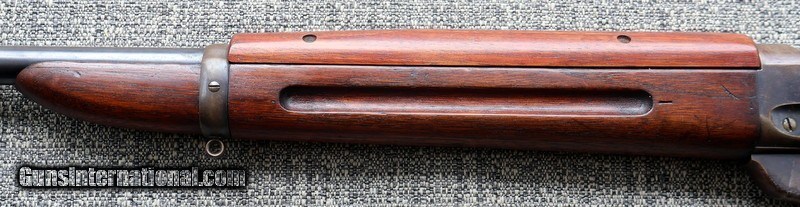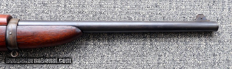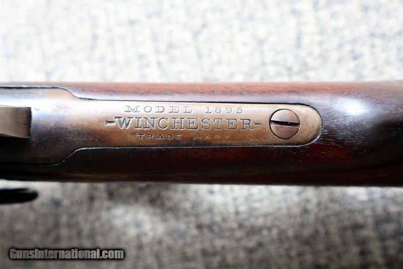This Winchester 1895 Saddle Ring Carbine was manufactured in 1907 and is in fine condition. The barrel retains nearly all its original blue with minor handling marks. The receiver retains 75-85% bright blue with balance flaked and blending with patina. Breech is stamped "30" with PW. The factory legends are mostly obscured by sight bar. Wood is excellent with the exception of some very minor dings and impressions the largest is on the right side of the buttstock. This carbine has been period modified by the addition of sling eyes and a Model 21 Lyman Peep Sight. The original barrel sight has been removed and a later replacement handguard has been installed.