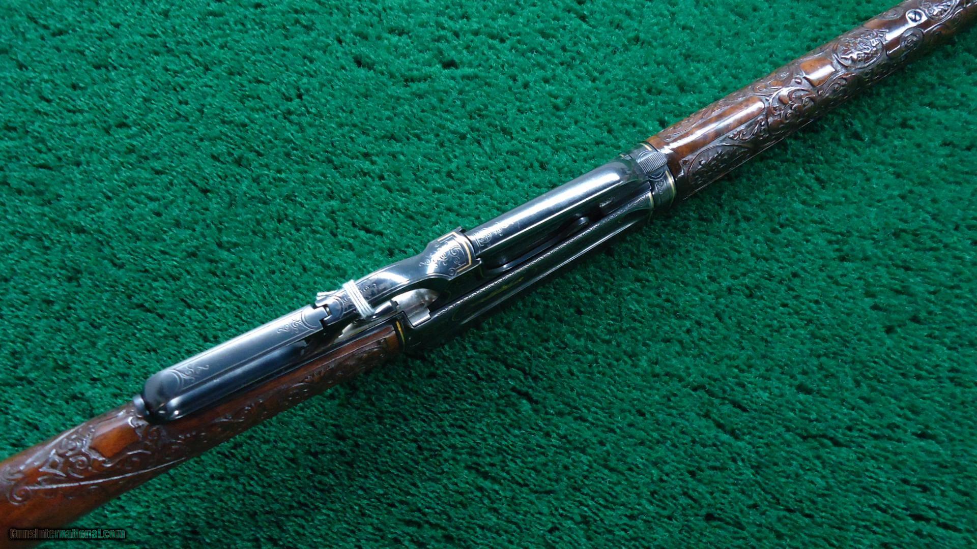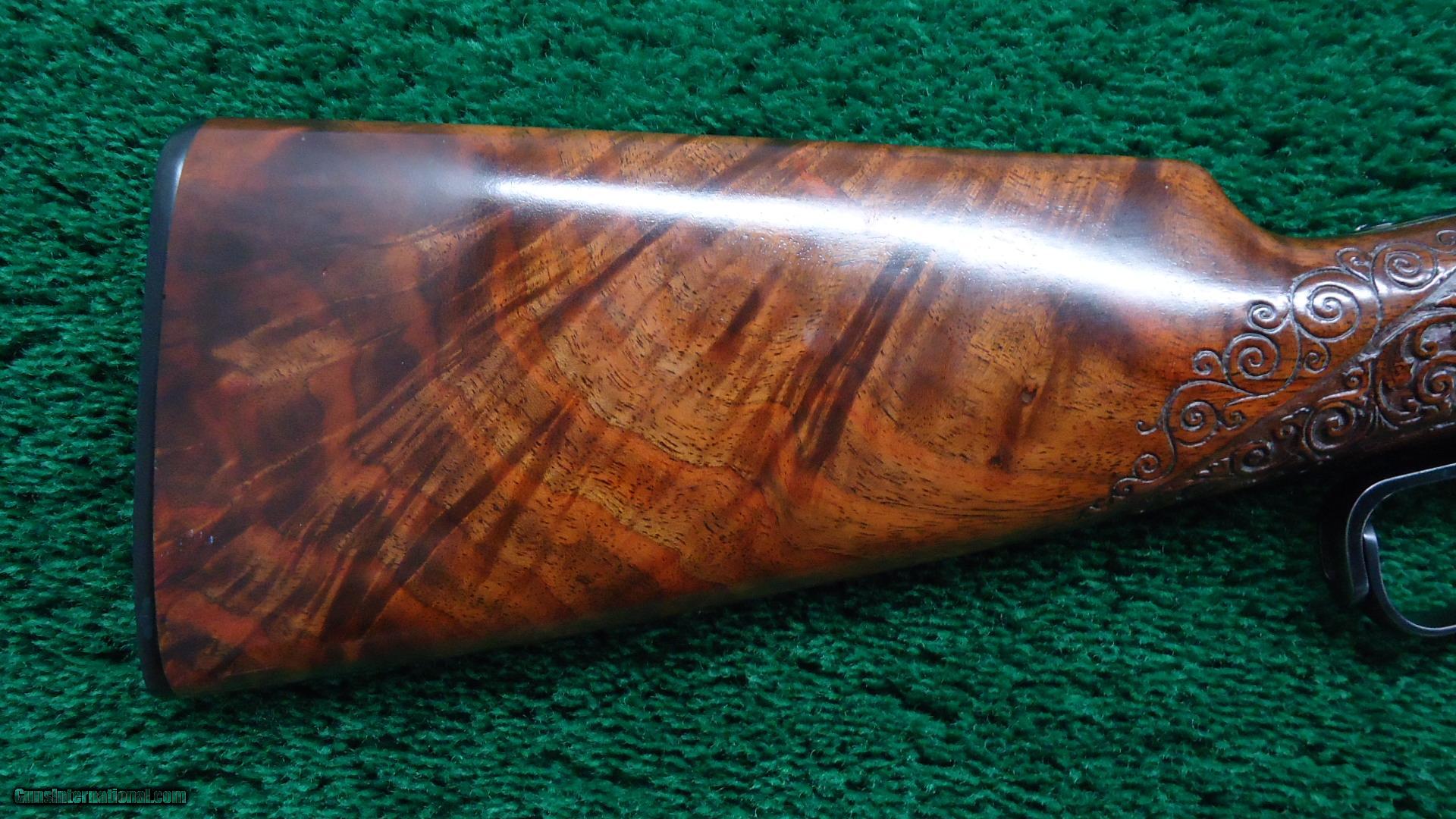 Description: Gun was presented by President Roosevelt to a hunting buddy. Cal 35 WCF. Orig sights. Original carved grade "B" checkered dlx wood in fine condition with an old refinish having been applied some time ago. Overall gun has been refinished and retains virtually all of that reblue. Was nicely done and is very attractive. There are several gold inlaid animals as well as gold borders. Tight scroll engraving covers most all of the gun. Marked on the lower tang is the stamp of John Ulrich, the engraver. This gun is well documented with a couple of Letters from R.L. Wilson and is also pictured in "The Texas Gun Collectors Antique Arms Annual" pg. 142 center gun. This gun was in the Jimmy Fowler collection and then to Greg Martin's collection. A superb historically significant Winchester that deserves to be in the worlds finest collection! Leroy Merz Antique Firearms specializes in antique and vintage Winchesters and other fine American firearms. Since 1965 Mr. Merz has taken part in the world of firearms and has been a contributor to many well known reference books. Just recently we mailed the 127th edition of our privately-published catalog. We have hundreds of additional guns in every price range at our home online. Search for Merz Antiques in google. SOLD Curio/Relic: Yes |