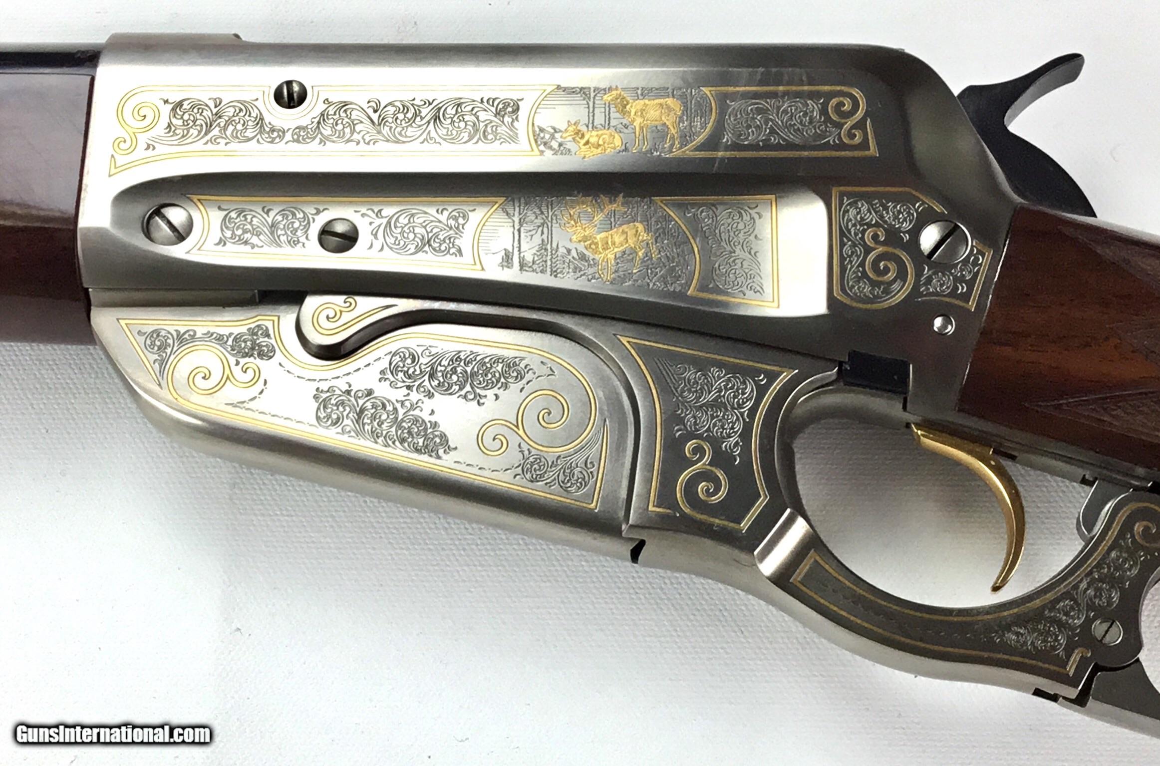Description: WINCHESTER MODEL 1895 30-06 HIGH GRADE, Well Figured Checkered Straight Grip Stock over Steel Butt Plate, Checkered Schnabel Forearm, Gold Plated Trigger, Coin Finish Receiver with Game Scene Engraving and Gold Inlays, 24” Heavy Barrel, LOP: 13 1/4 “, Weight: 8 lbs. 13 oz., Appears Unfired, Very Slight Handling Marks on Butt Stock, Excellent Condition Overall, Manufactured in Japan, SN-NFH0248, #966, $1595.00, HAMPELSGUNCO SINCE 1919. SOLD |