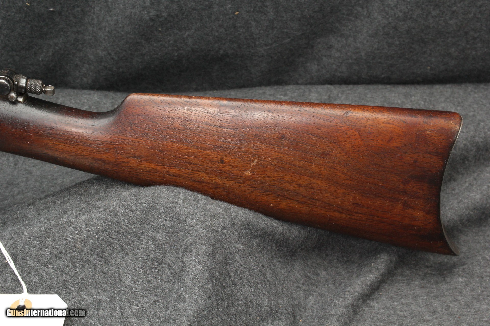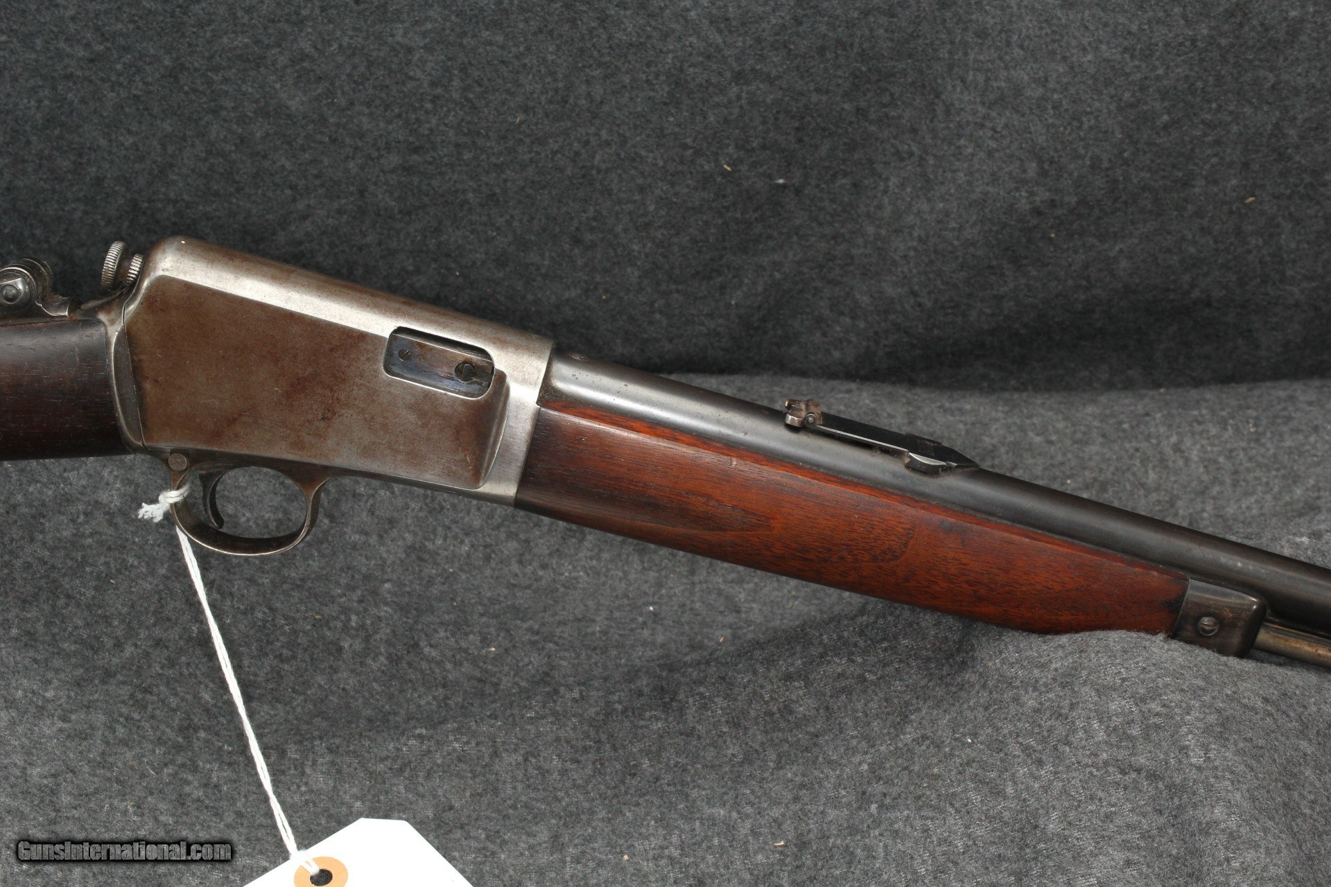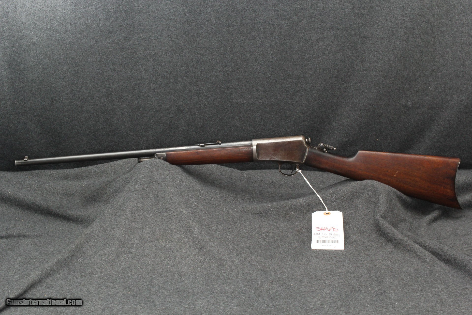 Description: 22 Winchester Automatic, mfg 1925. Serial number 1161XX. Appears to be all original. Correct era peep sight, been with gun for a long time. Marbles fold-down rear sight for use with peep. Wood is solid with oil staining at head. Shows age appropriate wear/marring, no abuse or cracks. Metal shows similar wear, 80% on barrel, action has turned plumb brown with 40% remaining blue. Forging striations showing on right side Bore is very good, shiny, no visible pitting. Mechanically excellent. Please add $40.00 for shipping and insurance. Will ship to C&R. SOLD Curio/Relic: Yes Rifle Caliber: .22 Winchester Automatic |