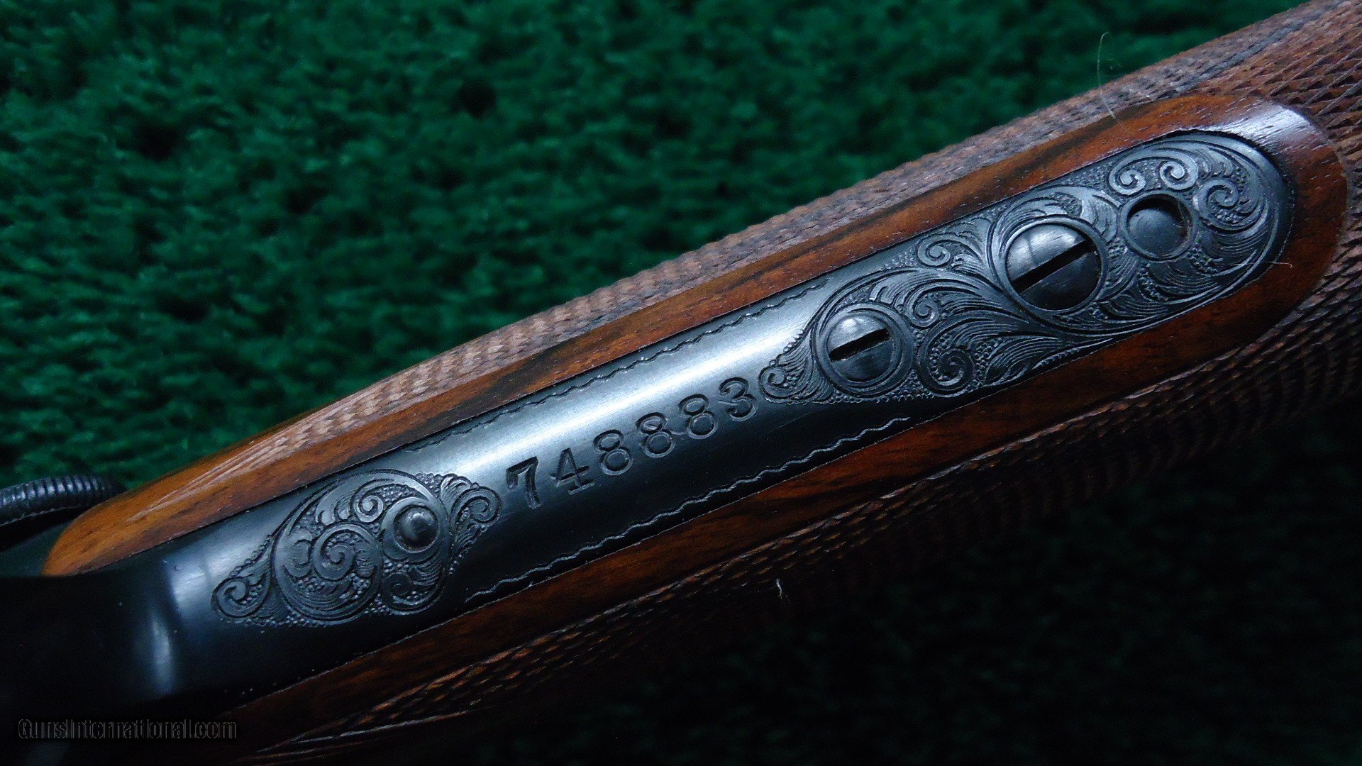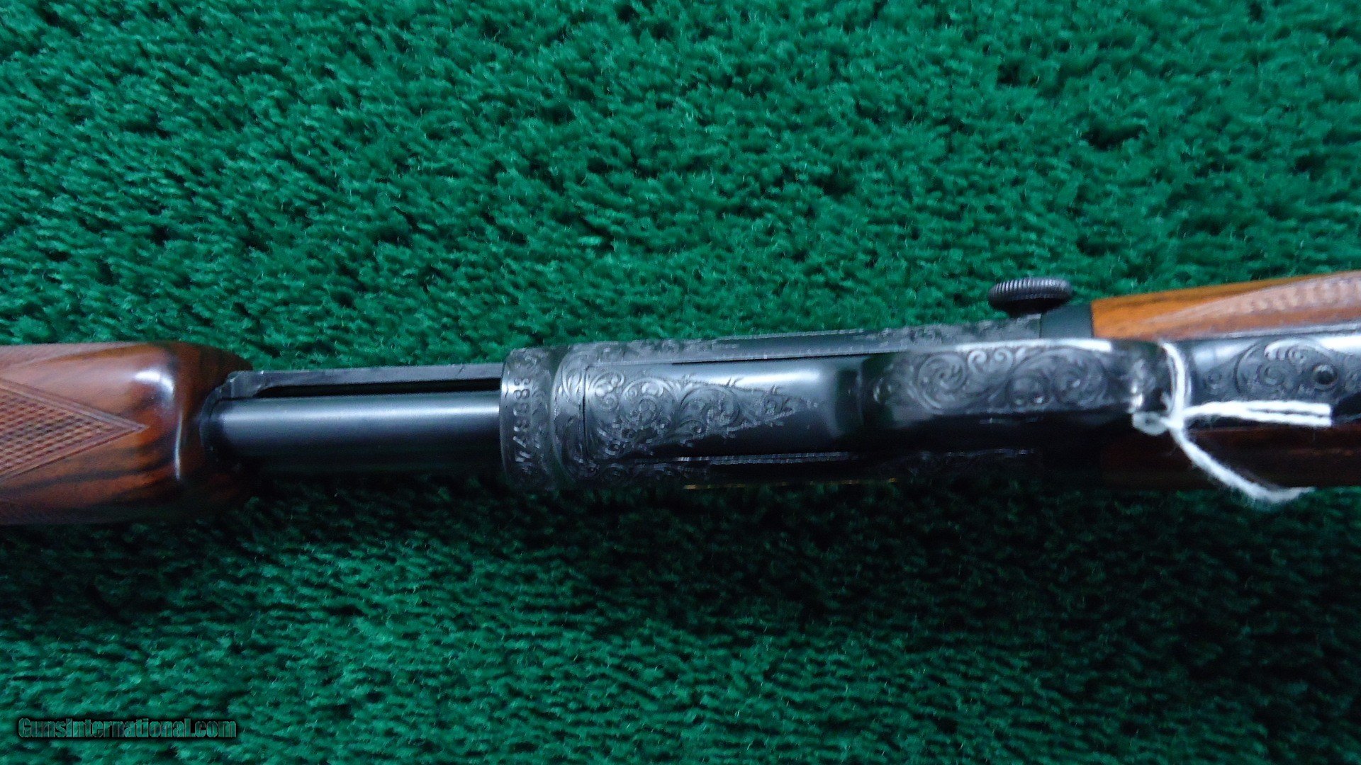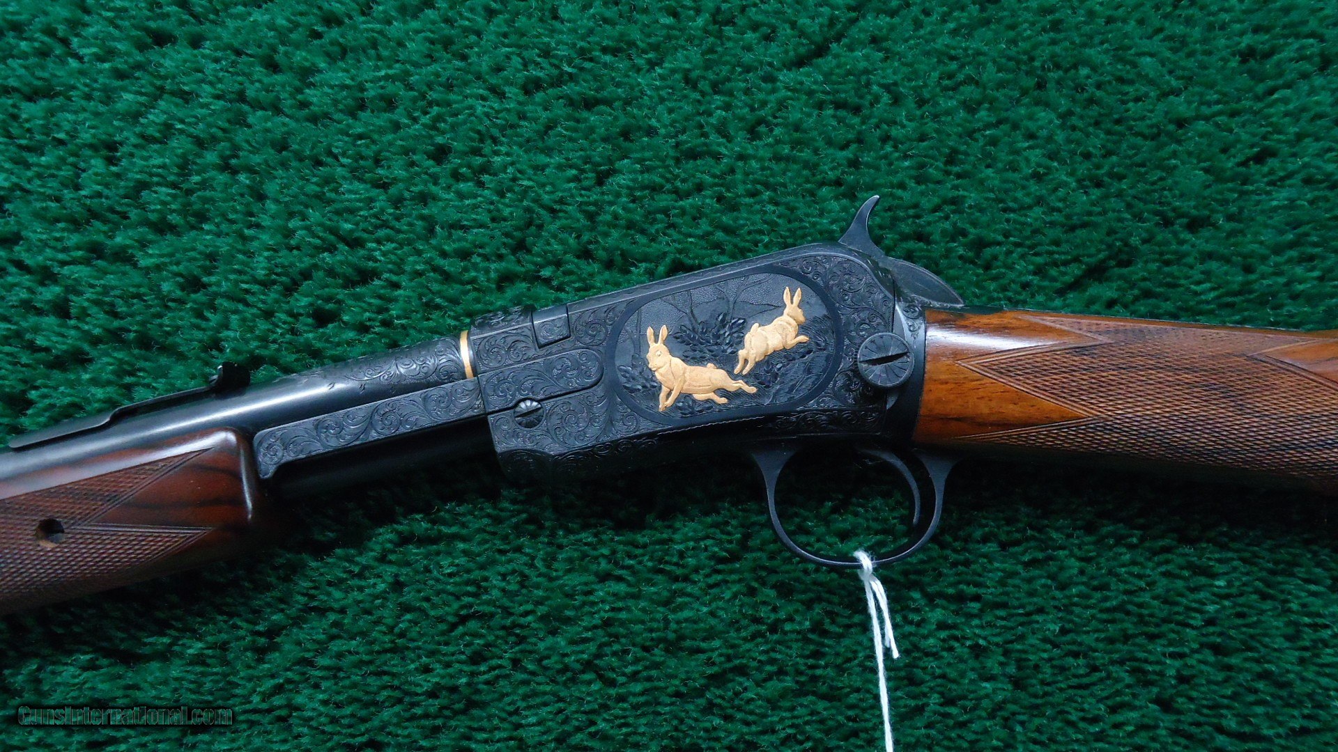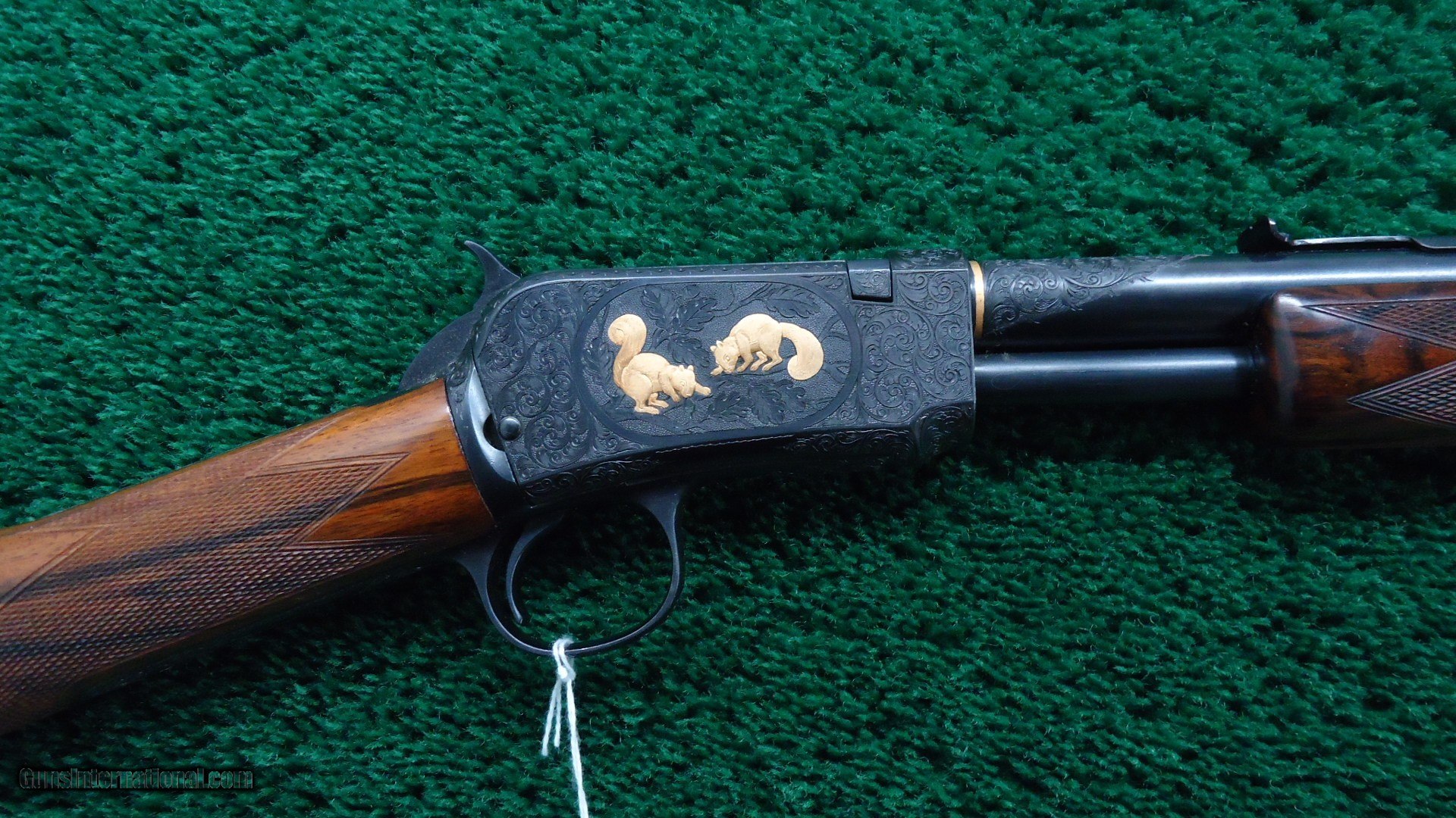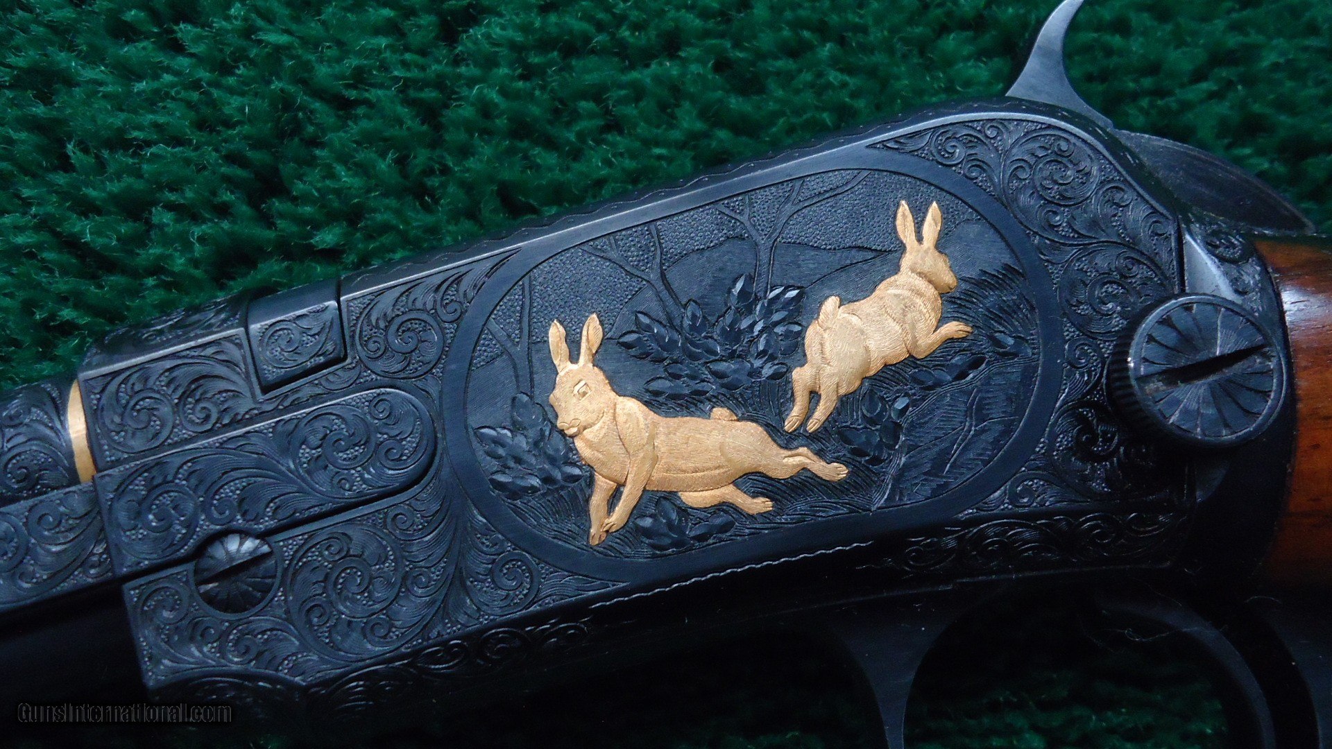 Description: Embellished to a grade far above what Winchester offered with custom upgrades by master engraver Walter Koluch. Upgrades include extensive floral scrolls and a punch dot background. Pair of high relief gold inlaid squirrels on left side of frame. Pair of high relief gold rabbits on right side. Gold barrel bands at muzzle and breech. Deluxe checkered walnut straight grip stock and forearm. Very nicely matched set of 4 – W2674, W2675, W2676, & W2677 – package price $21,000. Leroy Merz Antique Firearms specializes in antique and vintage Winchesters and other fine American firearms. Since 1965 Mr. Merz has taken part in the world of firearms and has been a contributor to many well known reference books. We have hundreds of additional guns in every price range at our home online. Search for Merz Antiques in google. SOLD Curio/Relic: Yes |