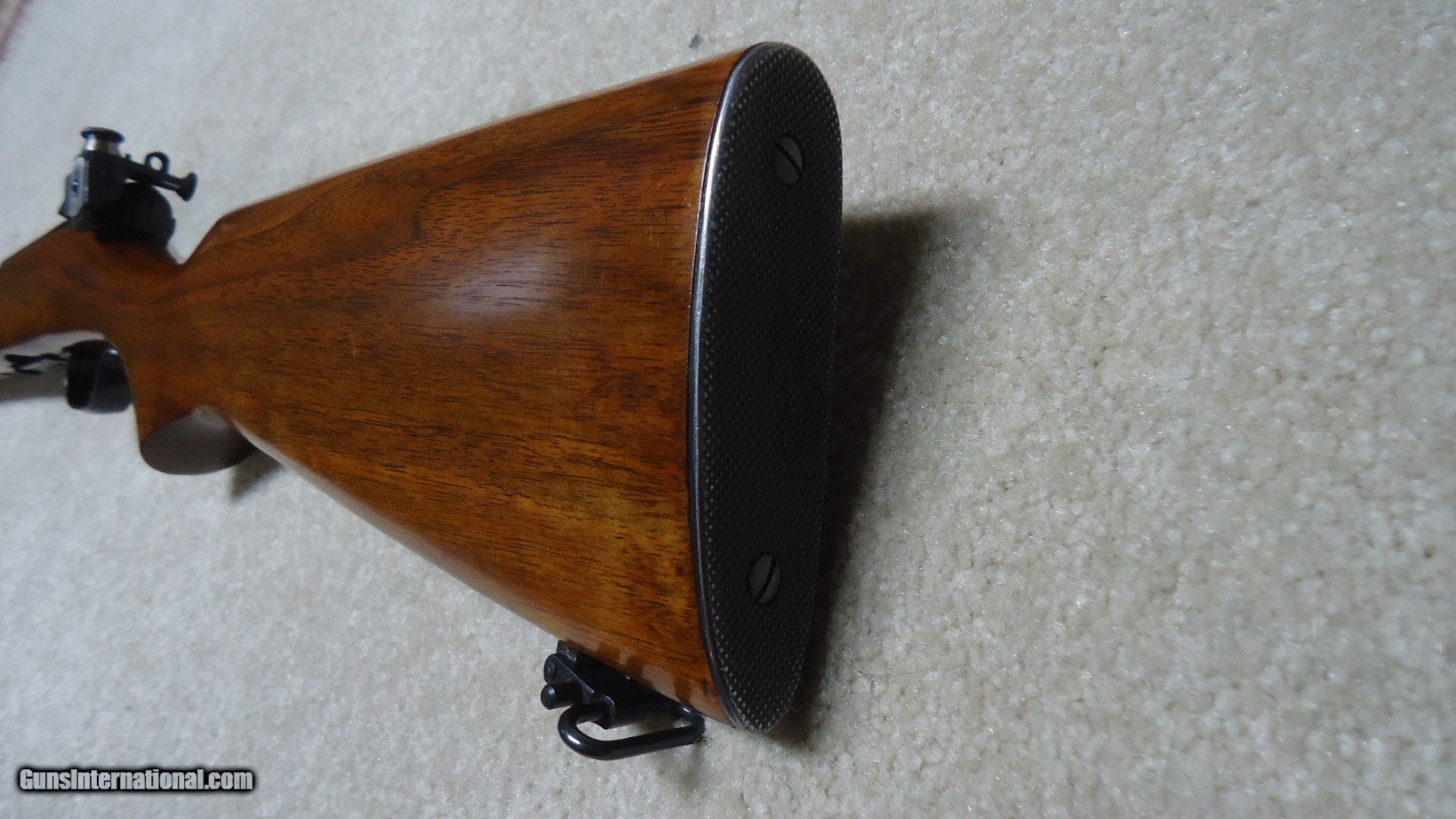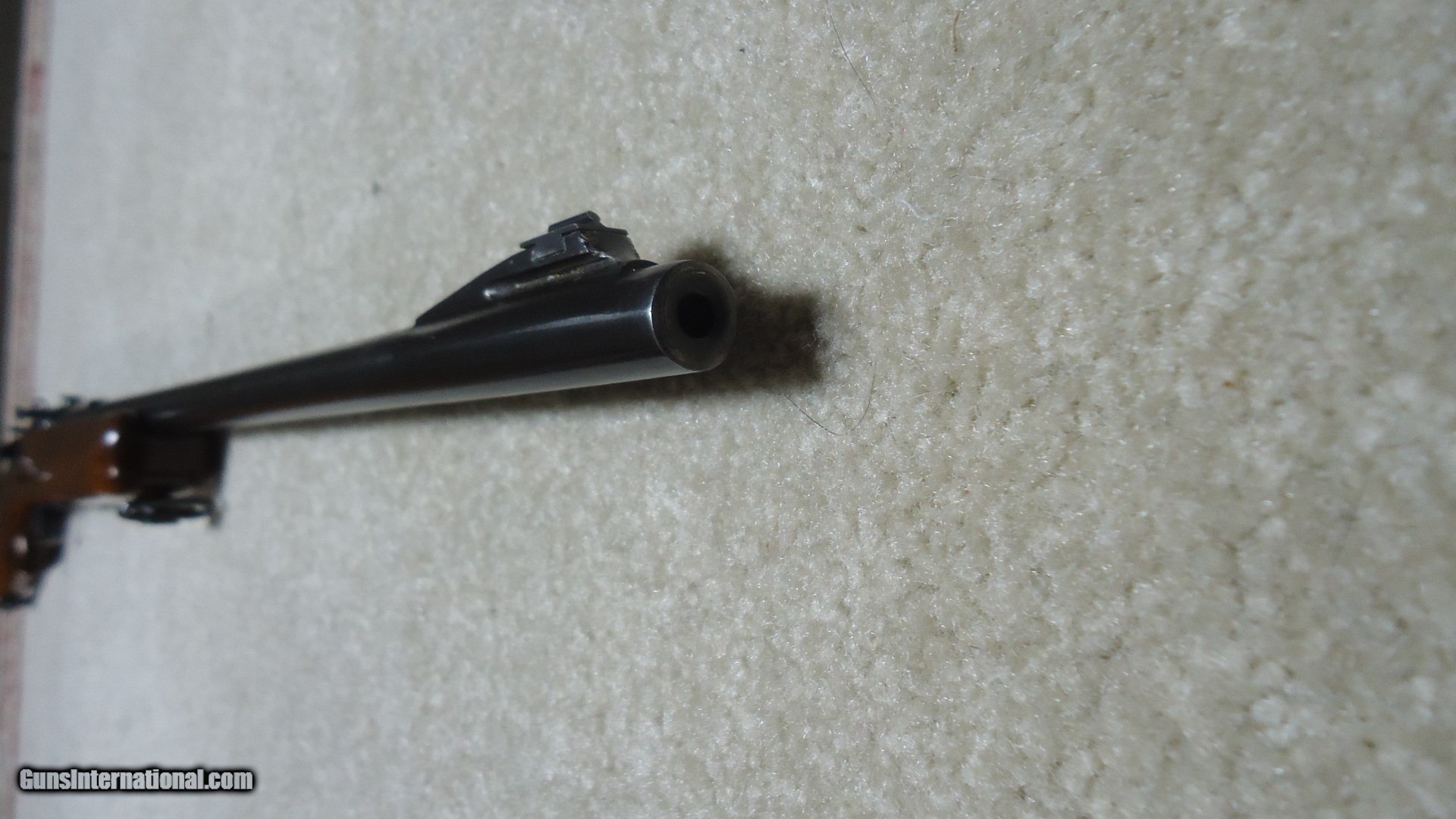Description: BEAUTIFUL, HIGH CONDITION MODEL 43 BOLT ACTION RIFLE IN SCARCE .218 BEE CALIBER, #58XXX, MADE 1952. This example shows nearly all of the bright blue with only the most minor of thinning on the bolt knob. Has the correct Lyman receiver sight with the rear barrel sight dovetail having a filler blank with no indication that there was ever a buckhorn sight mounted on the barrel. Excellent walnut stock with original steel butt plate, exc. mechanically and perfect bright bore. This one was factory drilled and tapped for scope mounting and has filler screws in the factory holes (In the Spring 2016 issue of the Winchester Collector put out by the Winchester Arms Collectors Association, there is a detailed article about the Model 43. In it is the info on how to tell if the rifle was drilled and tapped for a scope from the factory). Really nice example with sling swivels and Model 43 .218 Bee marked magazine intact. SOLD Curio/Relic: Yes Manufacturer: Winchester Model: MODEL 43 Serial Number: 58XXX Barrel Length: 24 Caliber Info: .218 BEE Condition: Excellent |