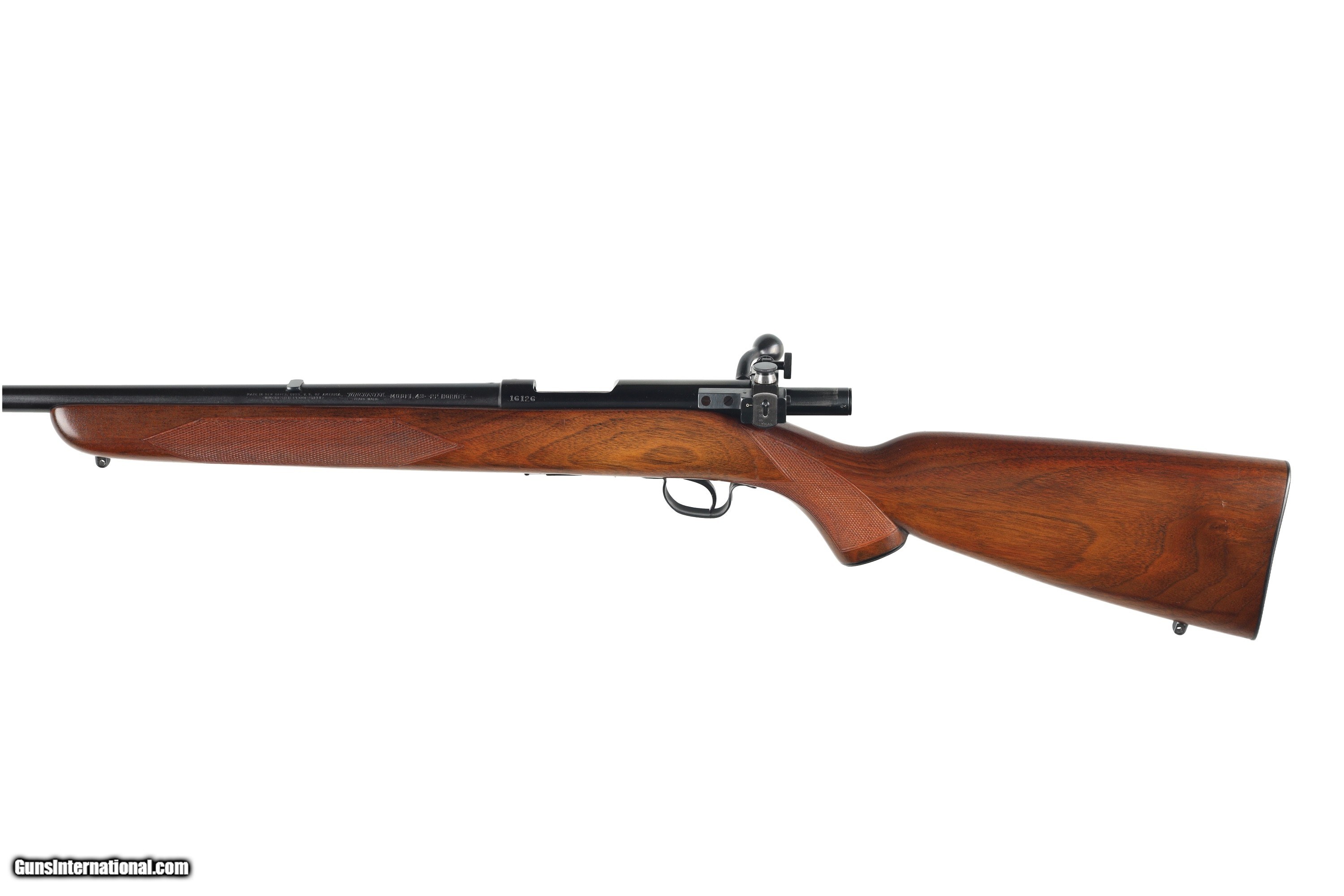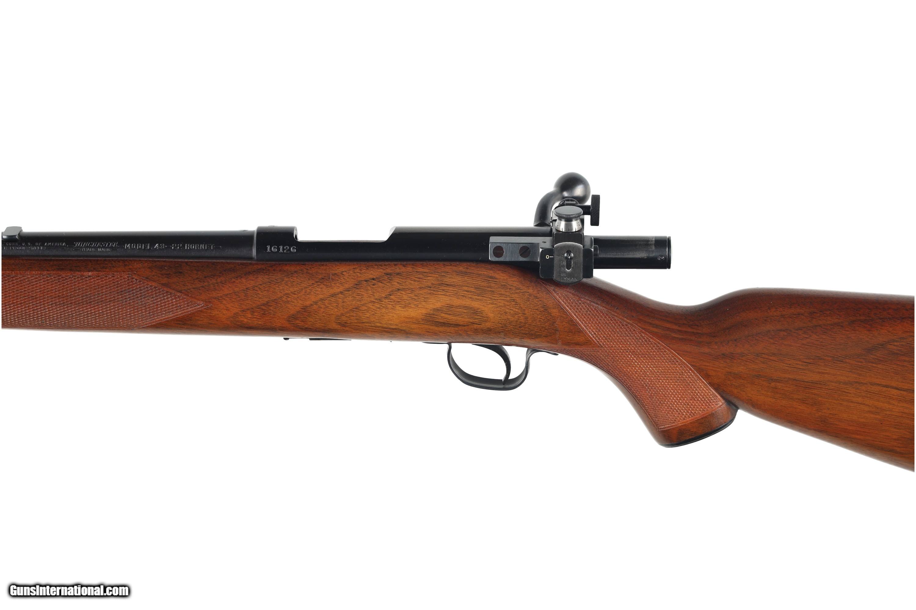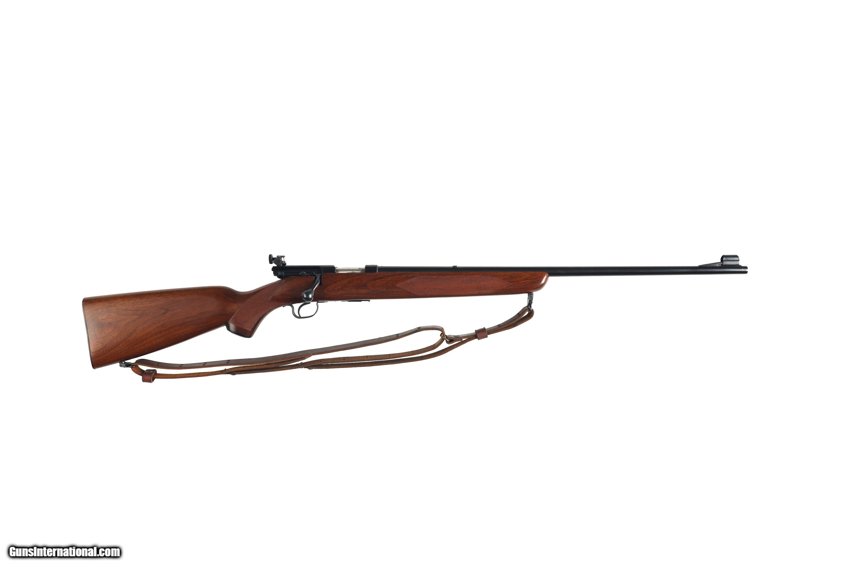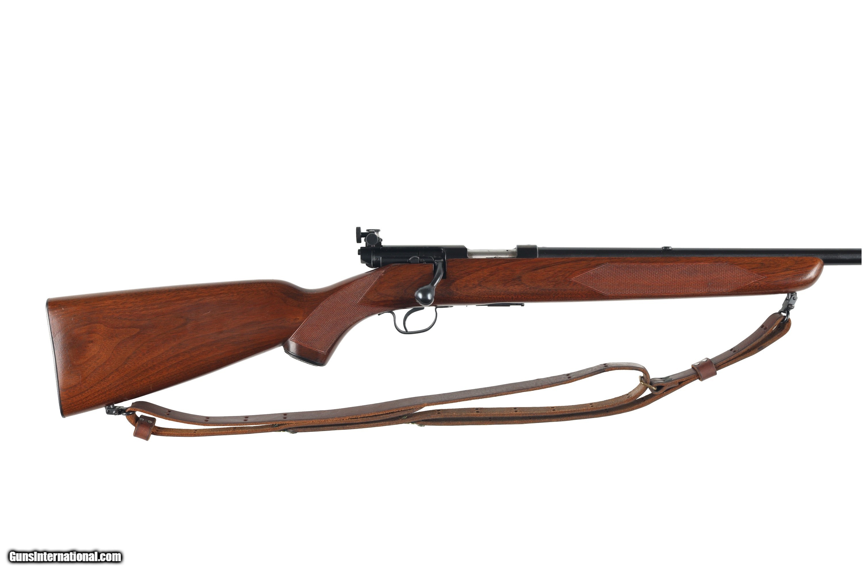 Description: The Winchester Model 43 is an interesting little bolt action rifle, only sold from 1949 to 1957 and chambered in what were then "intermediate" cartridges like the .218 Bee, .22 Hornet, .25-20 and .32-20, it fills a niche in small to medium game hunting that many rifles of the time didn't fill. This example is of a near mint condition Model 43 Deluxe, with a factory installed Lyman 57A target sight. Overall condition is immaculate, with only the lightest of cabinet marks on the stock and with what appears to be an unfired bore. SOLD Rifle Caliber: .22 Hornet Manufacturer: Winchester Model: 43 Barrel Length: 24 Caliber Info: .22 Hornet Condition: Vg Metal Condition: VG Wood Condition: VG Bore Condition: VG Action: Bolt Butt Pad: Factory LOP: 13 1/2 Finish: Original Weight: 6.7 Case: No |