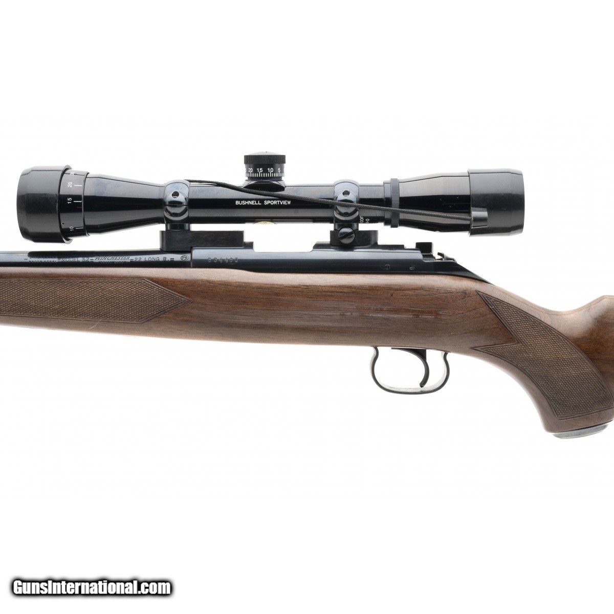 Description: " SN: BS4460. Modern Production. .22 Long Rifle with a 24"" barrel. Bore is excellent. Japanese made bolt action magazine fed rifle with 97% original blue finish, and wooden stock with checkered grips. Fitted with Bushnell scope. Overall condition is very good plus. Consignment. SOLD |
