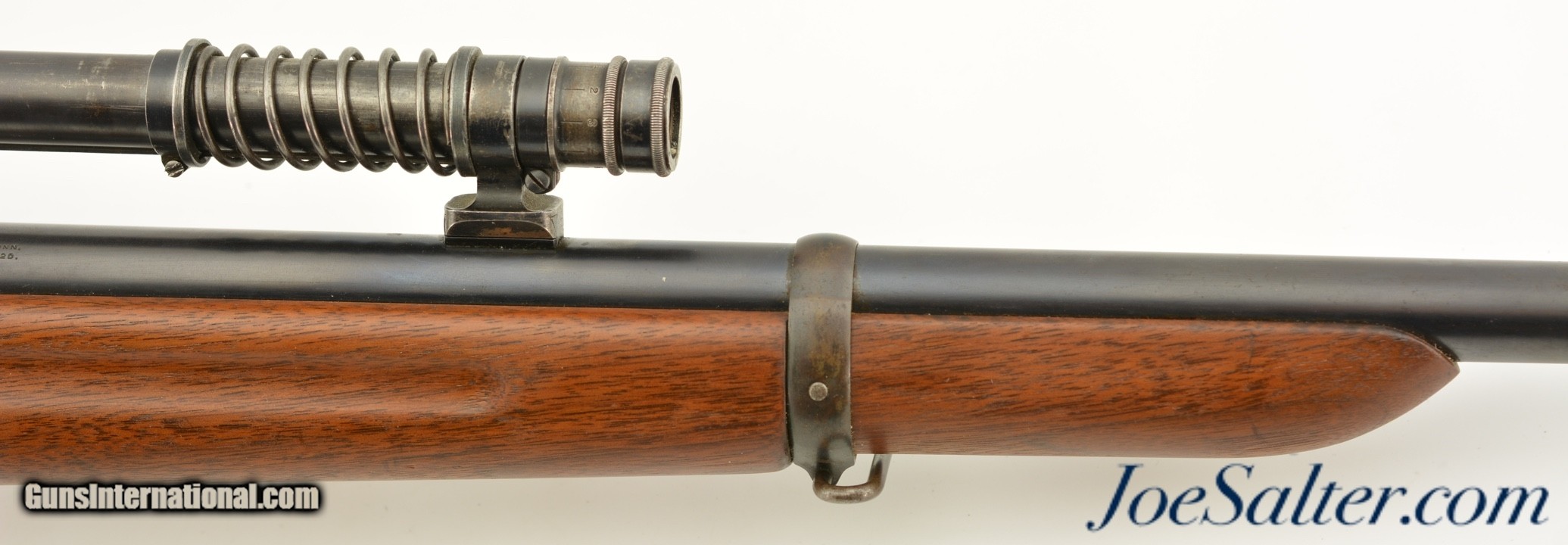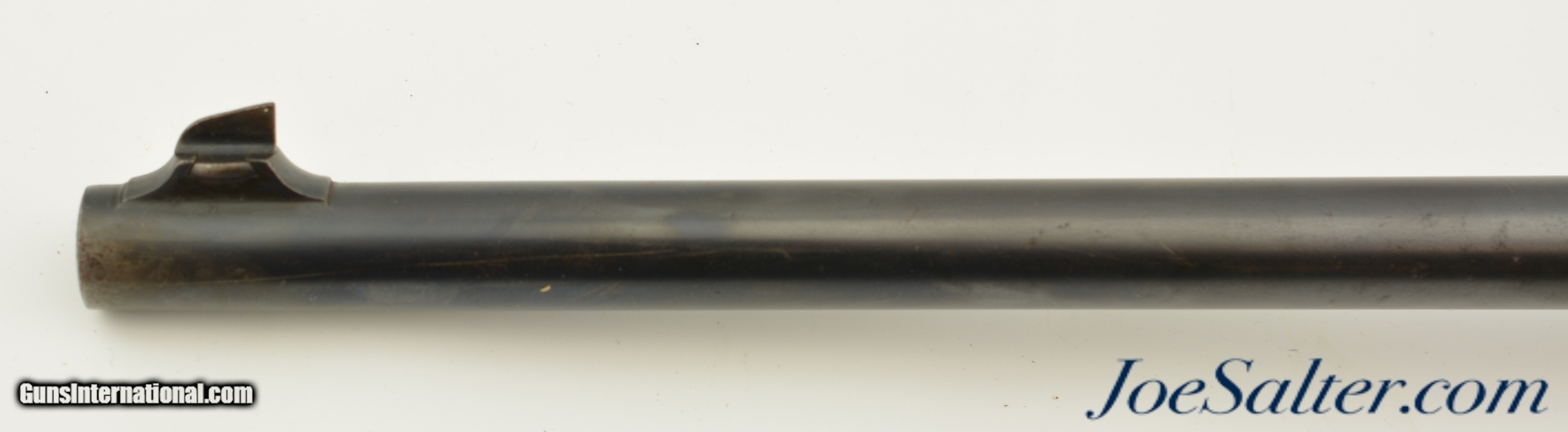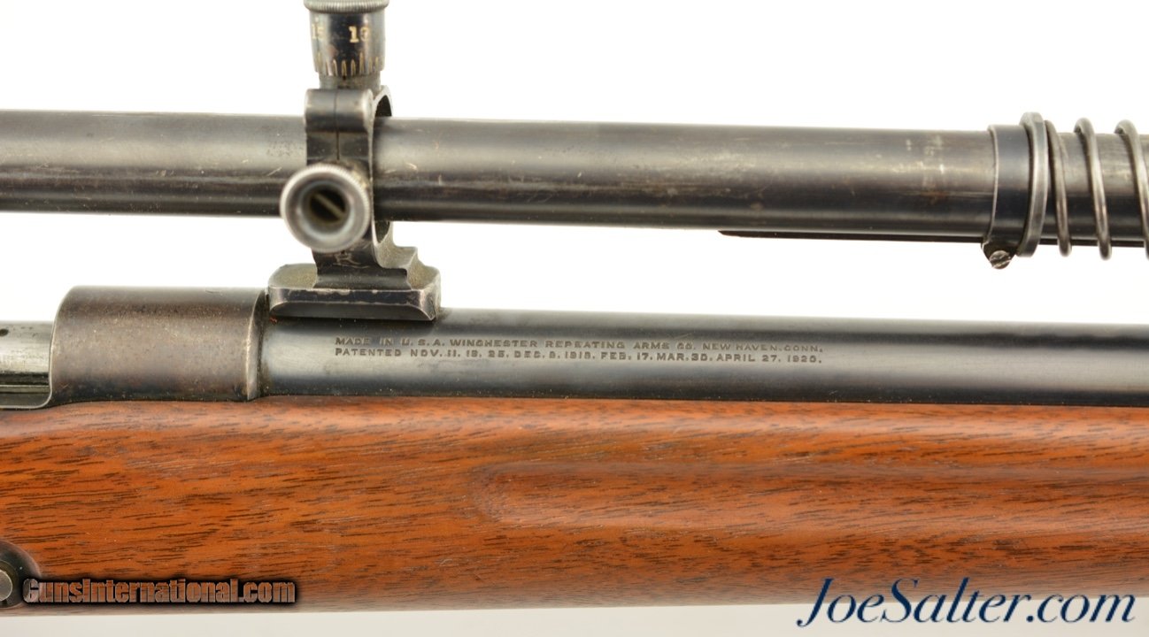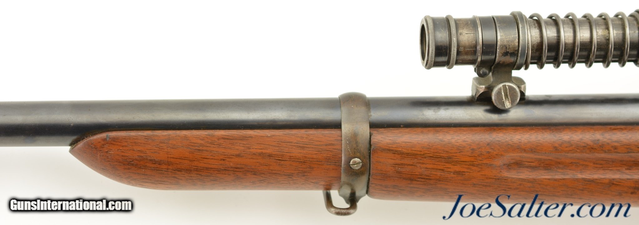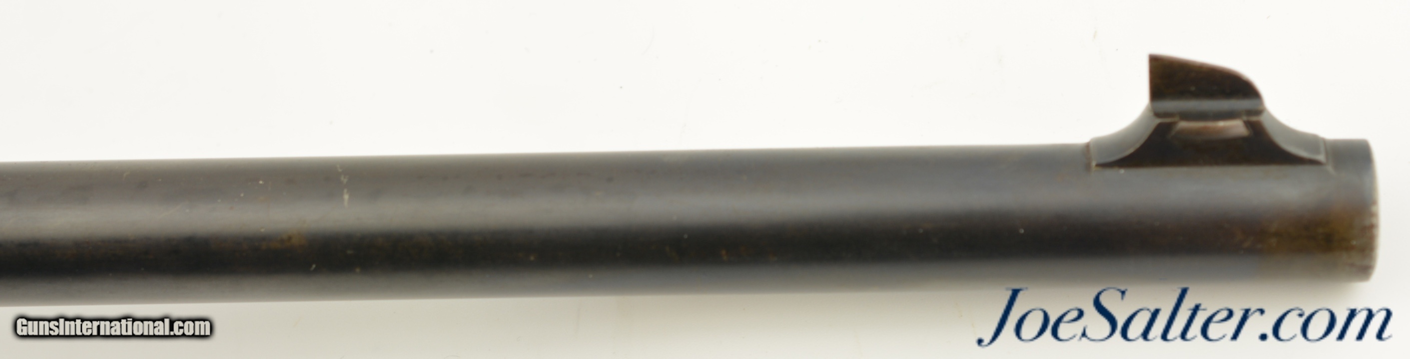Description: Serial #493, .22 LR, 28" barrel with an excellent, bright bore. This rifle was made in 1921 and retains 80-85% of the original blue finish, with flaking to underlying mottled brown on the exposed portions of the receiver. Further wear to gray is present on the bolt body and handle, and the original target rear and blade front sights are still present. A Lyman 5A scope with good optics and an intact crosshair reticle is installed on the scope blocks. The walnut stock has been nicely refinished to fine shape with only minor handling marks and small surface blemishes scattered about the refreshed oil finish. A single magazine is included. This is a very nice, early production Model 52, and is in very good-near fine condition overall. FFL or C&R SOLD |