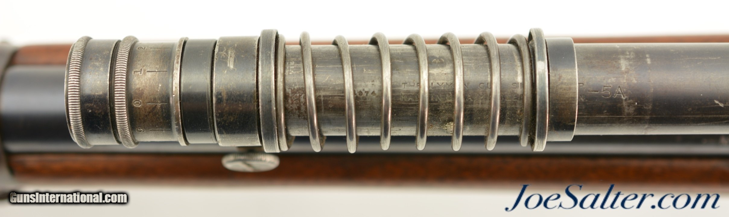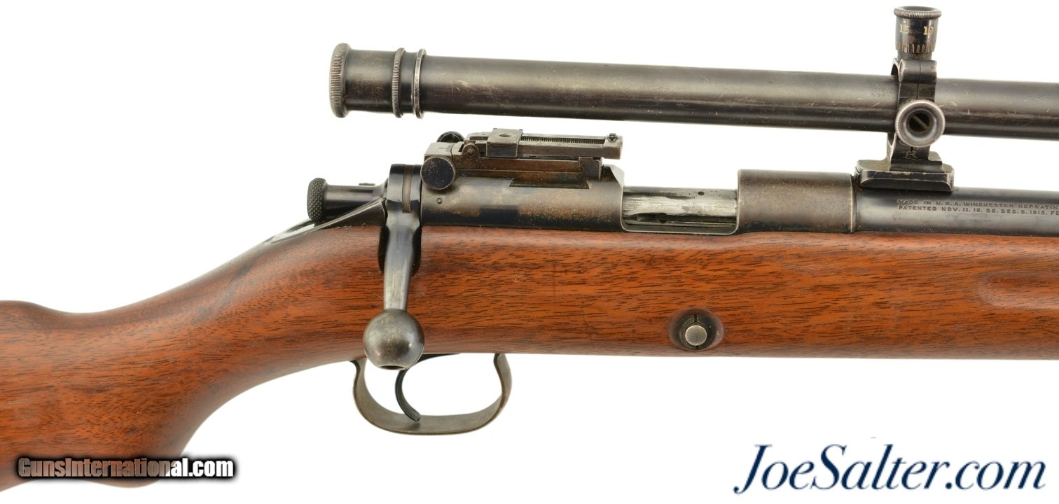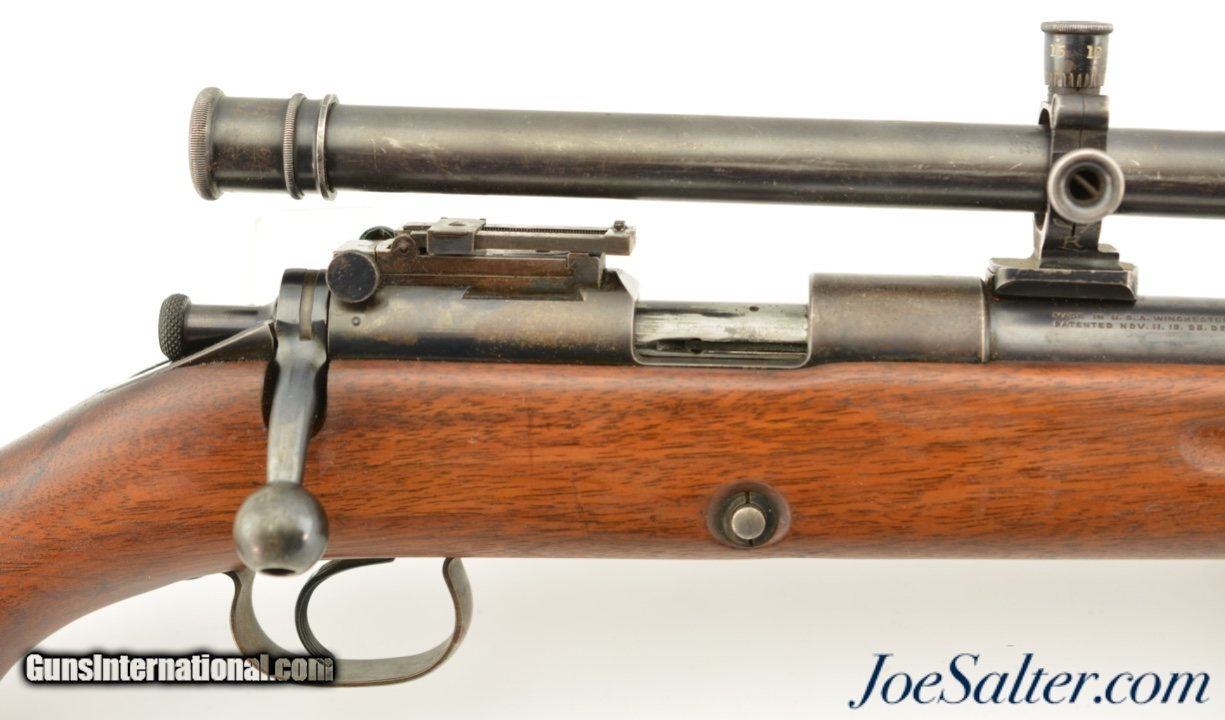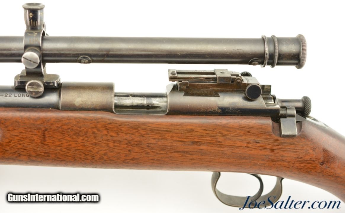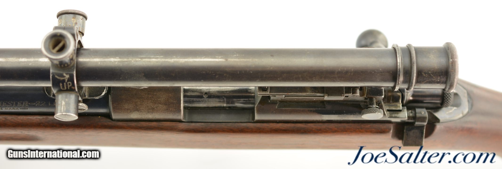 Description: Serial #493, .22 LR, 28" barrel with an excellent, bright bore. This rifle was made in 1921 and retains 80-85% of the original blue finish, with flaking to underlying mottled brown on the exposed portions of the receiver. Further wear to gray is present on the bolt body and handle, and the original target rear and blade front sights are still present. A Lyman 5A scope with good optics and an intact crosshair reticle is installed on the scope blocks. The walnut stock has been nicely refinished to fine shape with only minor handling marks and small surface blemishes scattered about the refreshed oil finish. A single magazine is included. This is a very nice, early production Model 52, and is in very good-near fine condition overall. FFL or C&R SOLD |