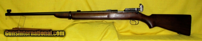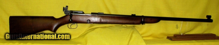 Description: WINCHESTER (180) model 52 (PRE WAR) in .22 CAL., with 28" barrel. Color BLUE. THIS MODEL 52 IS IN EXC. OVERALL CONDITION RETAINING 95% PLUS FACTORY ORIGINAL BLUE WITH EXC. SMOOTH WALNUT STOCK THE ONLY FINISH LOSS IS ON THE BARREL BAND AND TRIGGER ASSEMBLY. A MARBLES MICROMETER REAR PEEP AND REPLACABLE INCERT FRONT SIGHTS ARE INSTALLED. Condition 95% PLUS. Serial number 39353. SOLD |