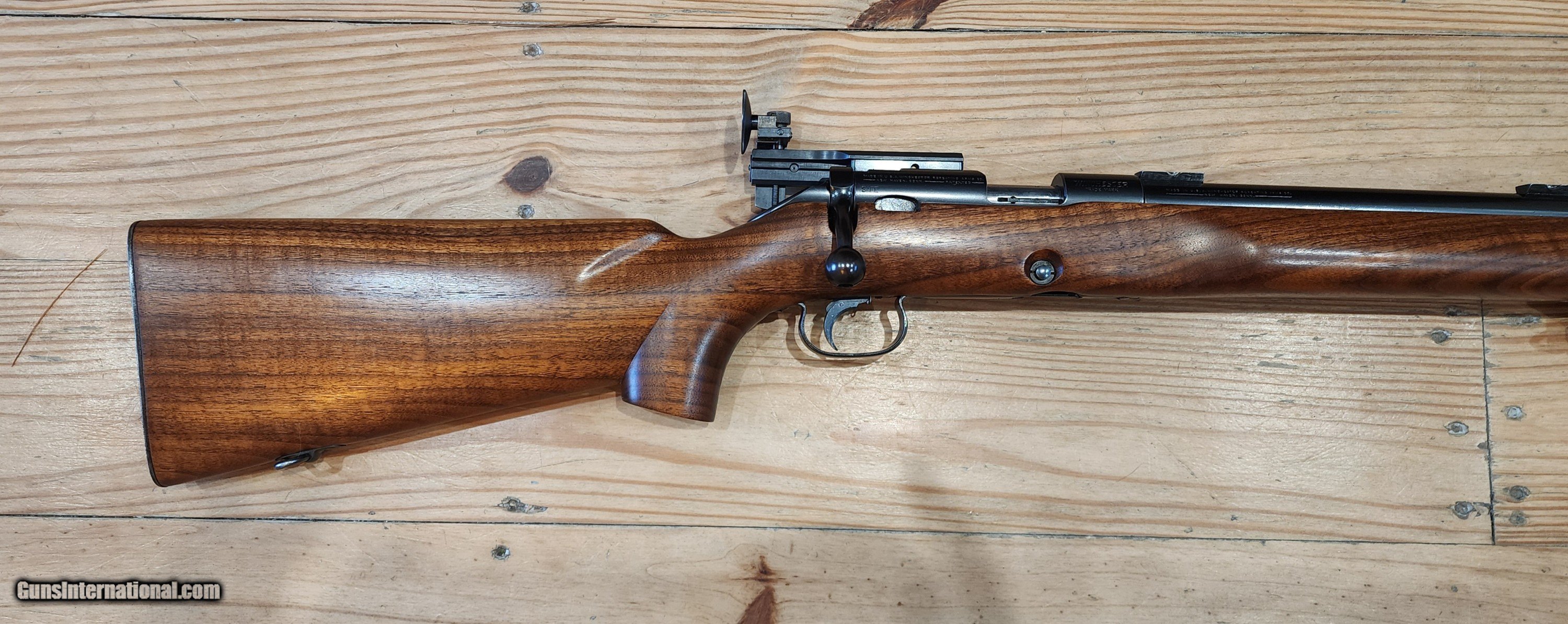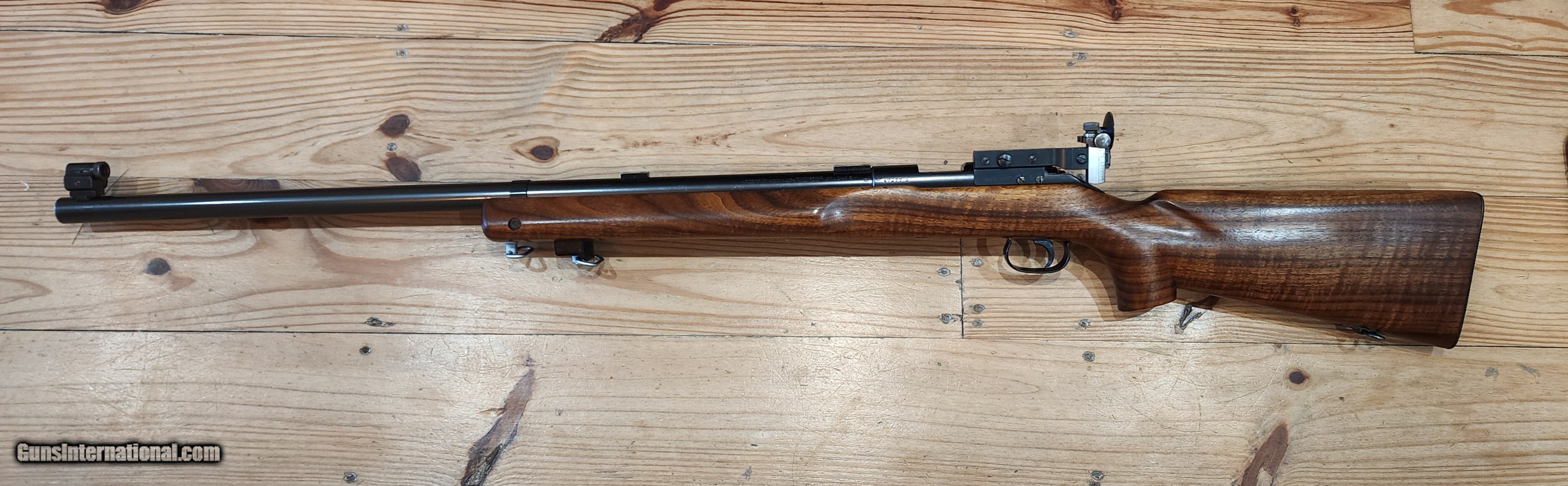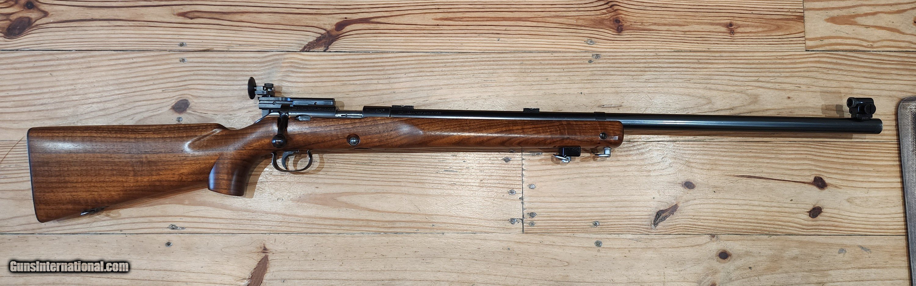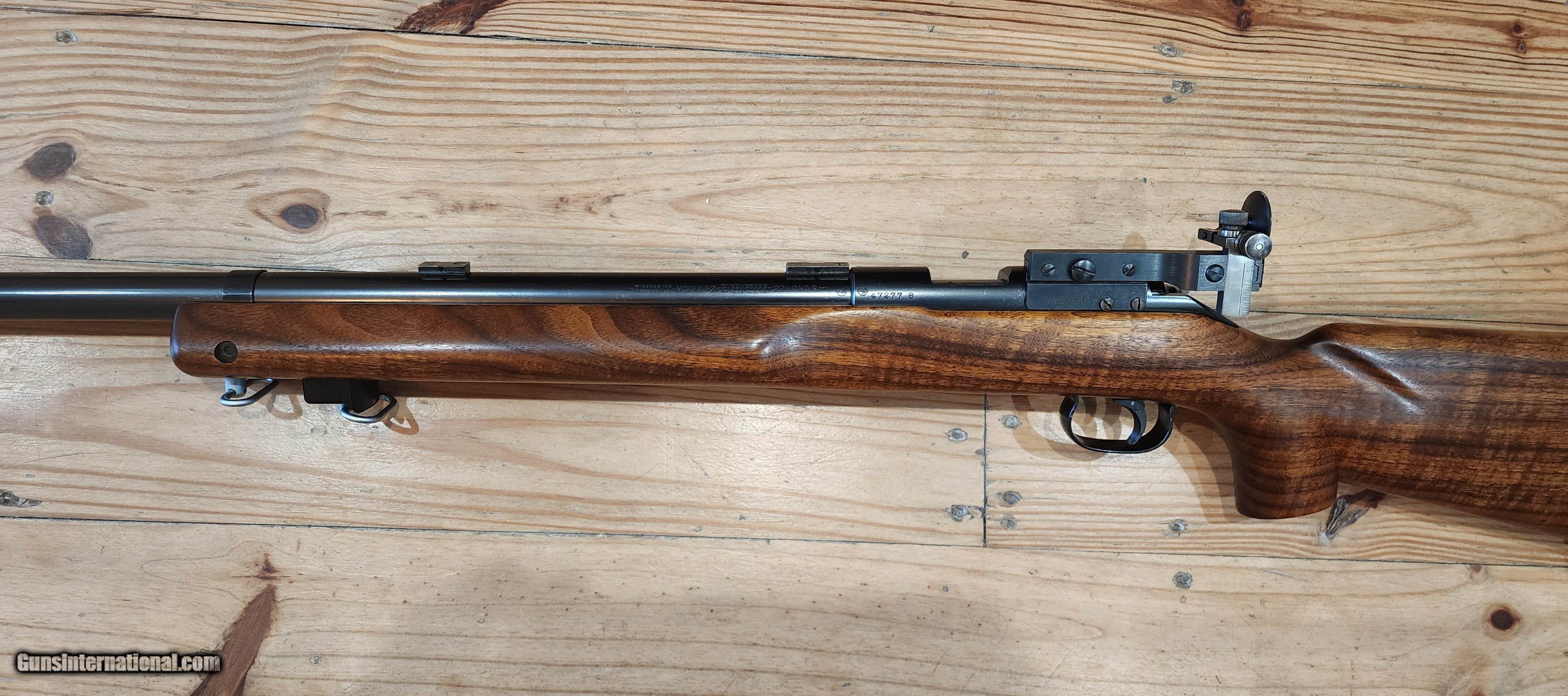 Description: Another absolutely breathtaking Winchester 52B heavy barrel with original Marksman stock made in 1937 from my collection. Original blue is 99%. Stock appears to have all orginal varnish remaining, but might have been refinished. Look at that wood! Comes complete as shown with correct Marble Goss irons, barrel blocks and an amazing rare Canjar 2oz trigger!!! Everything functions as it should. Bolt matches the gun. Gun is spotless! Not included in pictures is an orginal leather sling! You won't be disappointed with this. Bore is mint, excellent crown as well. It is clean and ready to go to it's new caretaker. Correct patent date 5 round magazine is included. More pictures avail to serious buyers. Feel free to call with questions or offers Monday-Sunday 9am-9pm EST More pictures available to serious buyers. Thank you for looking. SOLD Curio/Relic: Yes Rifle Caliber: .22 Long Rifle Manufacturer: Winchester Model: 52 Bore: Excellent Condition: Mint Metal Condition: Excellent Wood Condition: Excellent |
