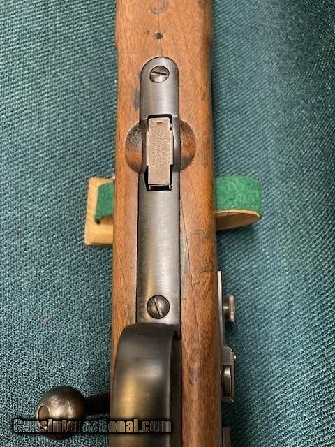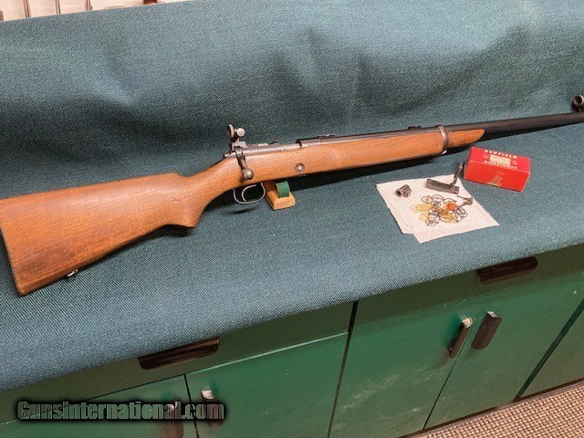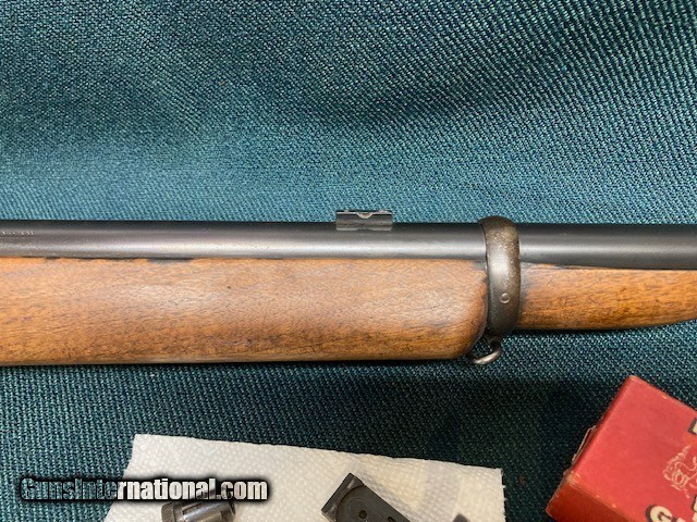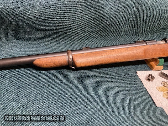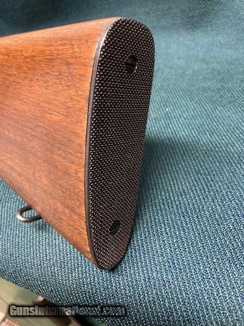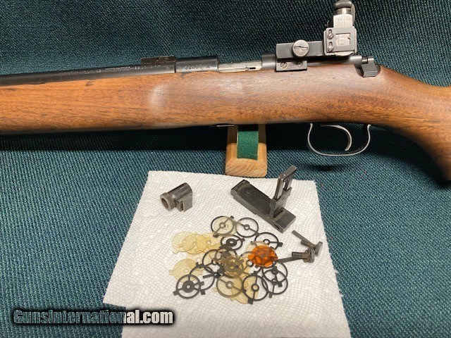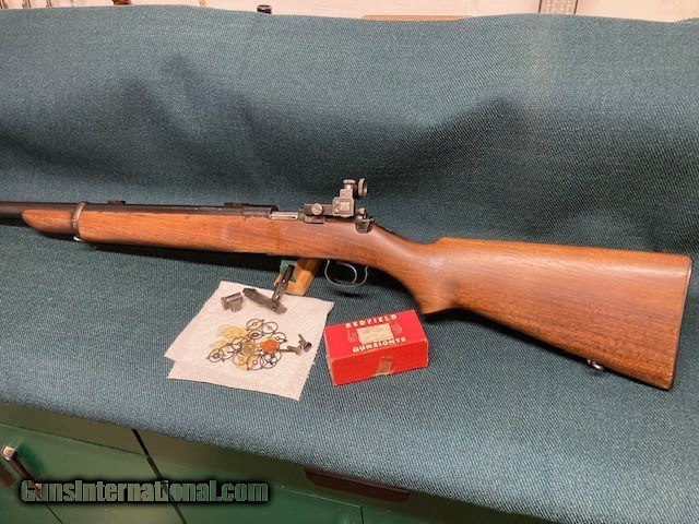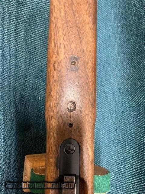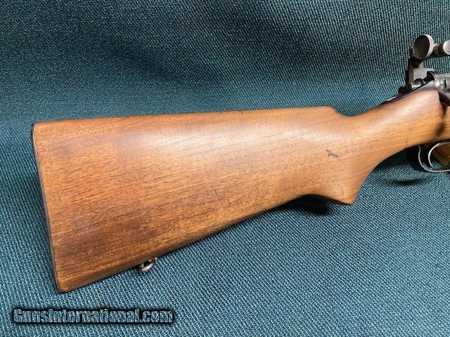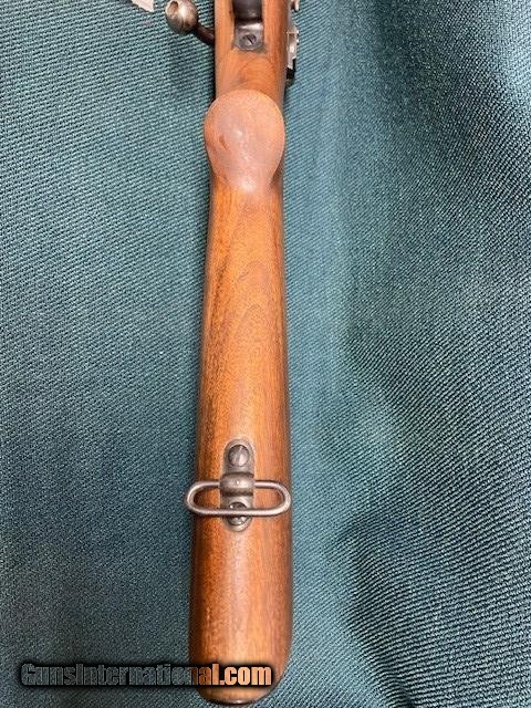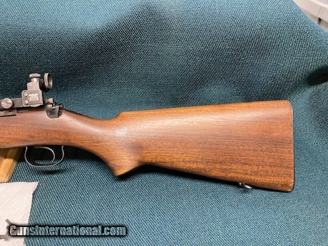 Description: **REDUCED PRICE** 1938 Production Model 52A. All original. Wood 90% with a couple small screw holes on bottom from a palm rest (see [pic). Small crack by rear screw hole in front of bottom metal. Also a fine crack alongside of bottom metal. Good blueing 90%+. Speedlock trigger. Equipped with Redfield International sights and also has originals. 28" barrel with good bore. A classic 52 with lots of life left. Shipping $75.00(lower 48) to your FFL. NO CA Sales. SOLD |