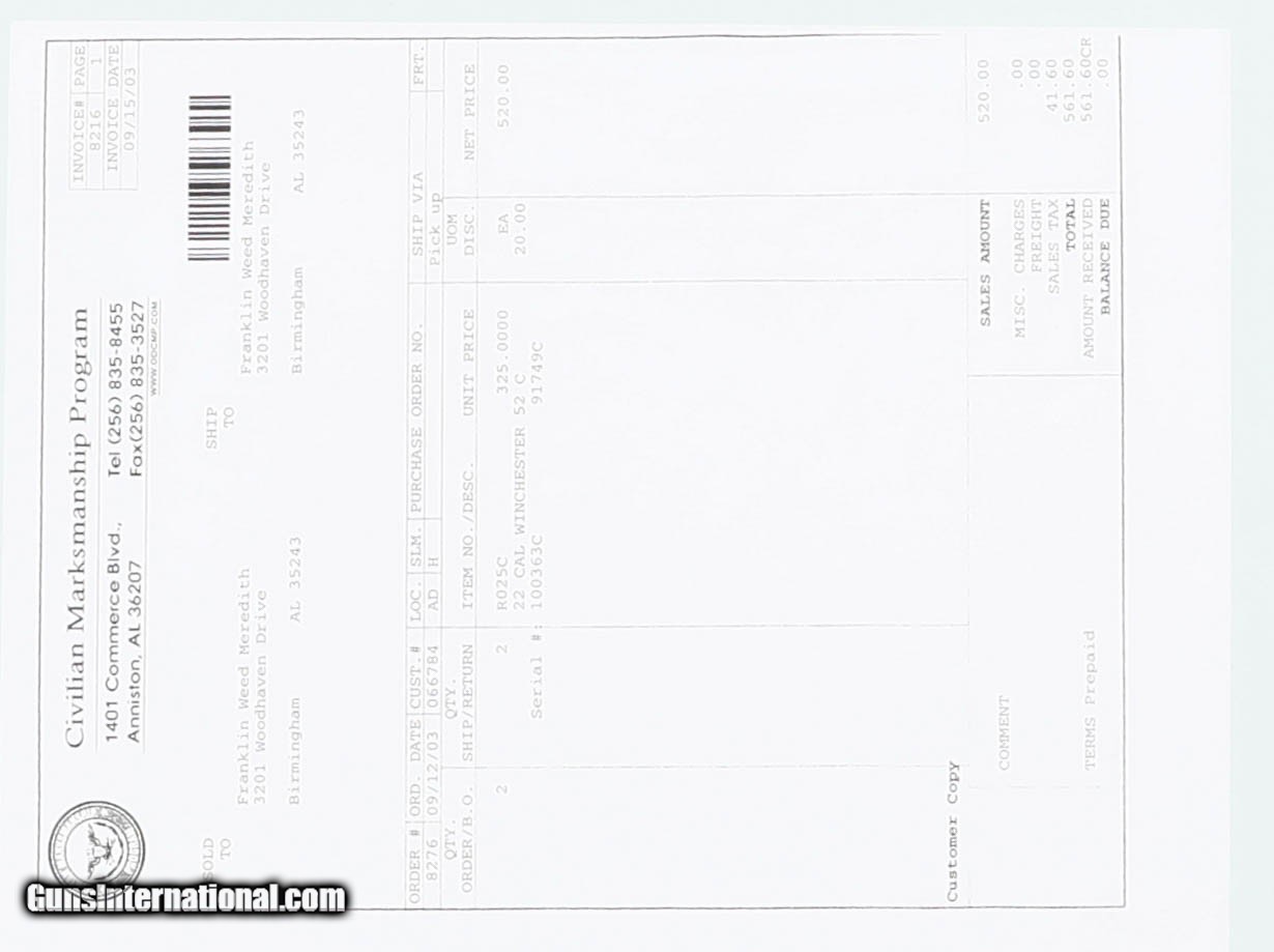 SOLD Curio/Relic: Yes Rifle Caliber: .22 Long Rifle Manufacturer: WINCHESTER Model: 52C Serial Number: 9174?? Barrel Length: 28 Condition: EXCELLENT |