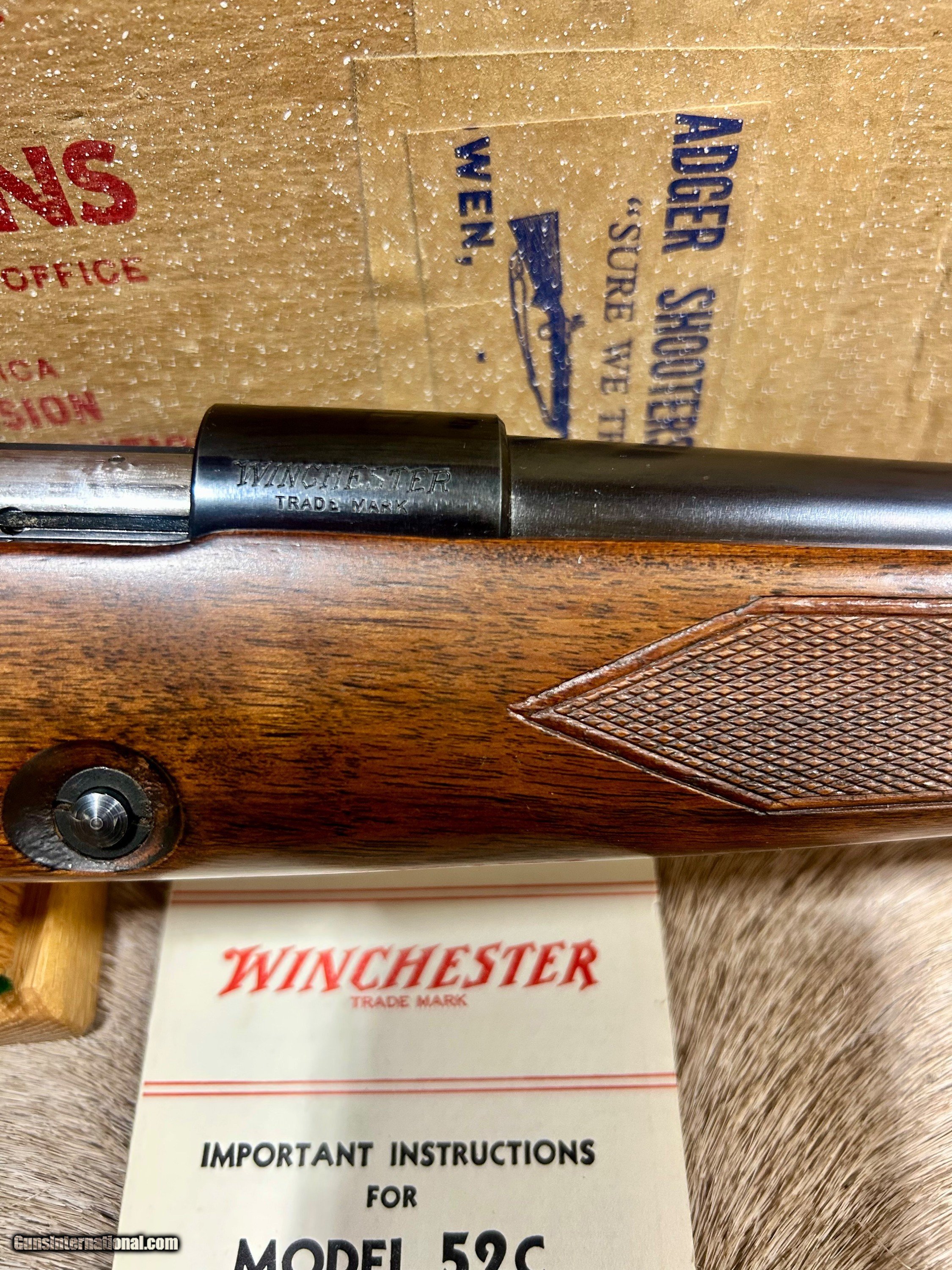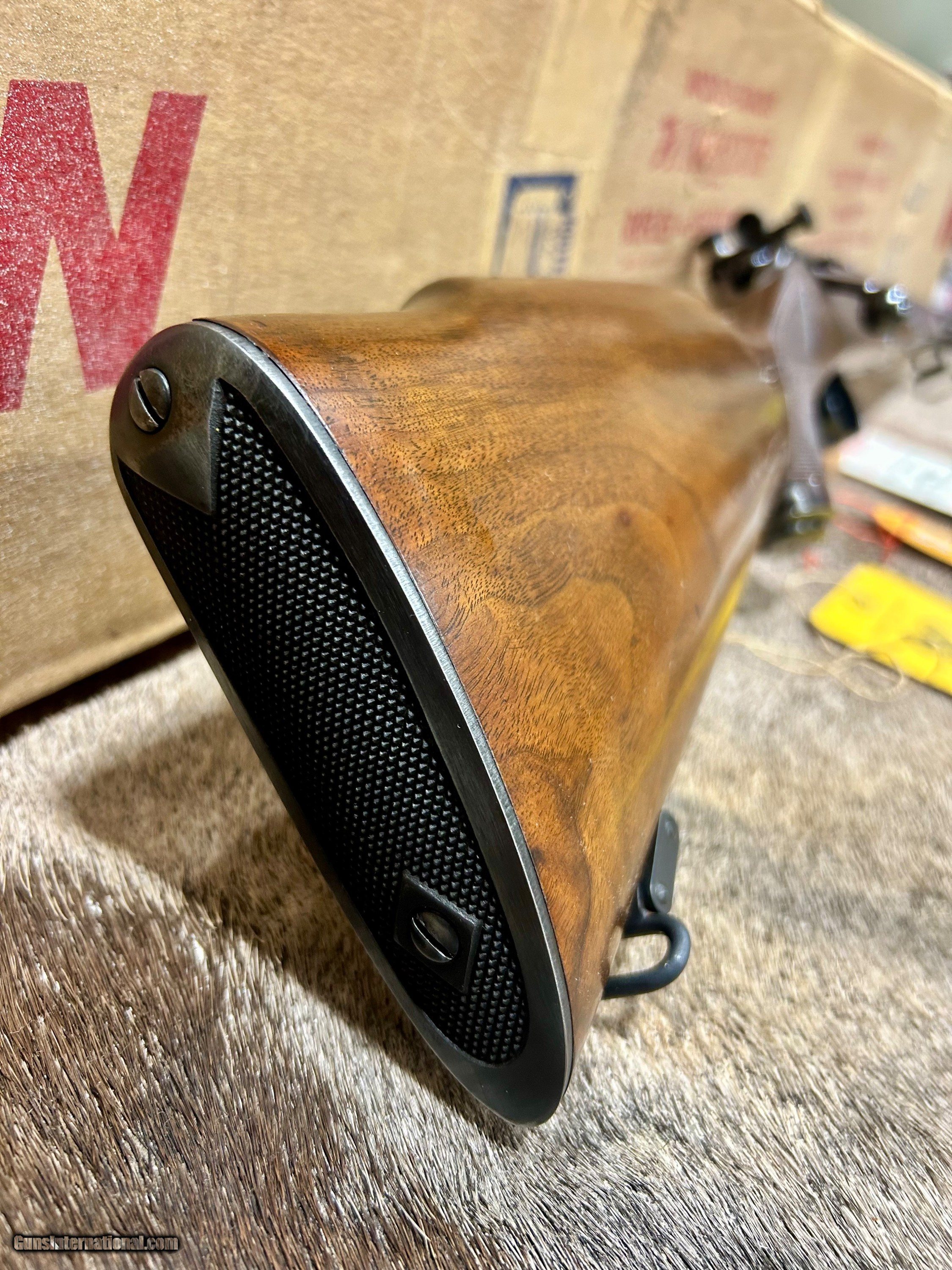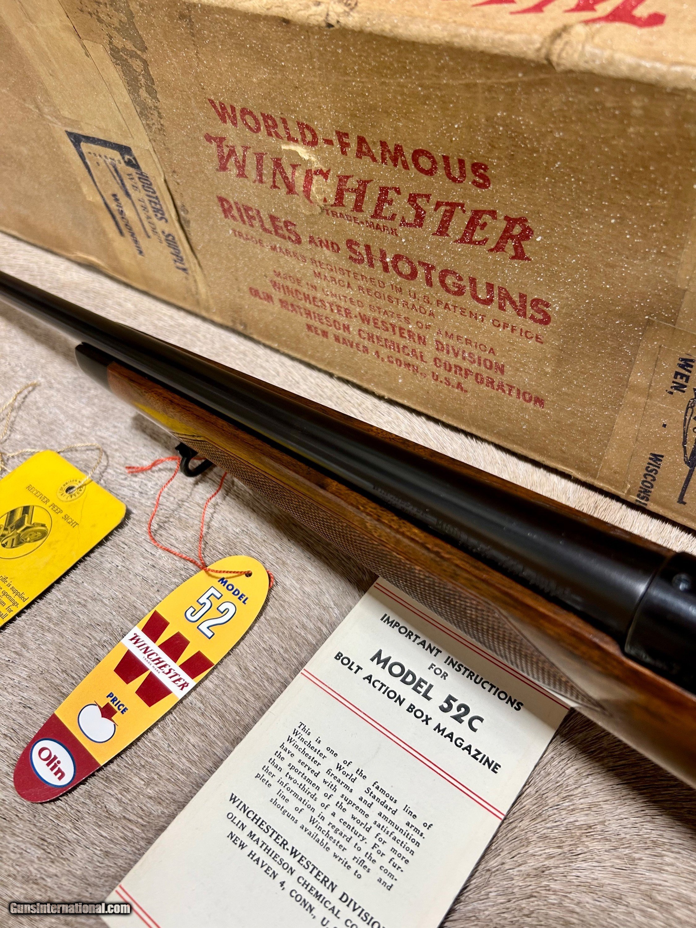Description: *****ON HOLD****Up for sale I have another unbelievable rifle. This one is a Winchester 52C sporter that is 100% NIB. This is the only one of these that I have ever seen come to market for sale that was NIB. This particular one was made in 1956 and it looks like it did the day it left the factory. Included with this gun is its ORIGINAL box,sling swivels, hang tags, manual, and string that was originally tied around the box when it left Winchester. It also has the dividers and wooden block inside at the end of the box. It has a reciever sight but it is NOT cut into the wood. You will never have another opportunity to own one of these NIB again so don't let this one get away. Shipping and ins will be $99 and to FFL or C and R only. Please don't hesitate to ask any questions or request anymore photos. SOLD |