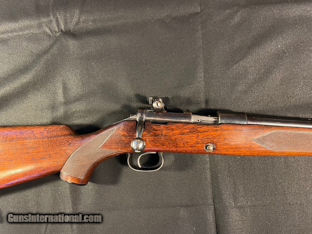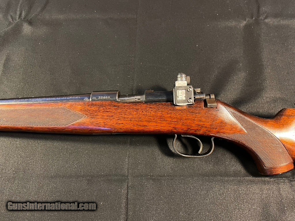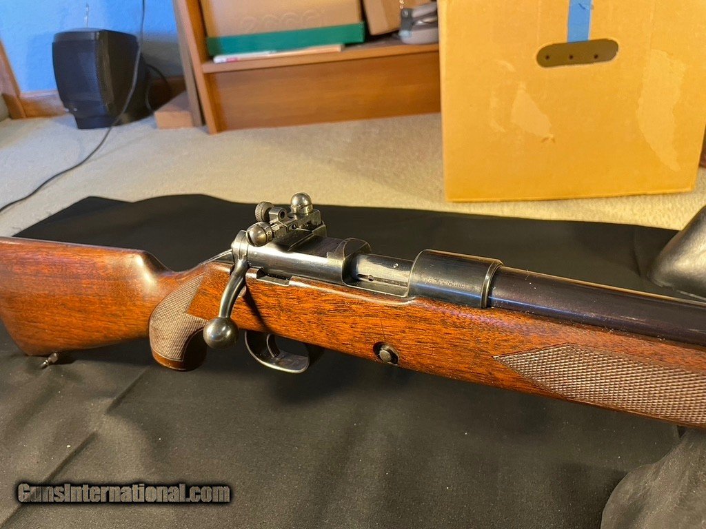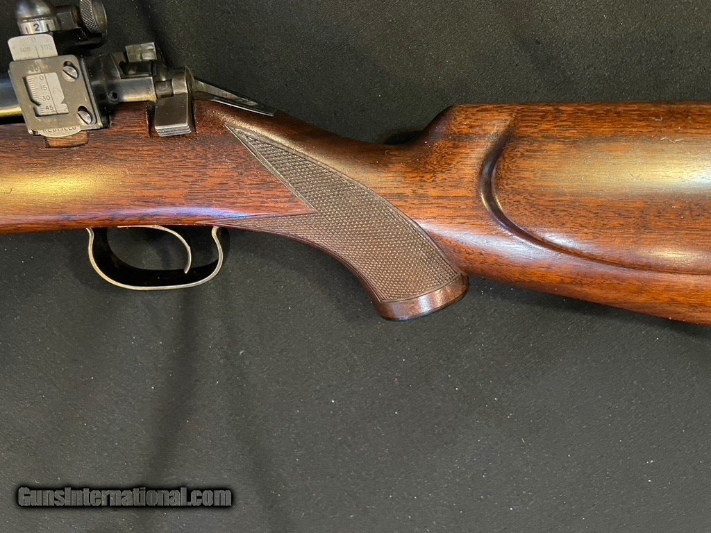 Description: The 52 Sporter is one of Winchesters two finest bolt actions with a first class design and fine construction (the other is the Model 70). The 52 has been called the King of the .22 rimfire. The Model 52 Pre A Sporter in question is very likely a conversion from a target model. It is in excellent shape because it was not used very much. I’m guessing that the gunsmith used a 1931 Model 52 Target receiver with Speedlock and converted it into a Sporter by replacing the barrel and stock with a Model 52B barrel stamped “41” and a 52B stock. So I estimate that this conversion must have taken place in the 1940s (again a guess on my part). He had to cut a notch on the stock’s left side for the 52 wing safety. Don’t worry about the balky wing safety, just leave the bolt open for safety. He did a very fine job refinishing it, even the stock which he hand rubbed with linseed oil leaving the original finish intact. The stock has quick disconnect swivels, but this one does not come with a leather strap. As can be seen from the photos the stock is in excellent shape with barely any small scratches or marks. The rifle bore is shiny and bright and the barrel is drilled and tapped for a scope mount. The rest of the rifle has 98% blue. The Sporter stock and barrel are no longer available so they alone are worth a lot. The trigger is as good as the day it was new. As in the target model the Sporter was made for accurate shooting. The rest of the gun including the receiver assembly has all the qualities and accuracy of the target model. I have not used this gun for many years. The absence of “SPORTING” stamp on the trigger guard may be another indicator of the conversion, but I’m not sure because it’s possible the Pre A Sporters did not come with that stamp. So here’s a gun you can buy at a reasonable price and use without being concerned about collector value. I’ve seen many 52s which owners claim to be original and near perfect, but are really refinished rifles. SOLD Curio/Relic: Yes Rifle Caliber: .22 Long Rifle Manufacturer: Winchester Model: 52 Sporter Serial Number: 22468 Barrel Length: 24 Condition: Excellent Metal Condition: Excellent Wood Condition: Excellent Bore Condition: Excellent Barrels: Sporter Barrel Barrel Type: Sporter Barrel Action: Bolt Action Triggers: Target Stock: Sporter Stock Fore End: Black Forend Tip Butt Pad: No Finish: Original Weight: 7.25 lb Sights: Peep Manufacture Date: 1931 Engraving: No |