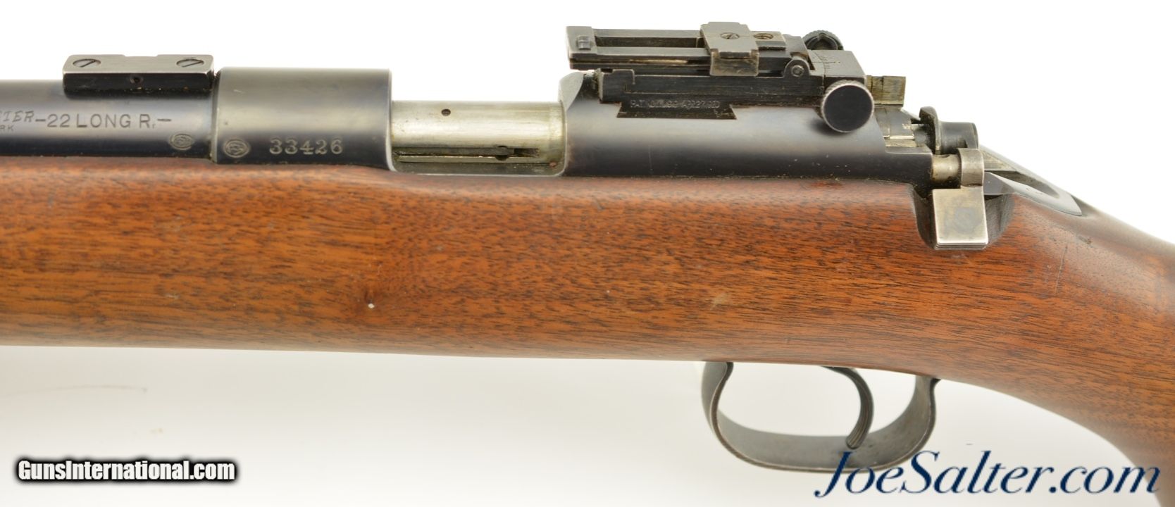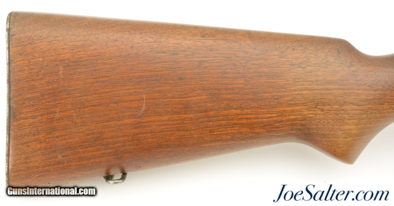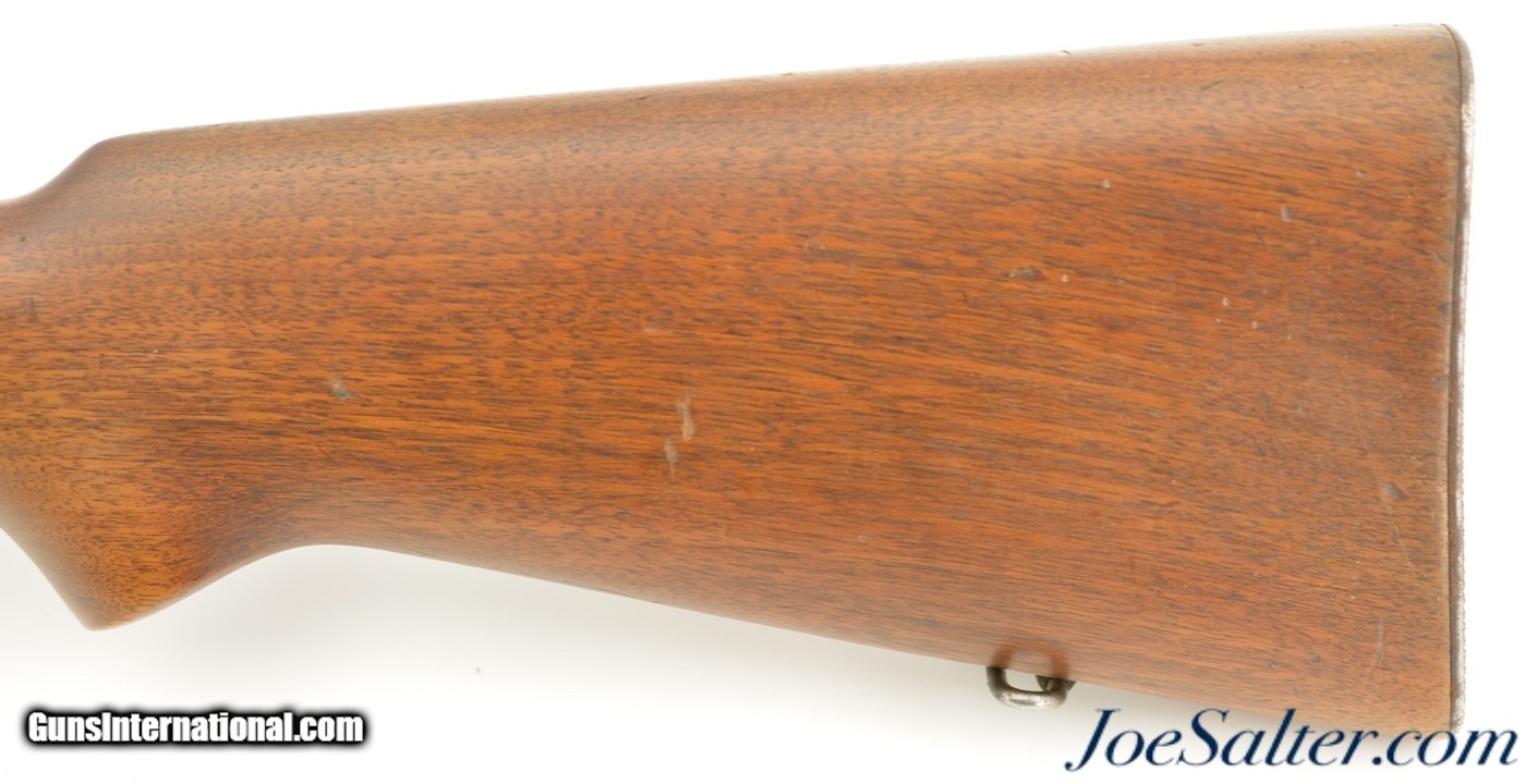 Description: Serial #33426, .22 LR, 28" barrel with an excellent, bright bore. This is a 1936-made, Speedlock-equipped rifle that has a matching numbered bolt. The metal retains about 92-95% of the original blue finish with mild silvering at the muzzle, as well as along the exposed edges and surfaces. Further gray fading is present on the bolt handle. The rifle is outfitted with a globe front sight and has the original rear flip-up target sight fitted, but the aperture is no longer present. Scope blocks are present on the barrel. The walnut stock is in fine shape, with only some minor handling marks scattered about the original oil finish, although there is some minor oxidation on the checkered steel buttplate. The rifle comes with a single original magazine, and is also fitted with a US Model 1907 leather sling with aftermarket "Keeper’s Keeper" spacer installed. This is a very nice Model 52, and is is in very good-near fine condition overall. FFL or C&R SOLD |