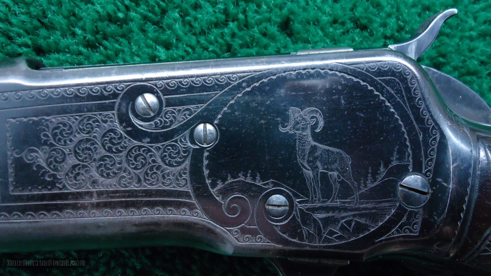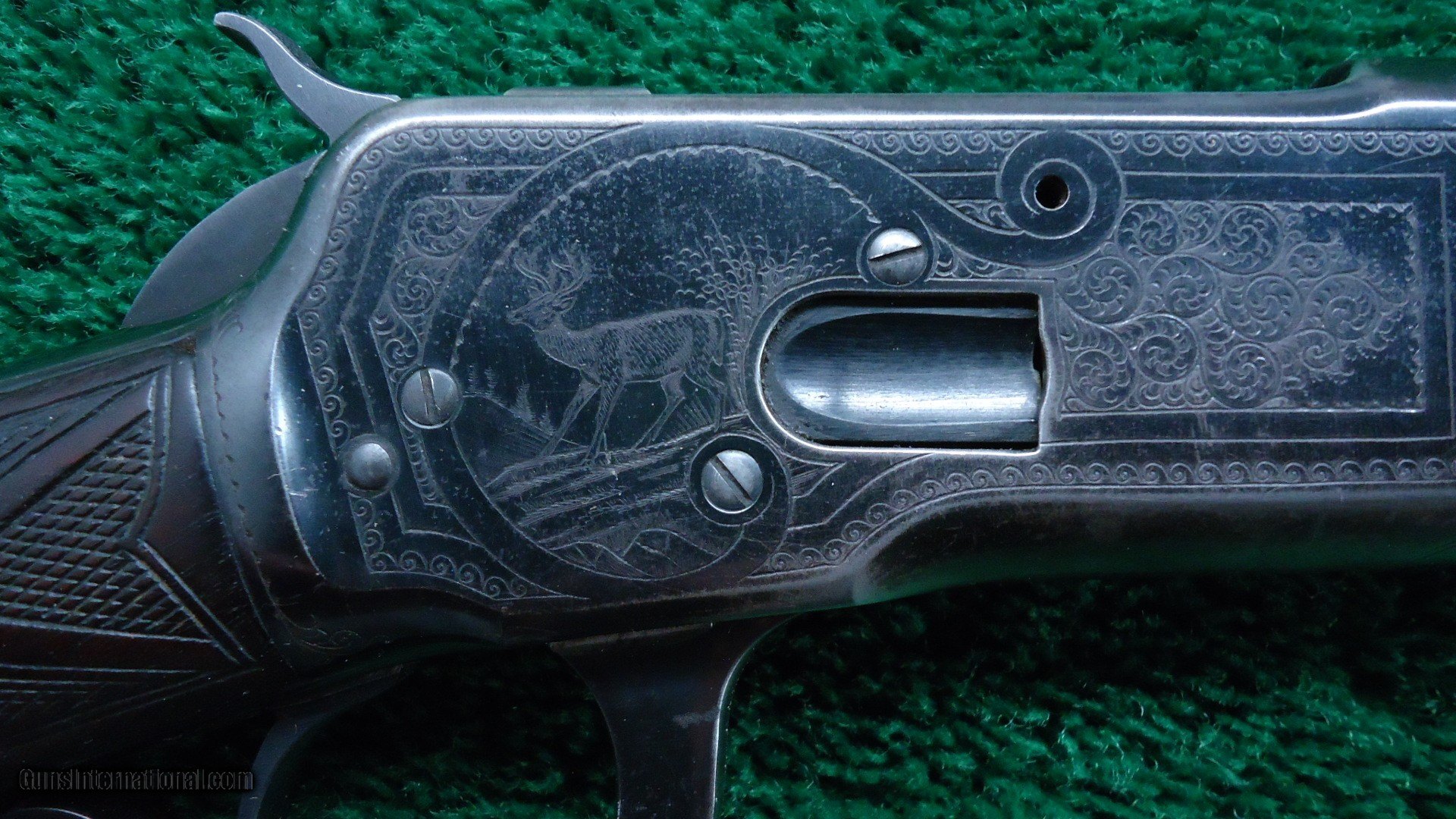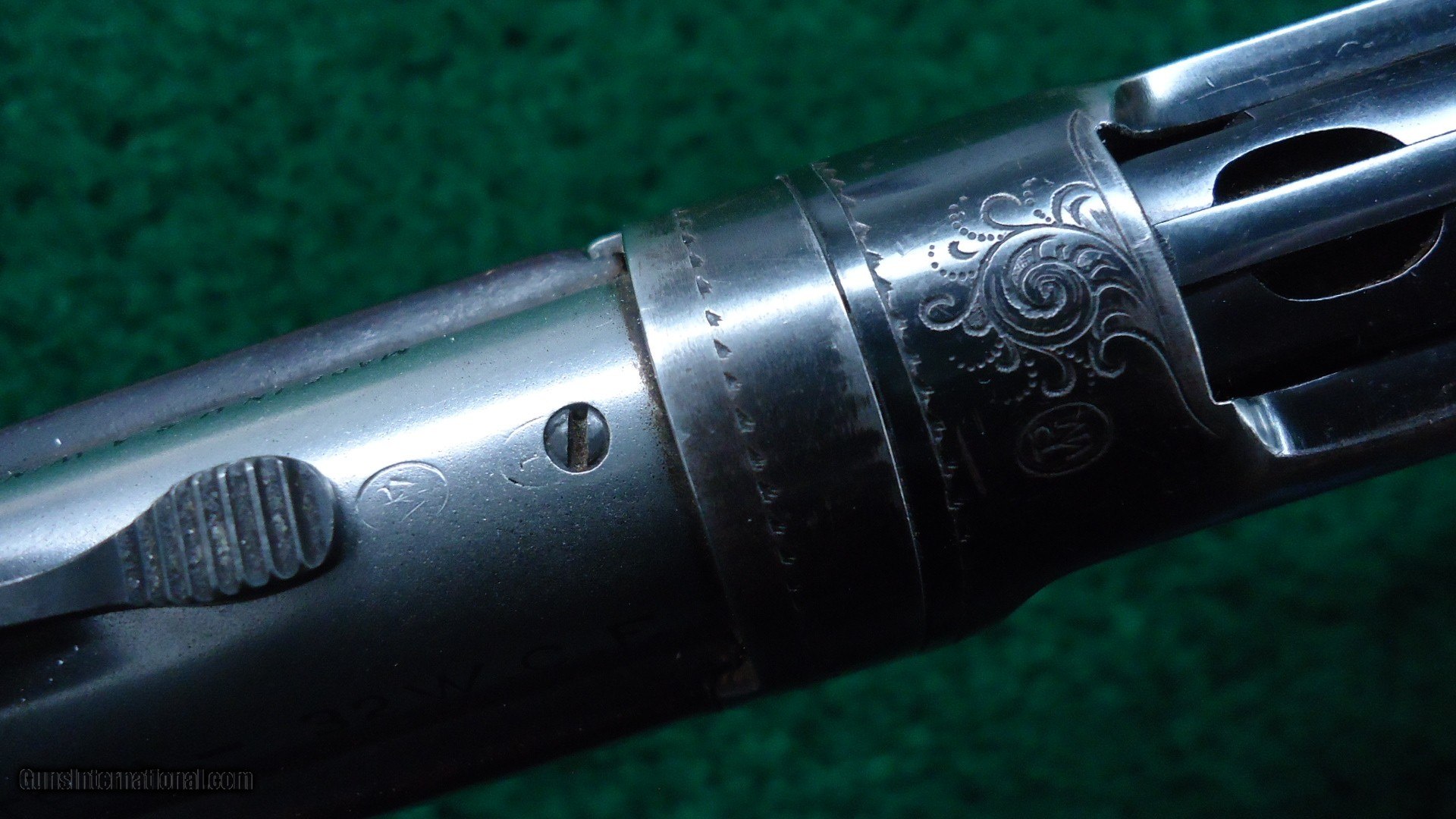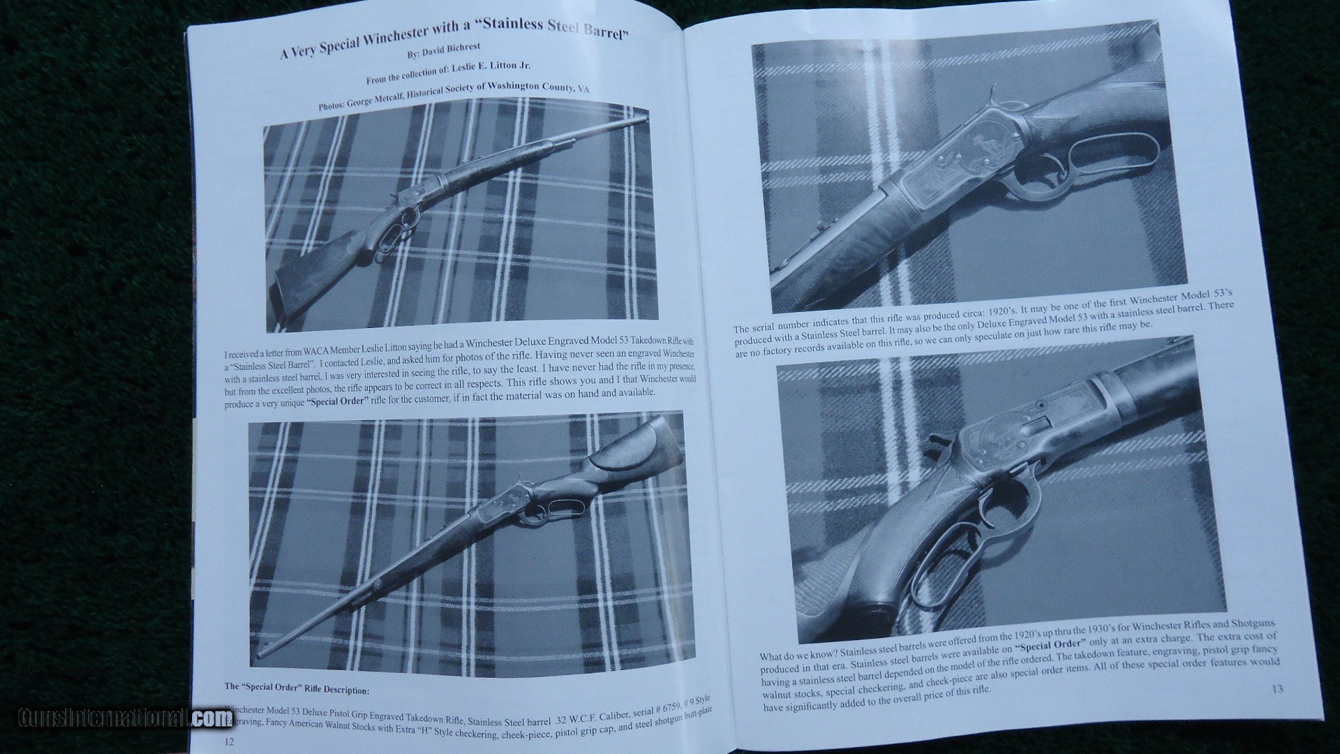 Description: This is the only 53 that I feel is Factory engraved. There are a few out there but I don't believe them to be correct. This one I feel is right. It features the #6 pattern Winchester engraving with the ram inside of an oval on one side. The other side has a buck deer standing in an oval. The takedown ring is engraved. This gun features an unusual scarce stainless steel barrel as well as deluxe checkered wood. It has a shotgun butt and a cheek piece. The buttstock is checkered in an unusual pattern that I have not seen before. I believe it to be original. Looks good. The 22 inch round stainless steel barrel has 4 tap screws for a scope. Original sights. The barrel has flaked most of the Japan finish. This is not uncommon. Receiver retains about 80% blue. A very interesting gun that is probably one of a kind. Comes complete with a lengthy article from the Winchester Collectors Magazine Fall 2010 that talks about it. Gun is also featured in the WACA calendar for 2011. A very nice little outfit. Leroy Merz Antique Firearms specializes in antique and vintage Winchesters and other fine American firearms. Since 1965 Mr. Merz has taken part in the world of firearms and has been a contributor to many well known reference books. We have hundreds of additional guns in every price range at our home online. Search for Merz Antiques in google. SOLD Curio/Relic: Yes |
