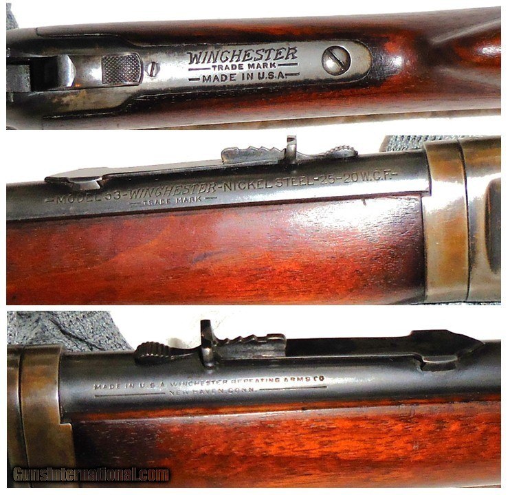Description: This Collector and Shooter’s Winchester Model 53 Takedown Rifle in 25-20/25 WCF Caliber Condition is in excellent condition for age with SN 74XX numbered in the separate Model 53 series making it a late 1920s (estimated) Date of Manufacture. Markings and Patent Dates are Correct and Sharp; the Straight-Grain Wood Stock and Forend are in Excellent Condition; and the entire rifle shows only minor to moderate wear after almost 100 years; and the bore is excellent with sharp rifling that was difficult to photograph. The Serrated Buttplate, Magazine & Forend Caps, and metal have some remaining Blue with mostly Smooth Patina. Mechanical functions are tight and secure. This Original Winchester is a better buy than any similarly-priced modern replica – plus, this one is a Takedown. Please refer to the photos and ask any questions or request additional information before purchase as this item will be costly to return owing to CA re-registration and other regulations. Any refunds will be minus our actual shipping cost and FFL fees after buyer pays return shipping. The listed price Includes Insured Ground Shipping from a CA FFL Dealer to yours. Payment is by Money Order, Bank (Certified) Check or Personal Check (held 2-3 days). We are not a dealer, and cannot handle credit card or electronic payments. This item is subject to prior sale. SOLD Rifle Caliber: .25-20 Winchester Manufacturer: Winchester Model: Model 53 Takedown Serial Number: 74xx Barrel Length: 22 Inches |
