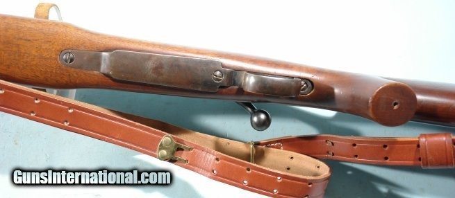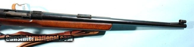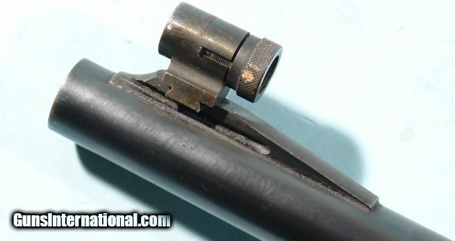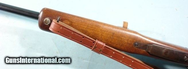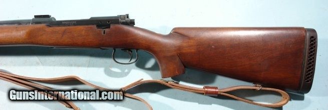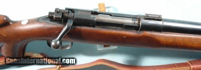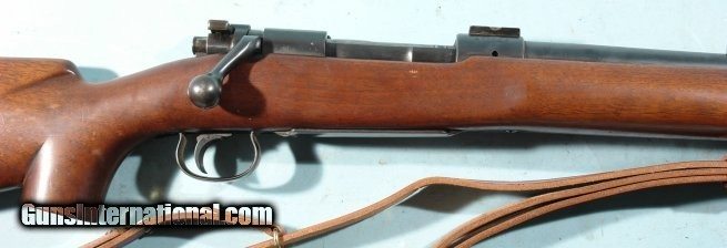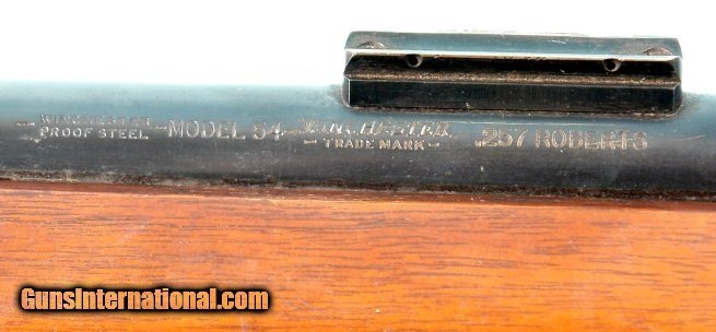 Description: 1936 WINCHESTER MODEL 54 HEAVY TARGET .257 ROBERTS BOLT ACTION RIFLE. Serial number "4777X-A". Factory original blue with crisp barrel markings. 24" bull barrel with correct bases for a Fecker 16X Champion that was on it(sold it separately). Still has factory front globe(with insert) that would have complimented a Lyman 48A if it has not been removed to accommodate scope. Slot cut in wood for rear adjustable sight excellent as are the tap holes which are factory. Correct matching bolt with same number on bolt body. Adjustable trigger with shoe added(removable). Overall factory blue is at 90% with balance on floorplate. Steel checkered buttplate removed to accommodate rubber vent pad to increase length of pull which without pad is 13 1/4"(from front of trigger shoe). Stock is the factory original target config with original finish. Period ivory round escutcheon panel on top of wrist. Factory sling swivels. Extra hole drilled in forend with bolt and washers(possible addition of weight) and small hole in pistol grip cap. Wrist has slight hairline extending from lower tang on both sides(no more than 2" and go nowhere). Old dried grease in recesses so NO rust or pitting anywhere. Classic pre-war target rifle the last year they were made in numbers and predecessor to Model 70. With later leather sling. SOLD Curio/Relic: Yes Rifle Caliber: .257 Roberts |