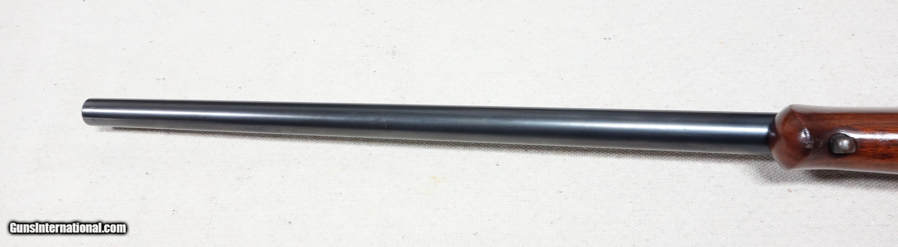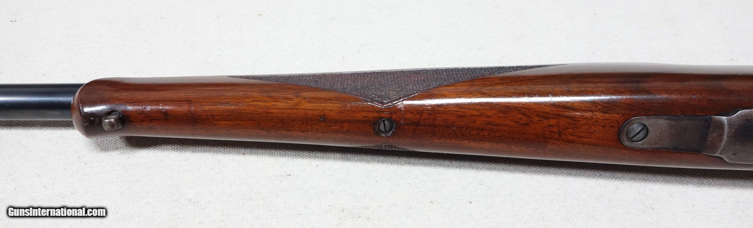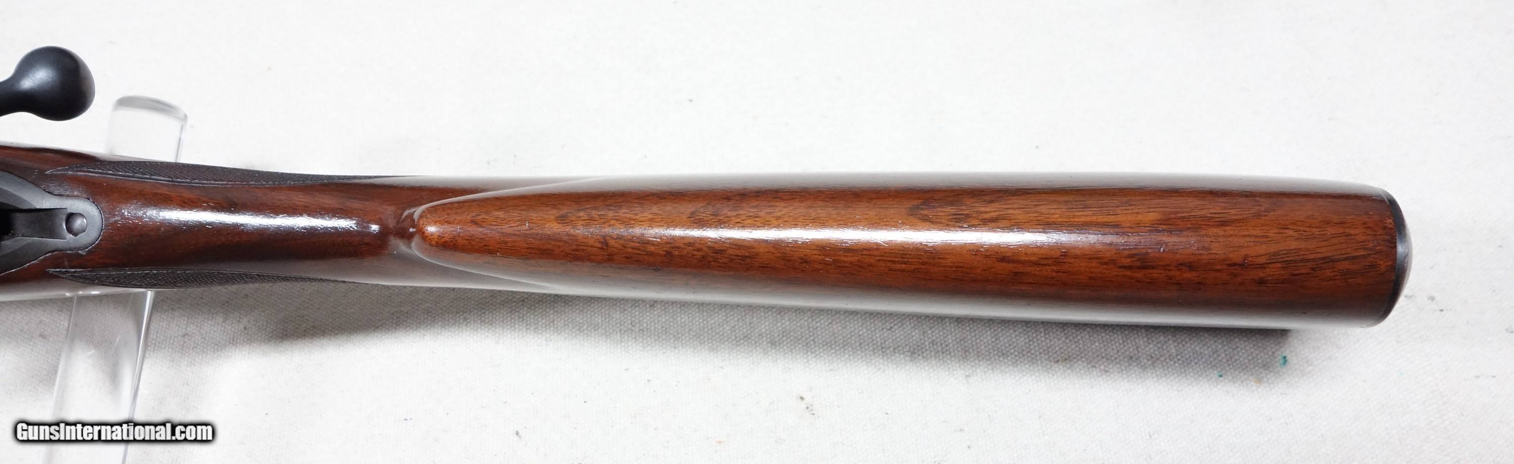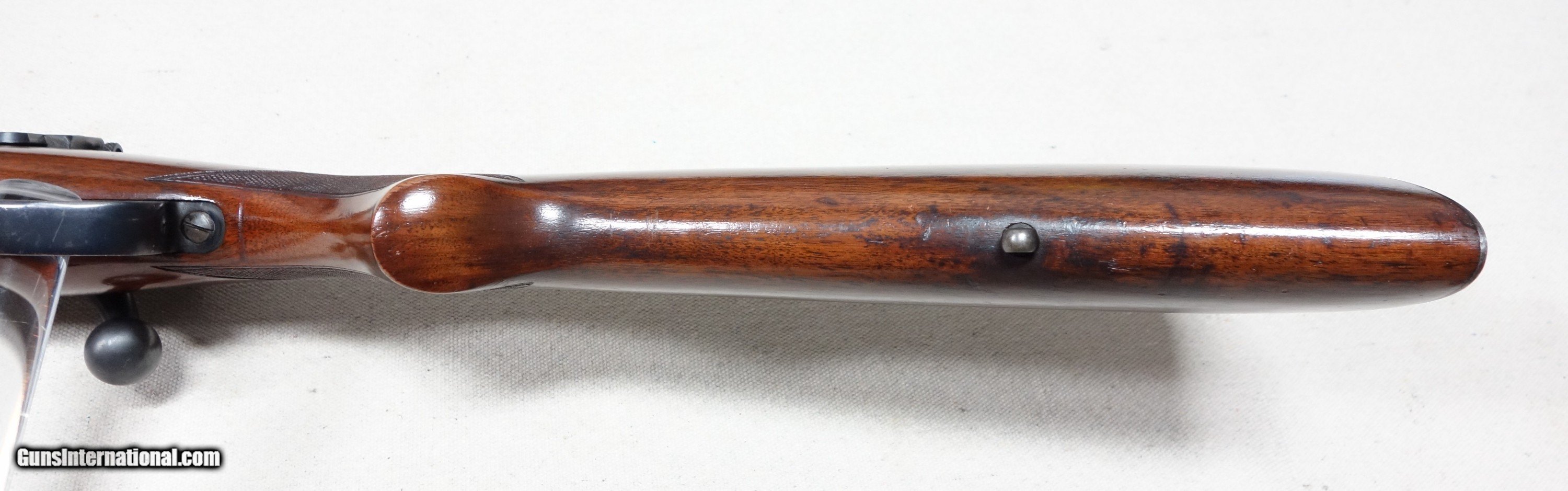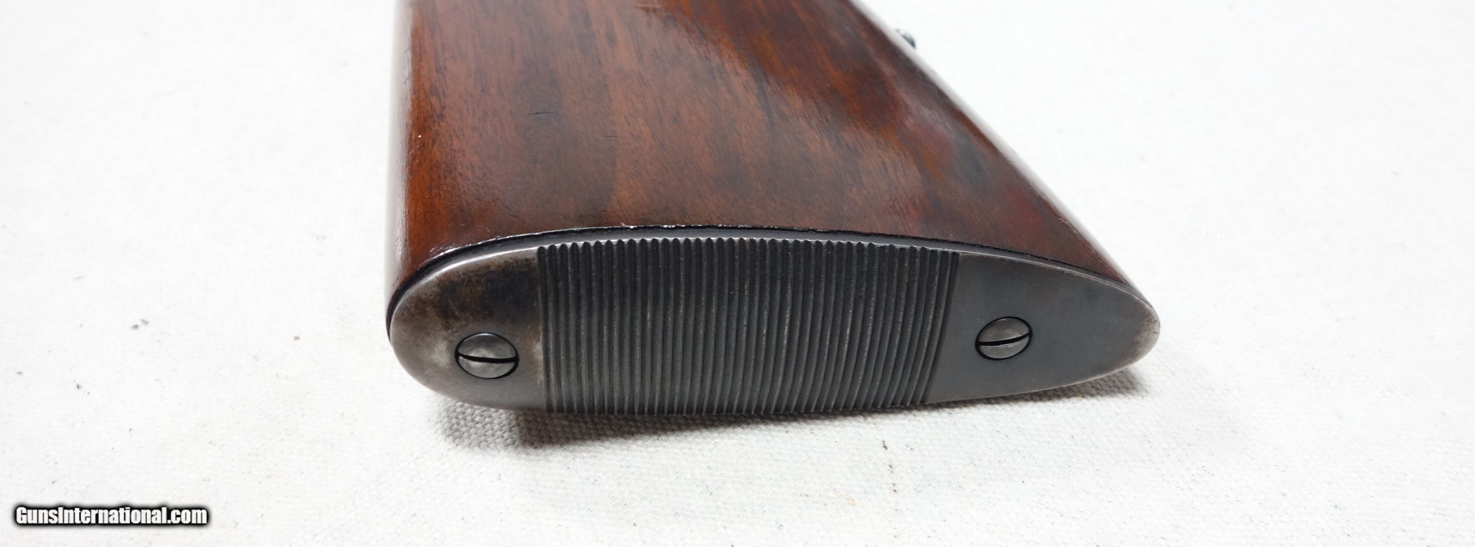 Description: Famed forerunner to the model 70, this is a Winchester Model 54 in 30-06 caliber. Completely unaltered and in excellent condition for this model. Very early S/N 7733 with matching scribed bolt made during the 2nd year of production 1926. This was the first of the 2 standard rifle styles with its slender schnabel tipped stock and integral post front sight. The barreled action shows strong and bright original blue approaching 95%, with areas of light surface frosting. The bottom metal is among the best I've seen on this model, completely original and without the typical flaking and browning so often seen. The buttplate has flaked to a silvery grey patina. The original wood finish is also very nice with only scattered light handling marks and rubs. The barrel channel is clean with no bedding, routing, or other issues. The rear receiver bridge remains UNDRILLED. All components are original issue including the factory inletted and installed long slide Lyman 48W receiver sight and supporting Lyman 6W 2 folding leaf rear sight. The 24" rust blued barrel has an excellent shiny bore and all mechanical functions are smooth and proper. There were only about 50,000 Model 54s made in all calibers and grades, and of those, I would estimate that less than 20% remain collectible by any stretch of the imagination, the majority having been grossly modified. This one remains in excellent original condition, and is one of the finer examples that you will see offered over the long term. Please add $100 for expedited and fully insured shipping from Alaska. SAFETY NOTICE: Buyer is solely responsible for determining that a used gun is safe to shoot. The firearms offered by Frontier Guns have not been test fired but have been given a visual inspection only for the purpose of sale. It is a requirement that every used firearm be inspected by a qualified gunsmith before loading or firing. By purchasing, the buyer agrees to hold seller harmless against damages, injury, or death caused by defective merchandise or improper use. SOLD Curio/Relic: Yes |