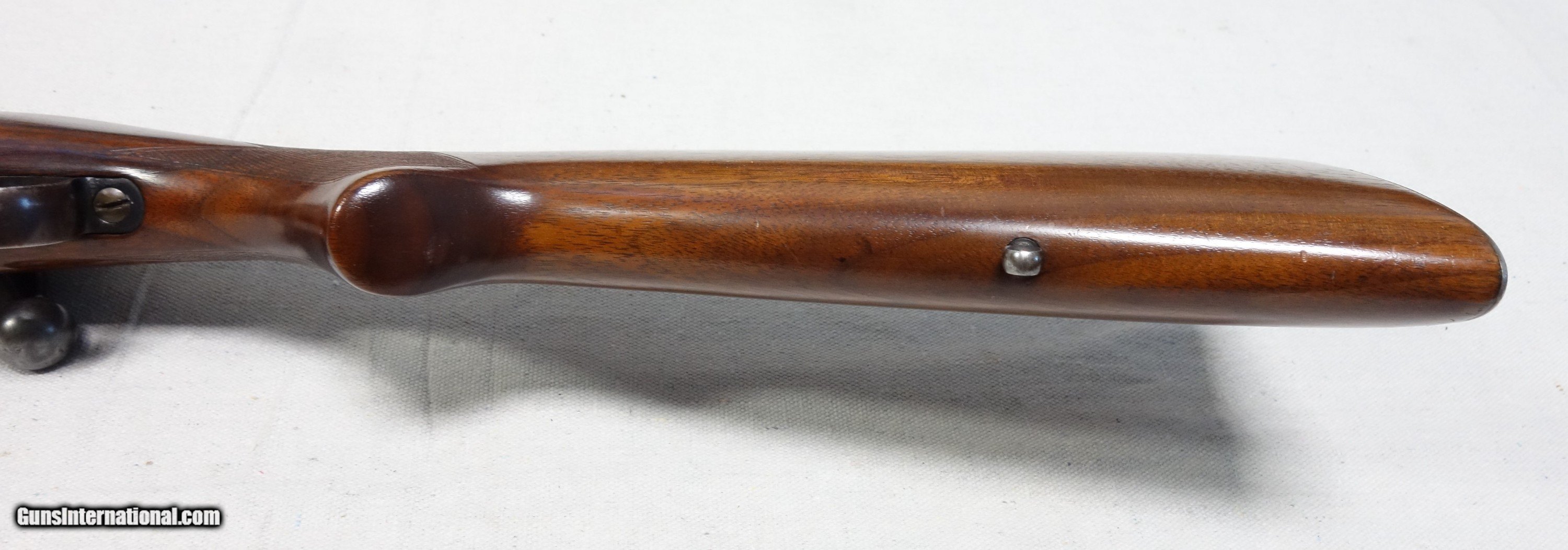 Description: *SOLD* Very scarce caliber in this completely unmolested example of the famous forerunner to the Pre 64 Model 70. There were only 50,000 Model 54s ever made, with a relative very few in 30 W.C.F. caliber. Most surviving M54s have been virtually if not literally destroyed with every sort of abomination you can imagine by fools with tools. This one is in exceptionally nice shape for its 91 years, with perfect undrilled rear bridge, nice finishes, no bolt handle alteration (nor associated routing of the wood under it), no recoil pad, and it has the correct sights and swivel studs, etc. There are no extra holes or cracks anywhere. There is some notable finish wear in the usual places of bottom metal and buttplate. The bore is excellent, as are all mechanical functions. S/N 37324A made way back in 1932! A worthy placeholder for most any collection. Please add $75 for expedited and fully insured shipping from Alaska to your receiving FFL dealer. SOLD Curio/Relic: Yes |
