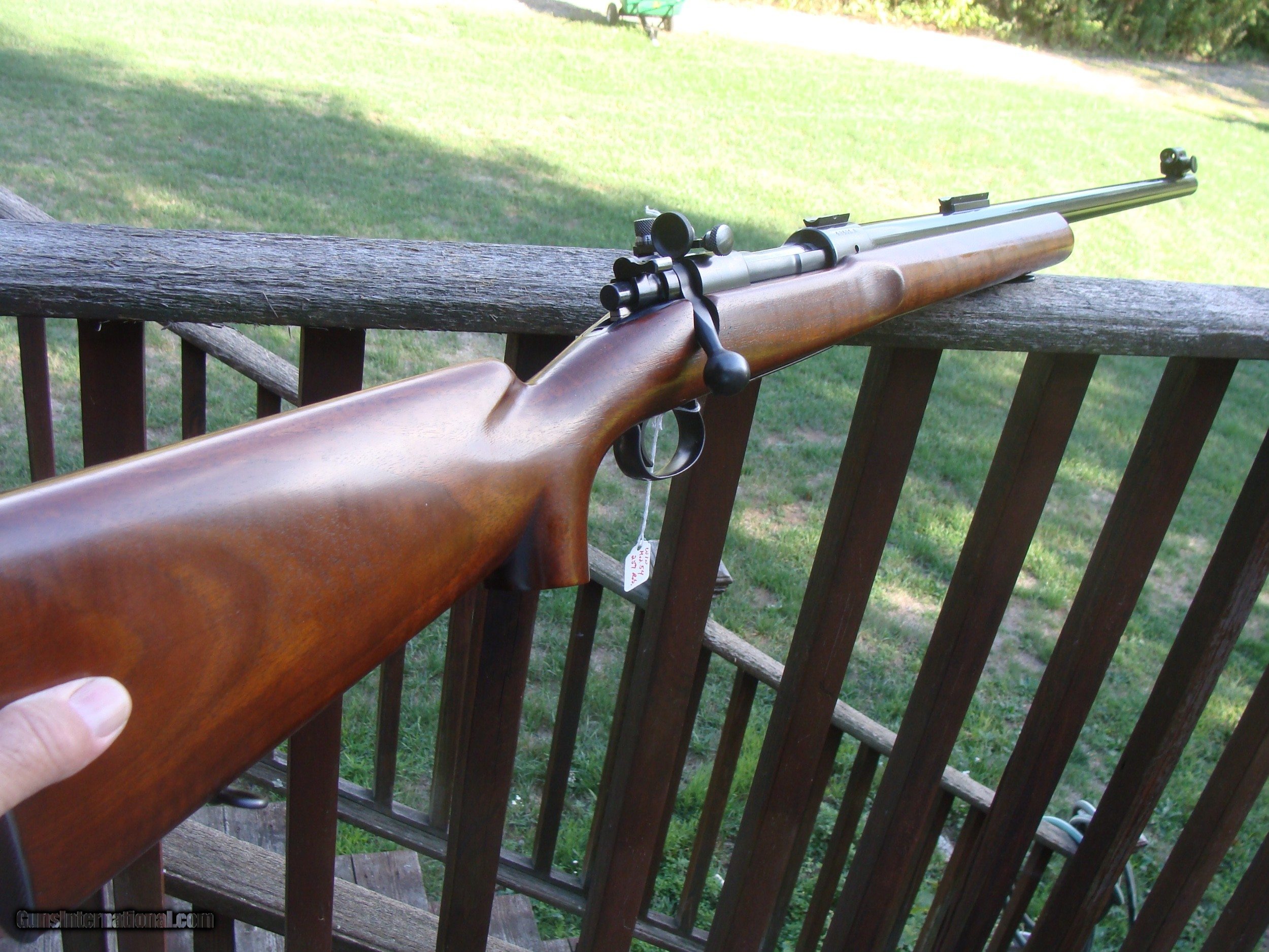 Description: This gun is a consignment owned by its 2d owner of many years TARGET MODEL. The original owner was a serious shooter who kept copious notes on all of his guns. This gun was purchased approx 1938 at Abercrombi and Fitch and was orig. a 7mm mauser. It was sent back to the factory in 1946 and re barreled at Winchester. The Model 54 stamping is an over stamp which likely means that by 1946 they had no more target weight 54 Barrels and used a M 70 barrel although it is stamped model 54. A timney target trigger was installed in 1967 by a then local to us gunsmith (now sadly gone) . The only "hair" on the gun are two holes (welded and filled) on the floor plate and a bolt handle modified to clear a scope.The stock was slightly modified to accept the modified bolt (opening enlarges slighlty) It should not be too difficult to find an unmodified floor plate should one so desire. Most would not notice either the modified bolt or slighlty enlarged opening on stock where bolt locks down on stock. It is in extraordinary overall condtition, truely. It has been represented to be exceptionally accurate. It has been really well cared for and clearly has spent most of its life in a safe. The present owner has never used or fired it. Because of the weight shipping is a little higher than for a sporter and shpping is $ 70.00 Ser # 48401A WE HAVE OVER 1800 SALES ON ALL SITES WITH AN A+ RATING ON ALL (WE ALSO KEEP AN INVENTORY OF OLDER PERIOD CORRECT SCOPES AND OFTEN SOME EXCELLENT LIGHTLY USED LEUPOLDS AS WELL. CALL WITH NEEDS) WE MOSTLY PICK VERY CLEAN AND LIGHLTY USED GUNS. WE ARE HAPPY TO TAKE CONSIGNMENT GUNS AND COLLECTIONS OR WILL BUY YOURS OUTRIGHT. WE SOMETIMES ARE EMPLOYED FOR ESTATE PURPOSES AND VALUATIONS. CT RESIDENTS MUST CONTACT US TO UNDERSTAND OUR IN STATE TRANSFER POLICIES. WE CAN TAKE A CREDIT CARD HOWEVER THERE IS A 3% ADD ON BASED ON THE TOTAL FOR USE OF A CARD IT IS ALWAYS THE BUYERS RESPONSIBILITY TO GET US A COPY OF YOUR RECEIVING FFL'S LIC AND WE REQUIRE A COPY OF YOUR PHOTO ID BEFORE THE GUN SHIPS YOU MUST CALL YOUR FFL.WE DO NOT CALL FOR YOU. LAYAWAY PURCHASES NOT COMPLETED OR ANY RETURNED ITEM UNLESS NOT AS DESCRIBED ARE SUBJECT TO A 10% RELISTING/RESTOCKING FEE AND MUST BE RETURNED WITH NO MARKS OR SCRATCHES OR DAMAGE NOT PREVIOUSLY THERE. SENT BACK INSURED, PRIORITY SIGNATURE REQUIRED WE DO NOT OFFER AN INSPECTION PERIOD PER SE HOWEVER GUNS MAY BE RETURNED IF NOT EXACTLY AS DESCRIBED UNDER NO CIRCUMSTANCE MAY ANY GUN TO BE RETURNED HAVE BEEN REMOVED AT ANY TIME FROM RECEIVING FFL DEALERS PREMISIS AND RETURNS MUST 1ST BE APPROVED BY US IN WRITING. SOLD |