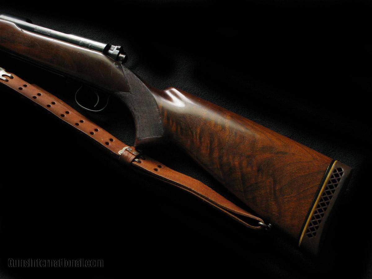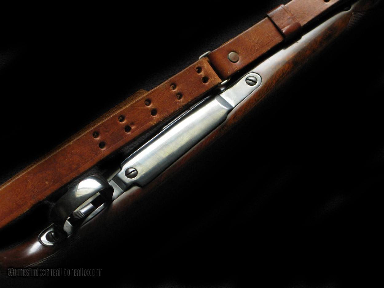 Description: Super rare, in high overall condition showing very little wear. Stock has 24 line checkering, nice figure, aftermarket rubber pad with 14.5 lop. Factory target contour 24" barrel drilled for target scope blocks. Rear bridge undrilled. 22H magazine is intact, unmodified, but the chamber and bolt have been modified to 222 Rem, which makes this a single shot as the 222 ctg will not enter the hornet blind mag. Barrel caliber marking altered to 222. SOLD |