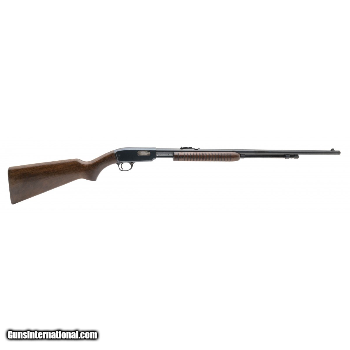 Description: " SN: 228151. Circa 1950s. Chambered in .22 short, long and long rifle with a 24"" barrel, bore is excellent. Slide action rimfire rifle with 95% original blue finish and walnut stock. Overall condition is very good plus condition with some light wear on barrel. SOLD |