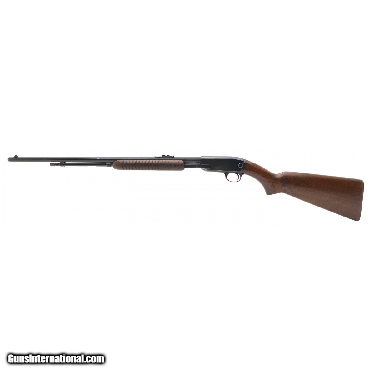 Description: " SN:144885. Made in 1950, 22 Long Rifle with a 24"" Barrel. Slide action rifle. The bore and action are excellent. Has about 80% blue mixed with patina. The stock shows marks and wear but is not cracked. SOLD Curio/Relic: Yes |