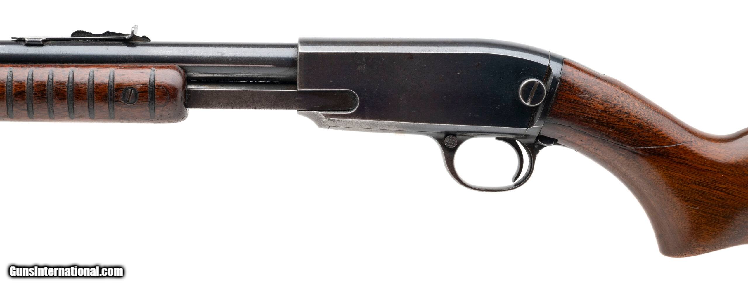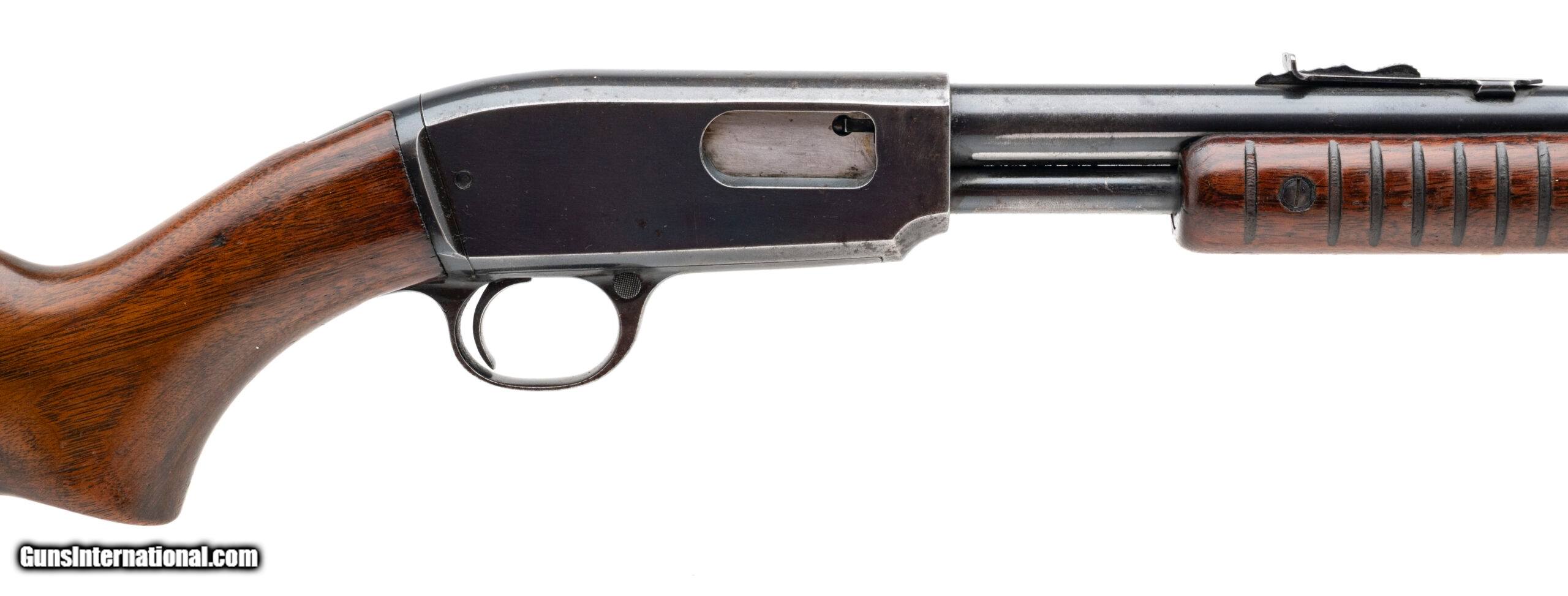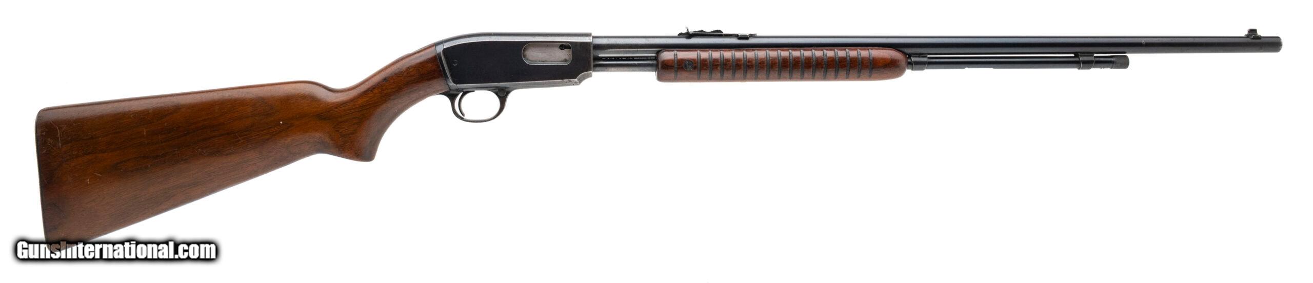 Description: "SN: 89414 made in 1947. Pump action takedown rifle chambered in 22 S-L-LR with a 24"" round barrel with dovetailed front and rear sights, original walnut furniture with original butt plate. Some light wear and handling marks on the stock with one deeper scratch, NOT a crack on the left side of the wrist, with light wear to the metal finish, overall in very good condition for its age with an excellent bore. Price: $895.00 Contact Seller |