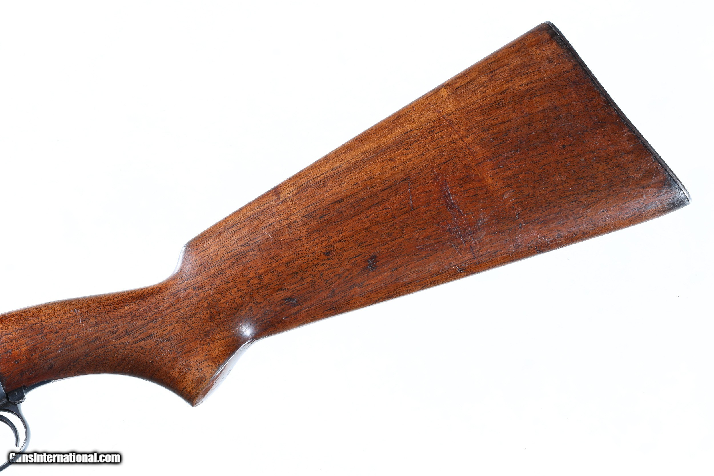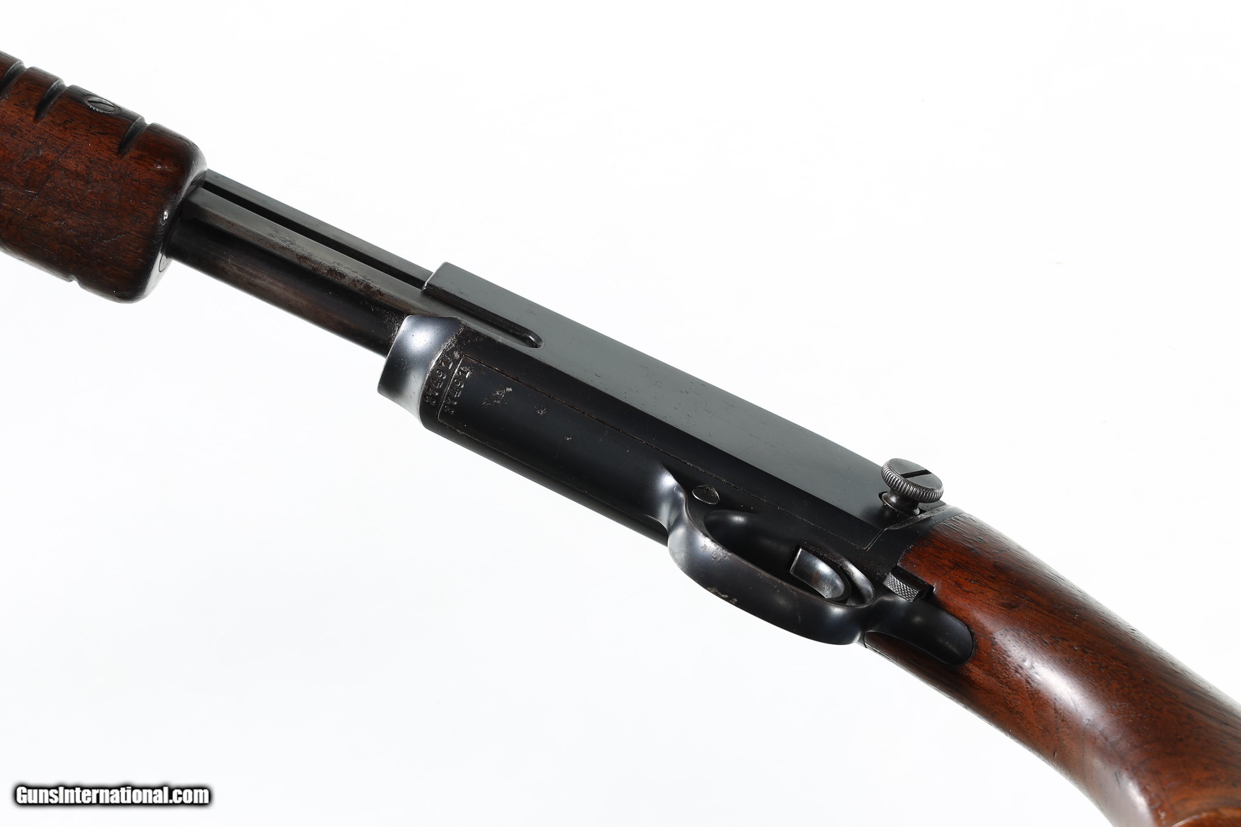 Description: Metal surfaces rate very good with scattered spotting throughout. Handling/usage marks to wood. Mfd in 1937. The Winchester Model 61 Slide Rifle has a unique design with a slide-action rarely seen amongst rifles. The sliding motion chambers a .22 Winchester rimfire round from the under-barrel tubular magazine and cocks an internal hammer. The lightweight design and quick cocking mechanisms made this a popular option for young man's rifles for all purposes, as it was marketed the "Boy's Rifle" in the 1930's. This particular rifle was amongst the earliest made, as it was manufactured in 1937, making this an even more desirable classic. • Free Shipping, No Credit Card Fees. • Lay-a-way available for this firearm. • 1/3 Down, a 1/3 in 30 Days 1/3 in 60 Days. SOLD Curio/Relic: Yes Manufacturer: Winchester Model: 61 Serial Number: 27491 Barrel Length: 24 |