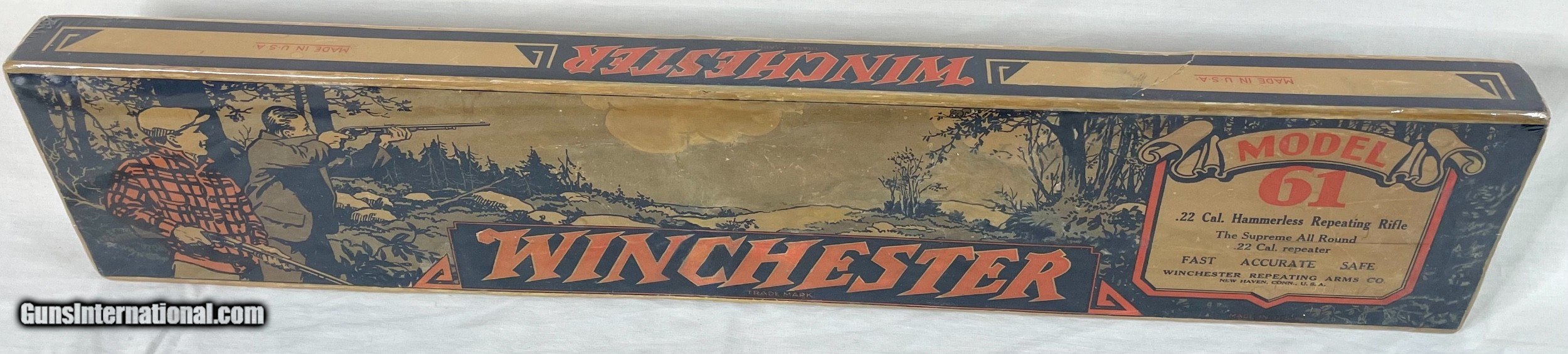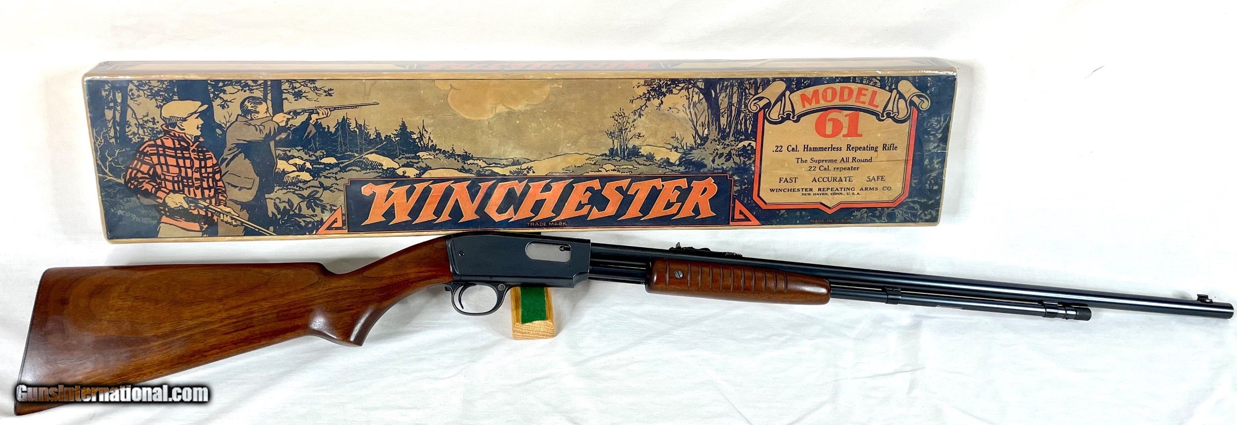 Description: For sale I have a very rare pre war Winchester 61 with its original box. This is the only pre war box that I have ever seen and it is absolutely beautiful. The colors are so vivid and deep. The rifle is in near new condition but it has been fired. It will shoot S,L, LR and was made in 1935. This is a very rare package seldom seen at all, much less for sale. This is a must for any serious 61 collector. As always I guarantee this rifle to be 100% original and there is a 3 day non firing inspection period also. Please don't hesitate to ask any questions or request more photos. SOLD Curio/Relic: Yes Rifle Caliber: .22 Long Rifle Manufacturer: Winchester Model: 61 Condition: 98% |