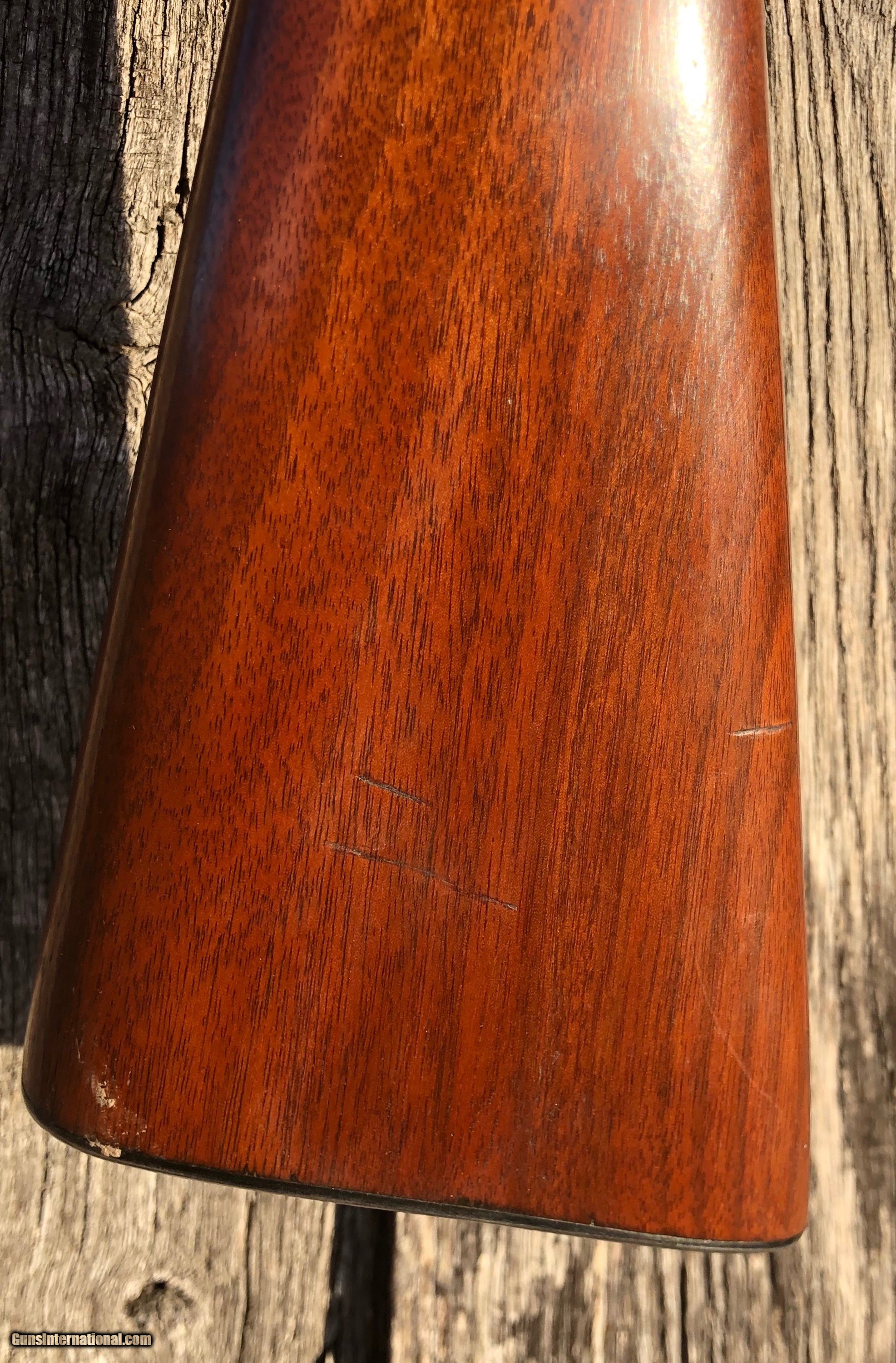 Description: This little factory Winchester model 61 routledge could be handy for garden thieves. Gun has been pretty well cared for but has some wear to the wood and metal from use . The bore looks bright and there are no cracks in the wood . Metal has a few dings but no rusting or pitting that I can see. I tried to show all the wear marks in the photos. Gun is on consignment so NO trades are accepted, FFL transfer only . Thanks. SOLD |