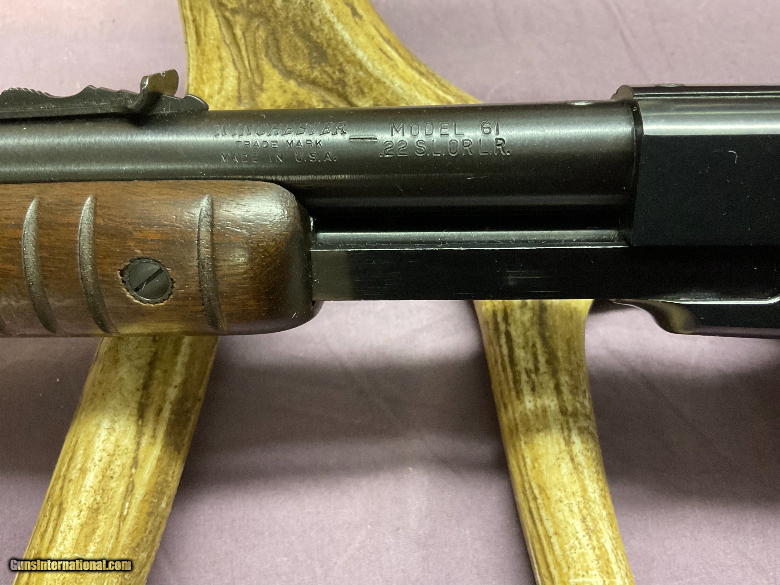 Description: Here's a model 61 built in 1958 and is as near perfect as it can get for a used gun. This little fellow is MINT !! Pictures tell it very well. It's been in a humidity controlled room a long time. The inside of this gun is as clean as the outside. Shows no sign of use, no wear ,no dirt . I guess it's been fired but not by me . Grooved for scope if needed. I could go on and on about this 61 but if you know 61s' you've heard enough . Bottom line, finest 61 I've ever owned that isn't still in its box unfired never loaded. BY THE WAY, I have one of those new in it's box, never fired, never loaded 61's. Thanks, Ed SOLD Rifle Caliber: .22 Long Rifle Manufacturer: Winchester Model: 61 Serial Number: 252xxx Barrel Length: 24 Condition: MINT Metal Condition: Mint Wood Condition: Mint Bore Condition: Mint |