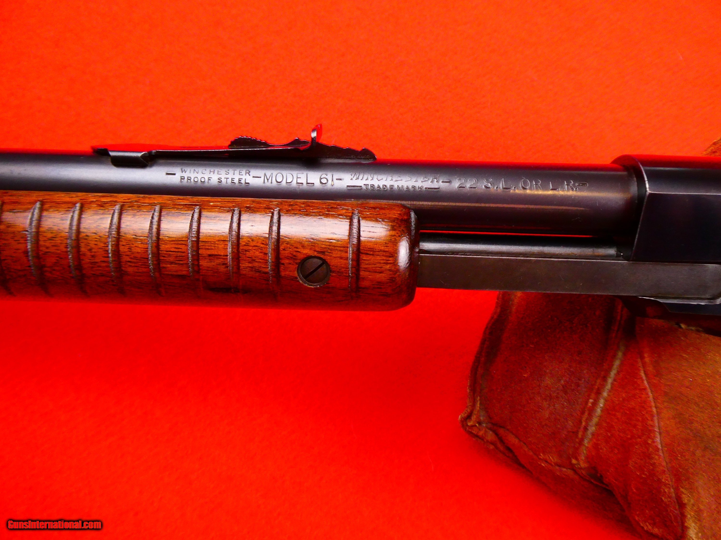 Description: ***SOLD*** Winchester model 61 .22 S-L-LR, Serial # 47737 made in 1940, Pump action, All original, 24 inch barrel, Open sights, Tube Magazine, Take down, W- stamped, Plain pistol grip stock with beautiful wood, Checked steel buttplate, Bluing is excellent, Bore is excellent, 85 year old rifle in pristine condition. Layaway Available SOLD |