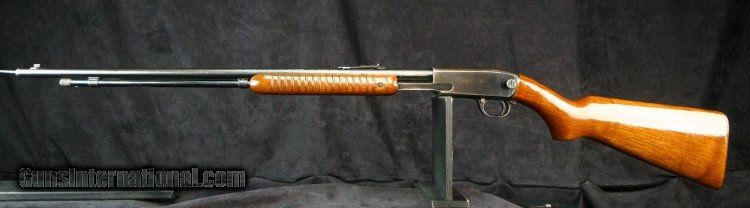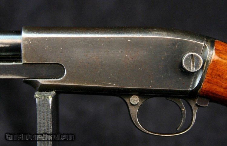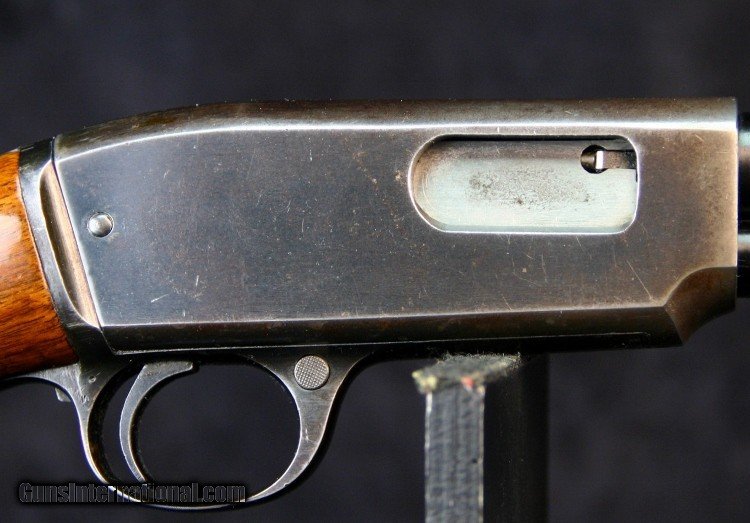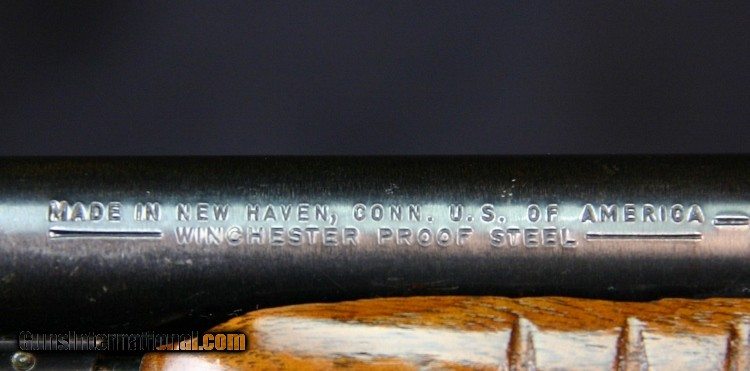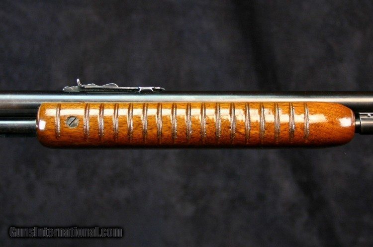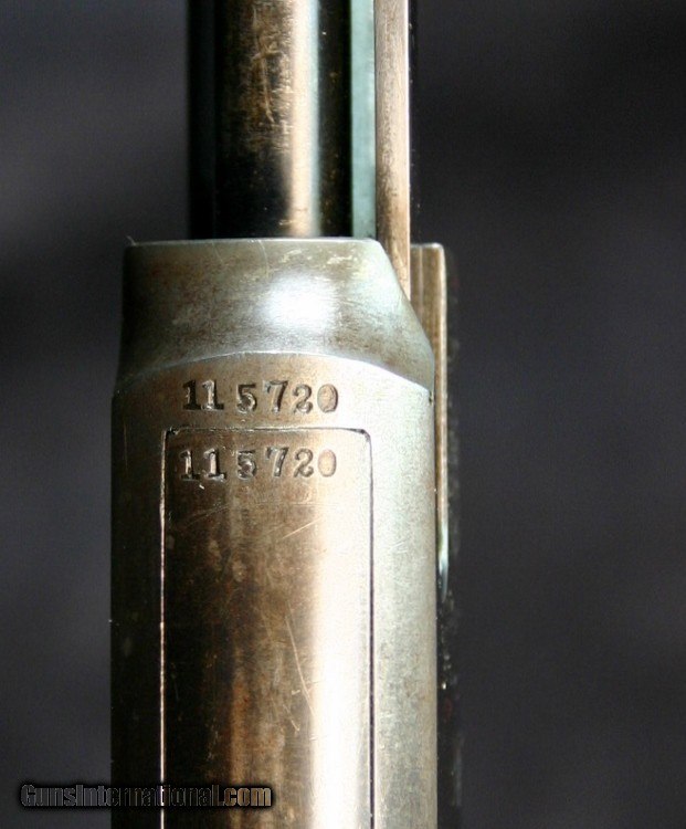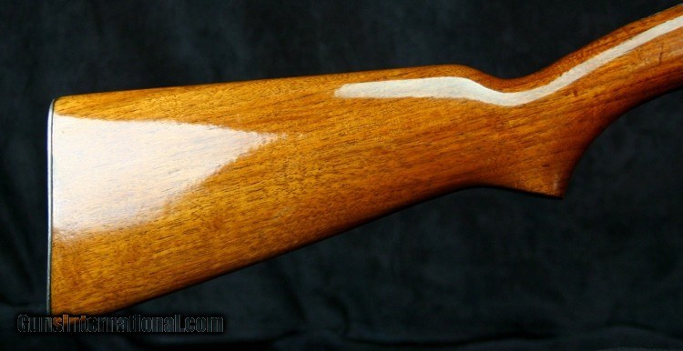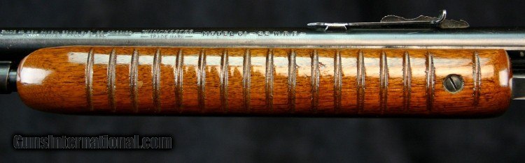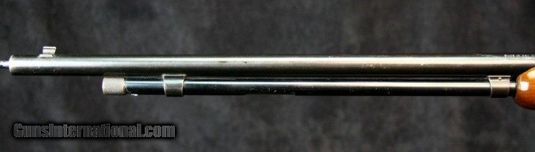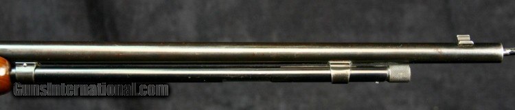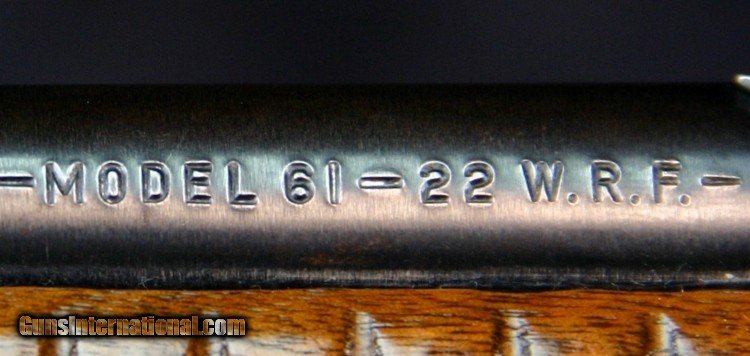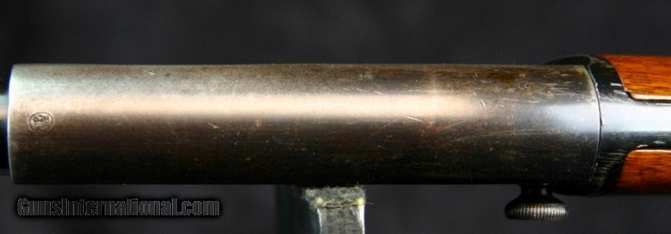 Description: .22wrf, #115750, 24 inch round barrel, blue finish, walnut stock and forearm, original sights, iron butt plate, 1949. Winchester made the 61 in .22wrf with a round barrel for only 3 years. Condition: excellent bright bore, 90% blue overall thinning especially at hand contact areas, silver on high edges, excellent wood, excellent marks, excellent mechanically. SOLD Curio/Relic: Yes |