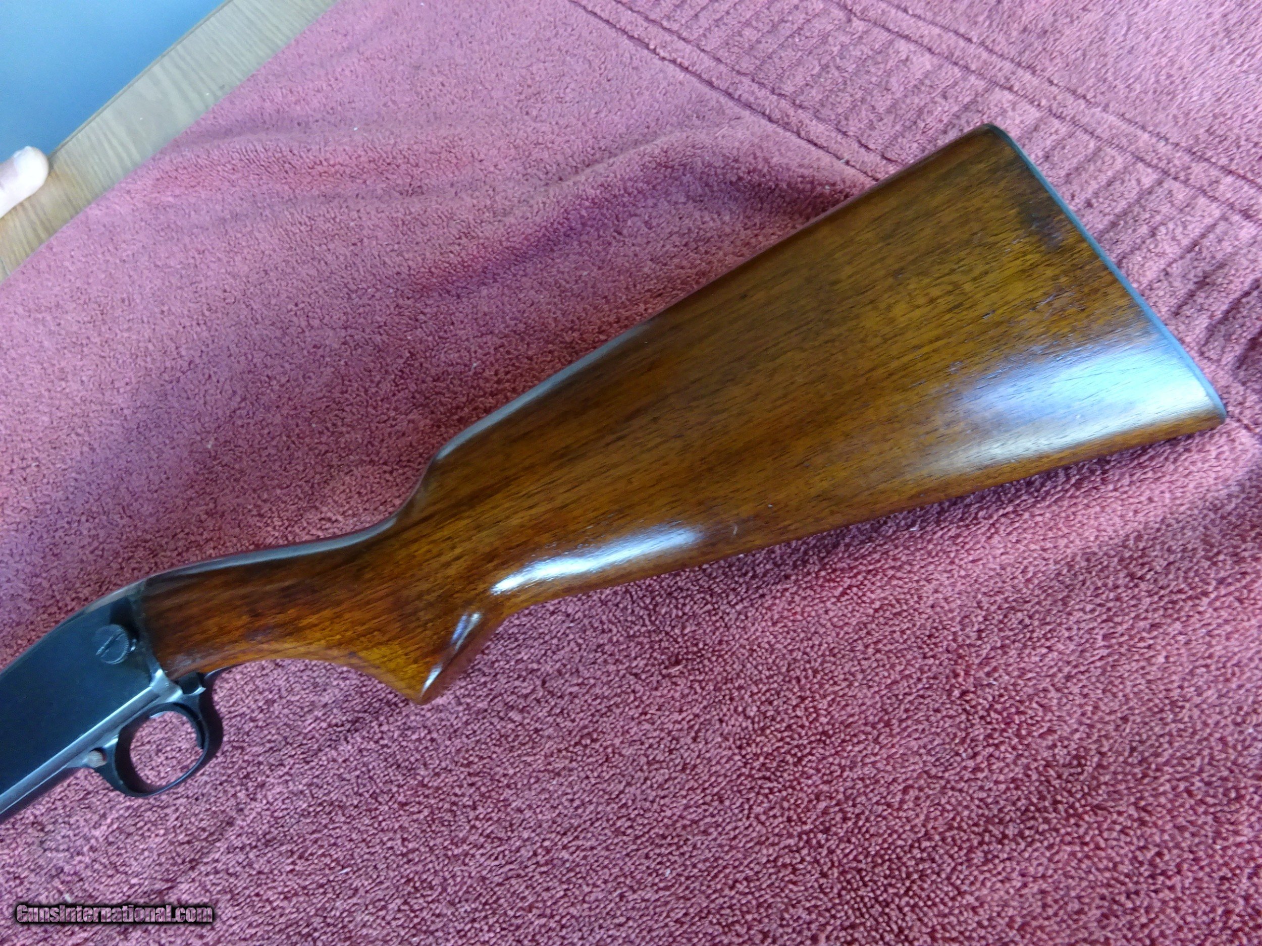 Description: WINCHESTER MODEL 61, GROOVED RECEIVER, 22 S. L. LR, 24" ROUND BARREL. MIRROR PERFECT BORE, 98% BRIGHT BLUE - ONLY WEAR IS FROM THE MOVEMENT OF THE SLIDE. RECEIVER AND TRIGGERGUARD HAVE 100% BLUE. PISTOL GRIP STOCK, RIBBED FOREARM, WOOD FINISH IS EXCELLENT WITH ONLY VERY MINOR HANDLING RUBS. CHECKERED STEEL BUTTPLATE, MADE IN 1957. THESE EARLY GROOVED RECEIVER STEEL BUTTPLATE GUNS ARE A DISIRABLE VARIATION. NICE GUN, 100% ORIGINAL. $1275 SOLD Curio/Relic: Yes |