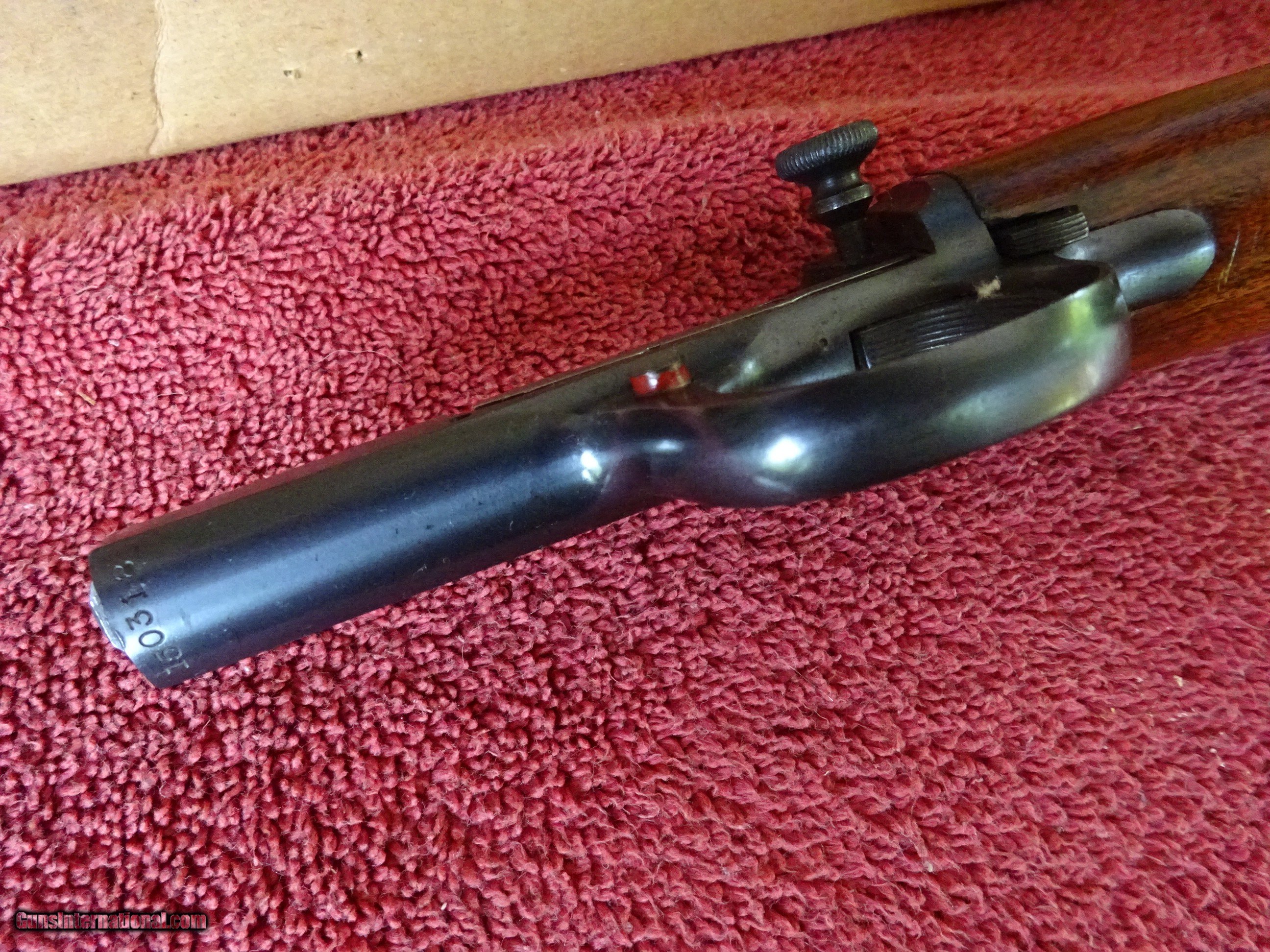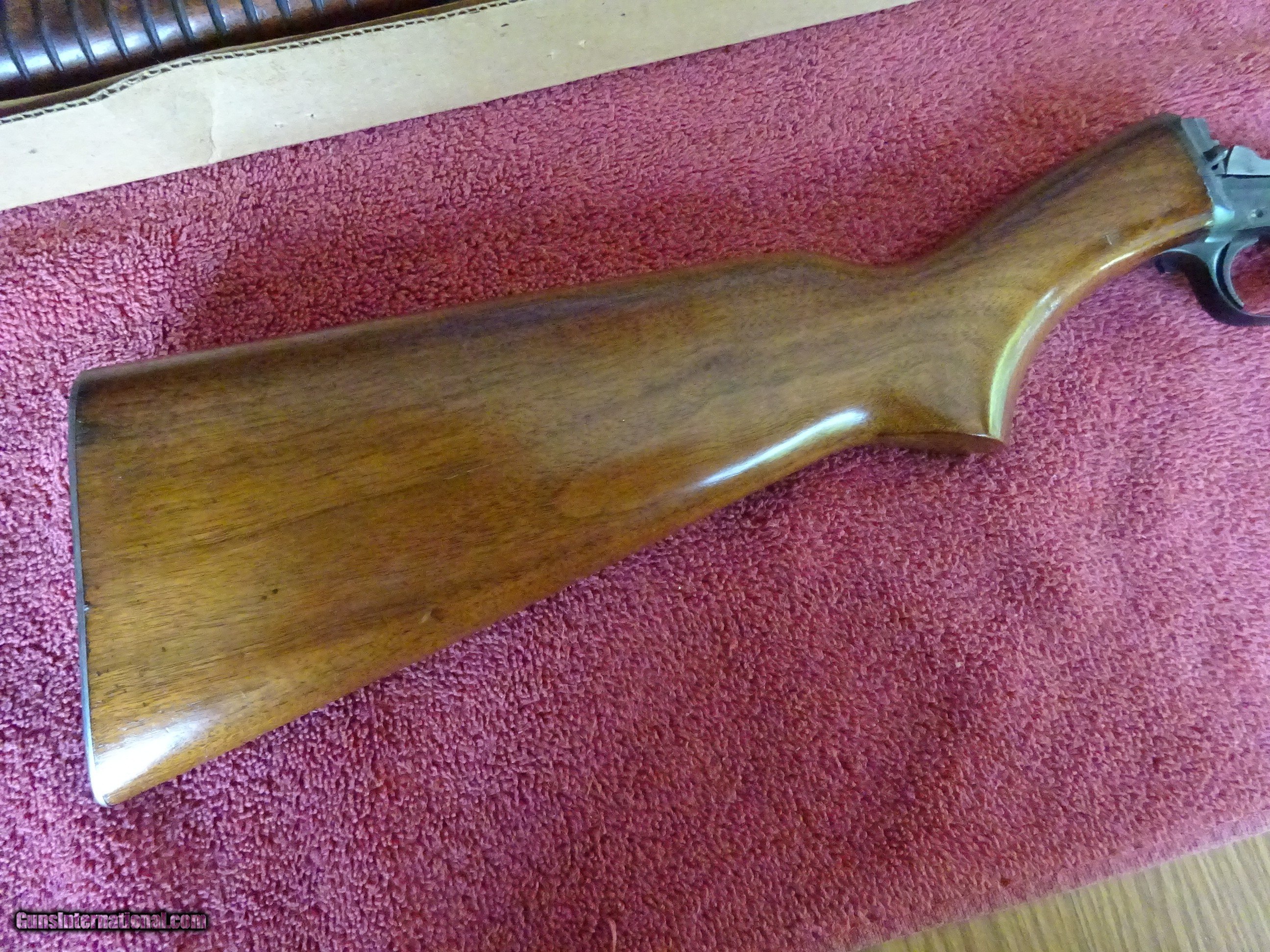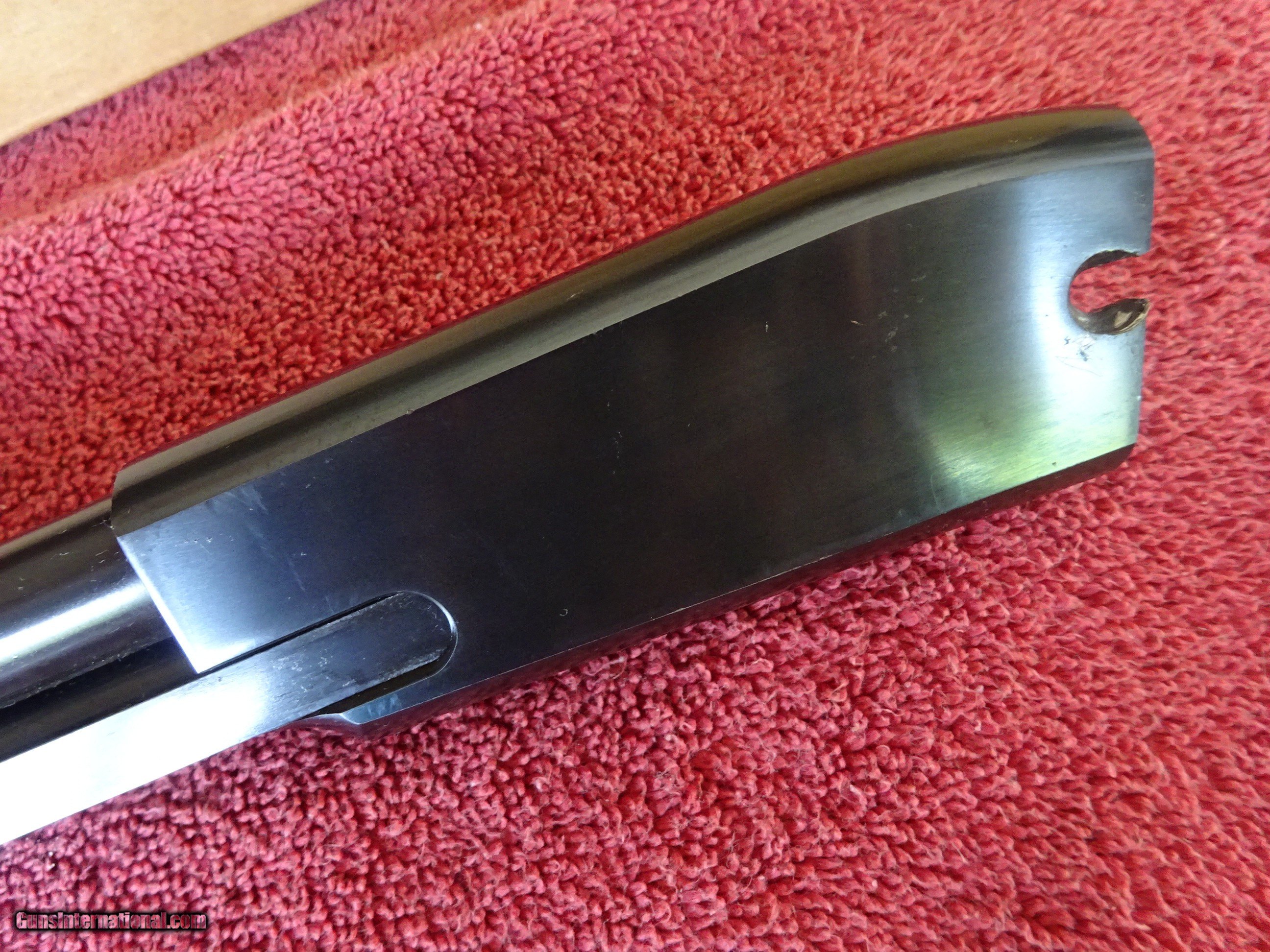 Description: WINCHESTER MODEL 61, 22 S. L. OR L.R. 24" ROUND BARREL, FIXED FRONT SIGHT, STEP ADJUSTABLE REAR SIGHT, MIRROR PERFECT BORE. THE ONLY BLUE WEAR IS FROM THE MOVEMENT OF THE SLIDE. PISTOL GRIP STOCK, RIBBED FOREARM, CHECKERED STEEL BUTTPLATE. EXCELLENT WOOD WITH ONLY MINOR HANDLING MARKS IN THE VARNISH. MADE IN 1942. INCLUDES ORIGINAL PICTURE BOX WITH CARDBOARD PARTITIONS, WAX PAPER, INSTRUCTION FOLDER AND HANGTAG. $2650.00 + $70.00 Insured shipping to an FFL address. Layaway is available. See all Pats gun listings on this site! We also have hundreds of ORIGINAL gun company advertising & memorabilia pieces available for sale on our site SPORTINGCOLLECTIBLES. We have no reprints or reproductions. Email for more information. SOLD Curio/Relic: Yes |