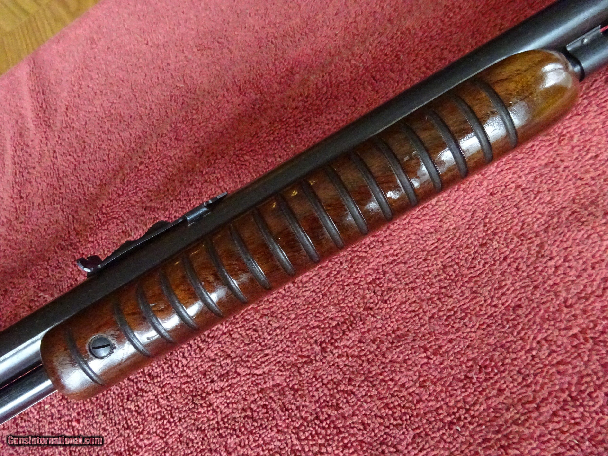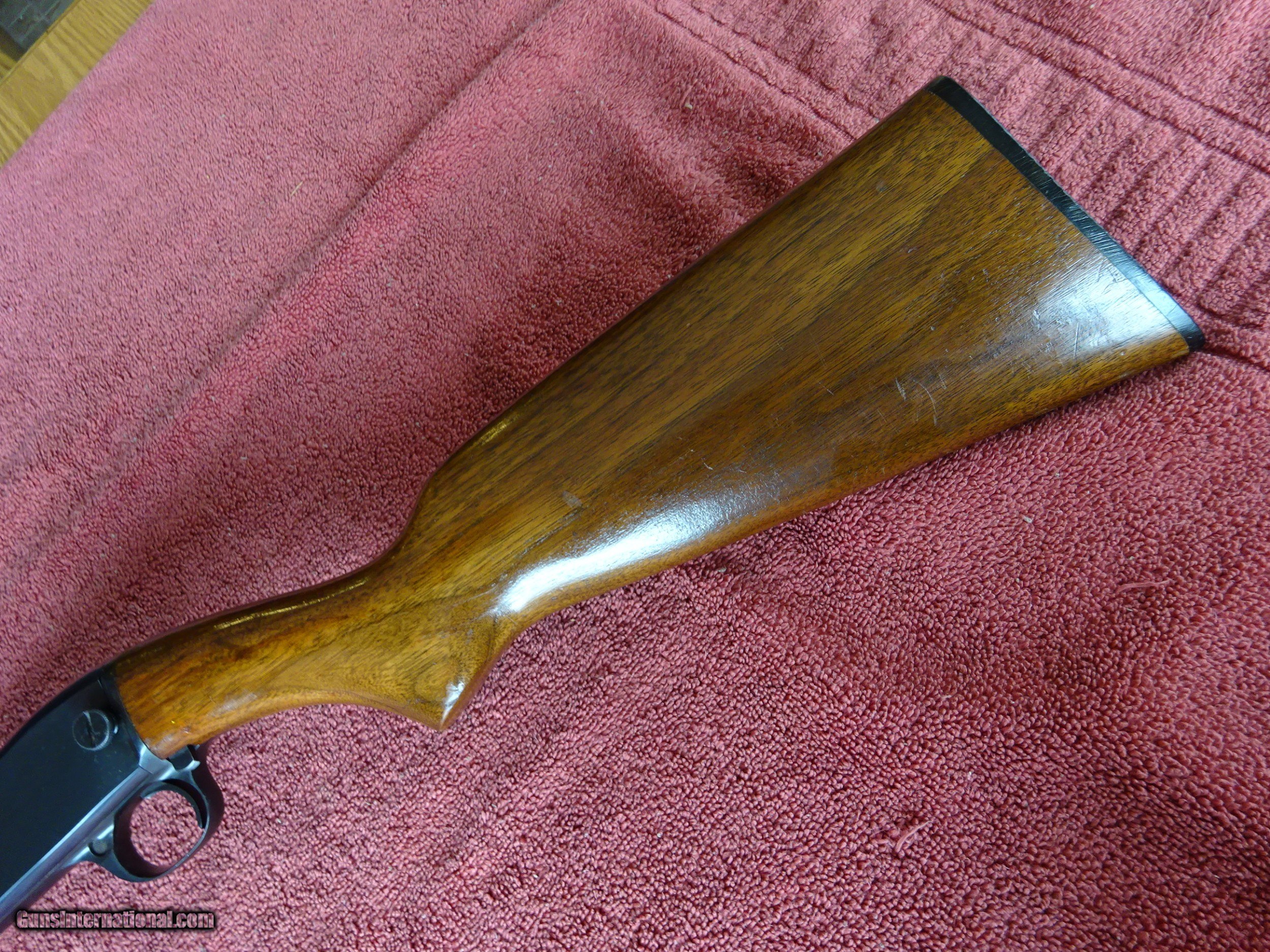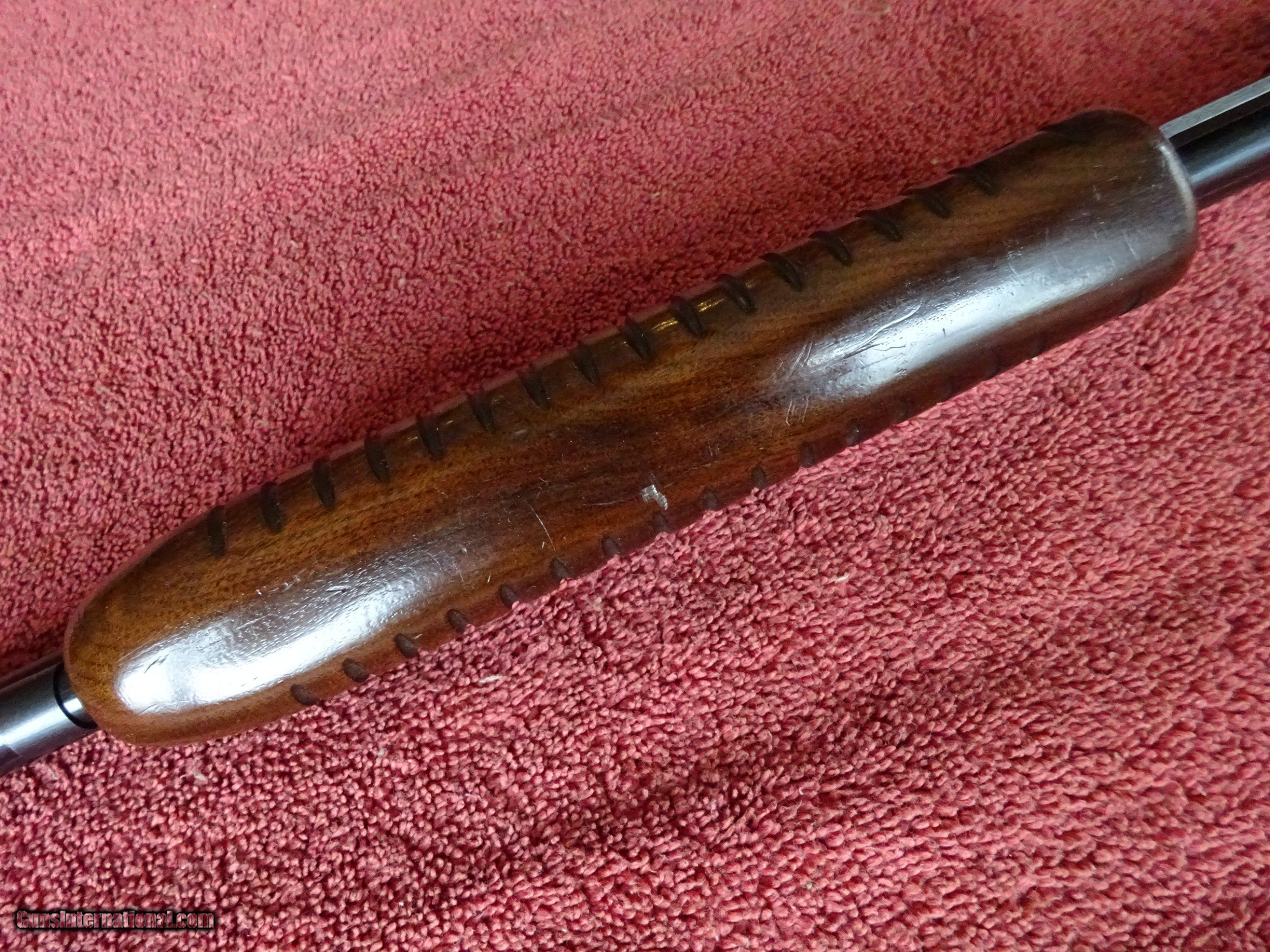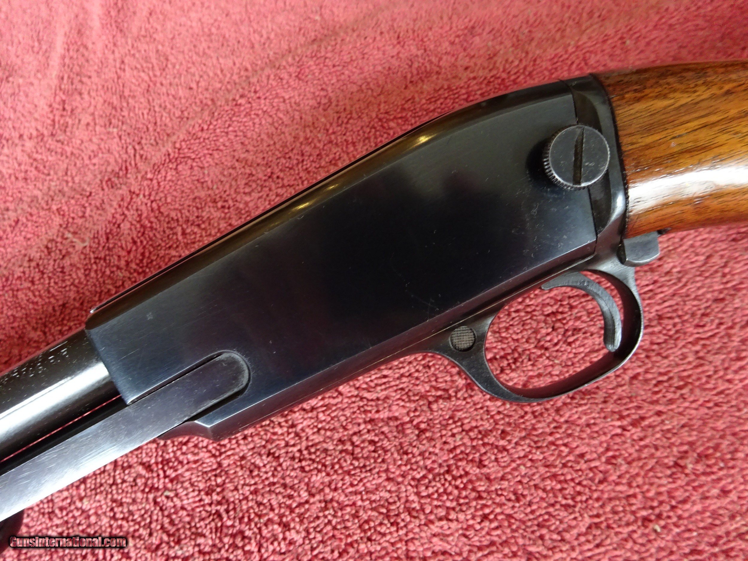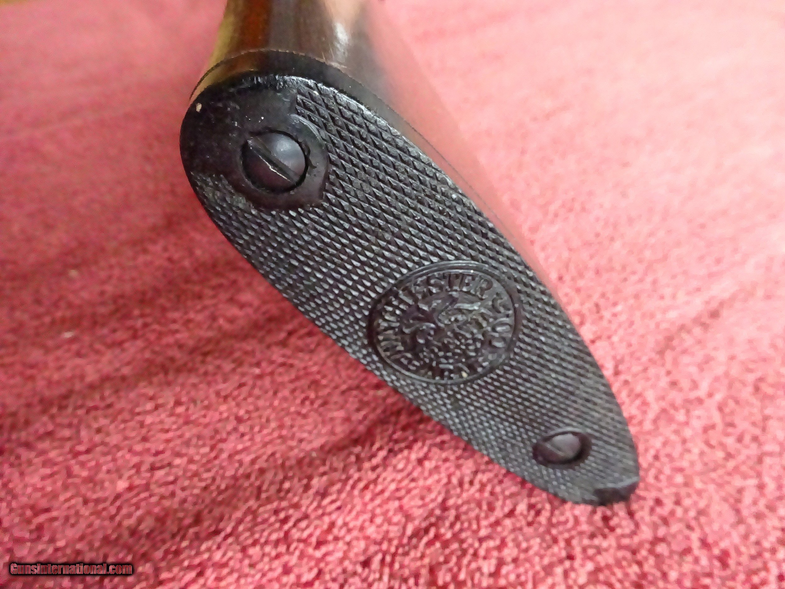 Description: WINCHESTER MODEL 61, 22 MAGNUM. 24" ROUND BARREL, STANDARD FRONT AND REAR SIGHTS, MIRROR PERFECT BORE, ONLY BLUE WEAR IS FROM THE MOVEMENT OF THE SLIDE. THE FRAME AND TRIGGERGUARD HAVE 100% BLUE. PISTOL GRIP STOCK, RIBBED FOREARM, EXCELLENT WOOD AND VARNISH, ONLY MINOR HANDLING MARKS. PERFECT WINCHESTER MARKED COMPOSITION BUTTPLATE, 100% ORIGINAL CONDITION. MADE IN 1961. $2375.00 + $70.00 Insured shipping to an FFL address. See all Pats gun listings on this site! We also have hundreds of pieces of ORIGINAL gun company advertising & memorabilia available for sale on our site SPORTINGCOLLECTIBLES. We have no reprints or reproductions. Email for more information. SOLD Curio/Relic: Yes |