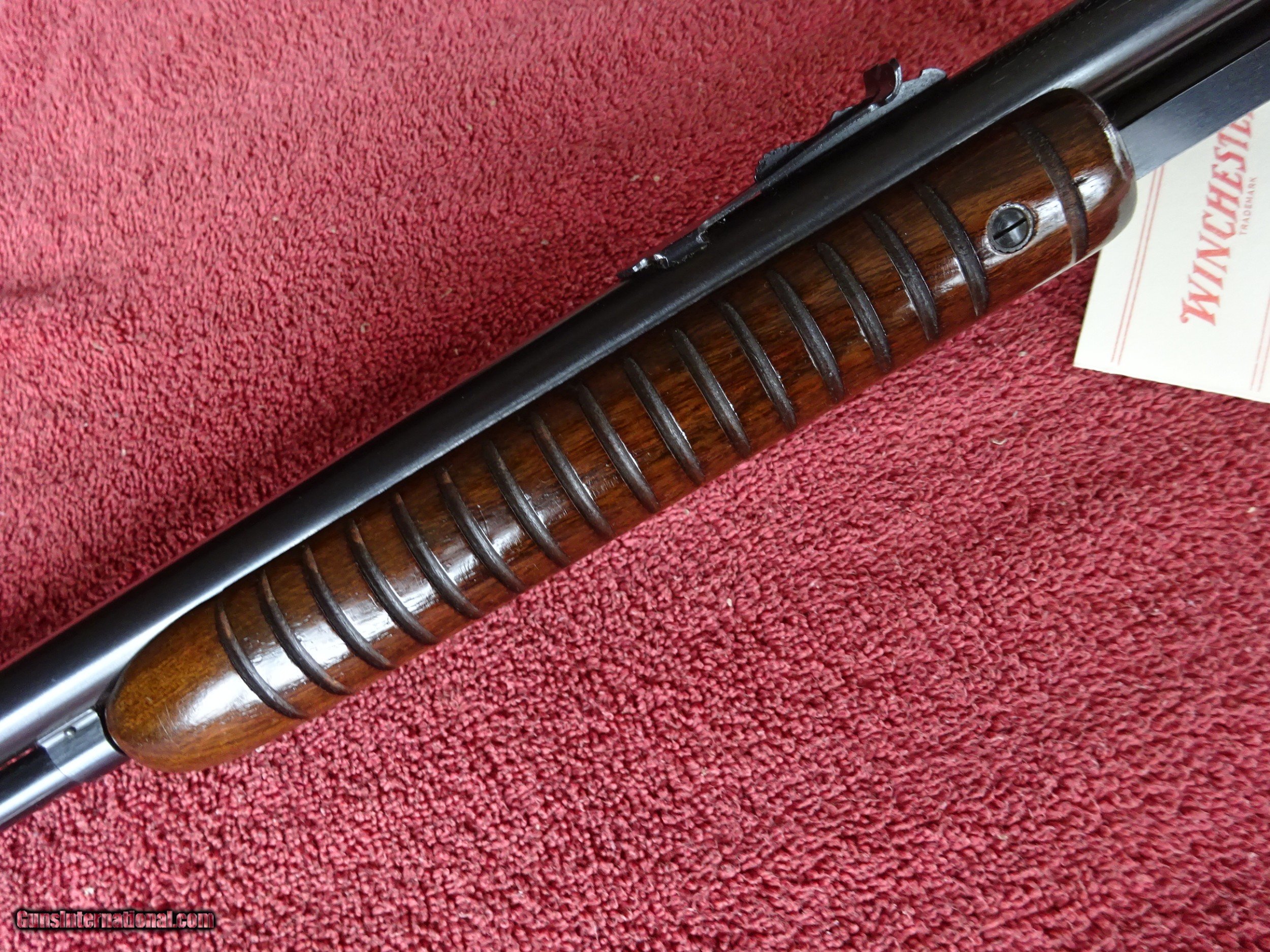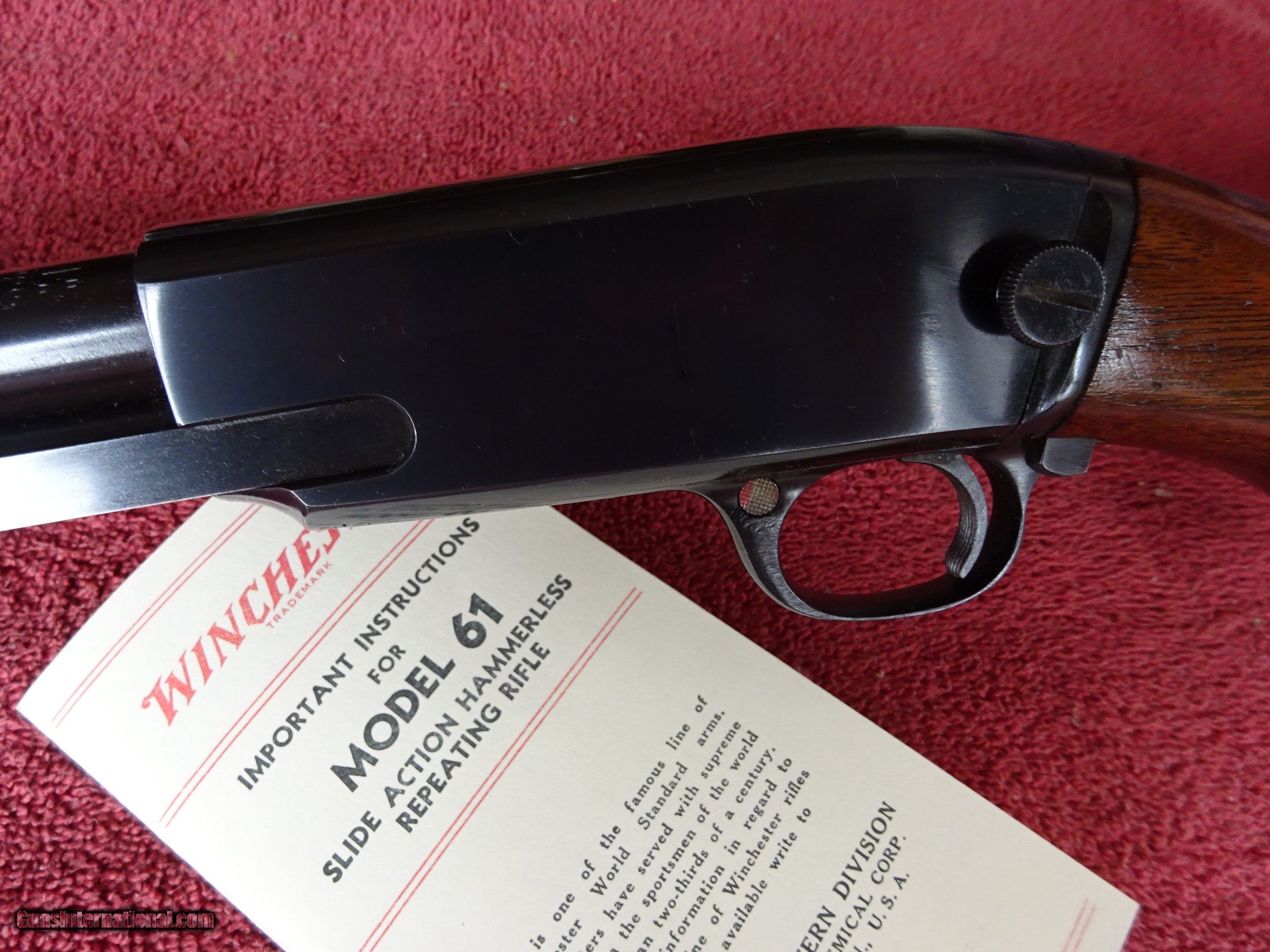 Description: WINCHESTER MODEL 61 MAGNUM. 99% BRIGHT BLUE, MIRROR PERFECT BORE. ATTRACTIVE DARK GRAINED WOOD, NORMAL HANDLING MARKS IN THE VARNISH, PERFECT BUTTPLATE. INCLUDES ORIGINAL INSTRUCTION FOLDER. MADE IN 1960, 100% ORIGINAL CONDITION. $2250.00 + + $50.00 Insured shipping to an FFL address. See all Pats gun listings on this site! We also have hundreds of pieces of ORIGINAL gun company advertising & memorabilia available for sale on our site SPORTINGCOLLECTIBLES. We have no reprints or reproductions. Email for more information. SOLD Curio/Relic: Yes |