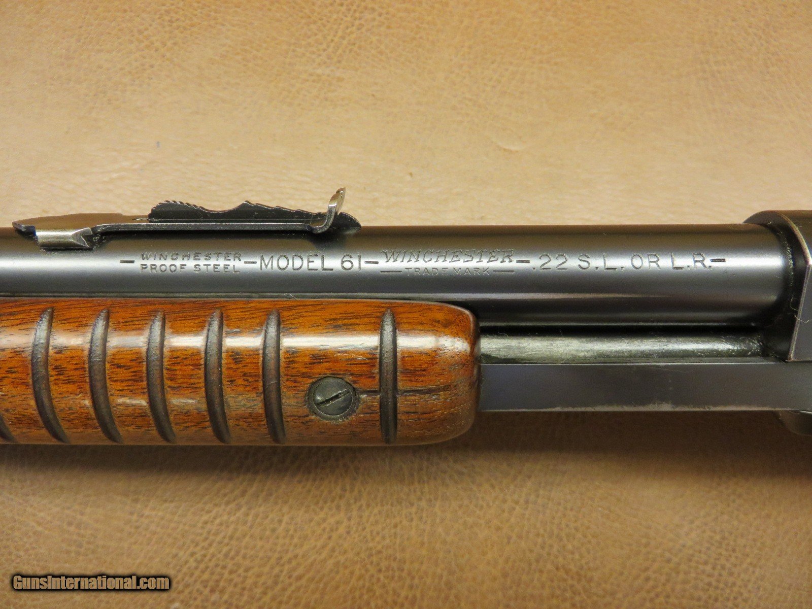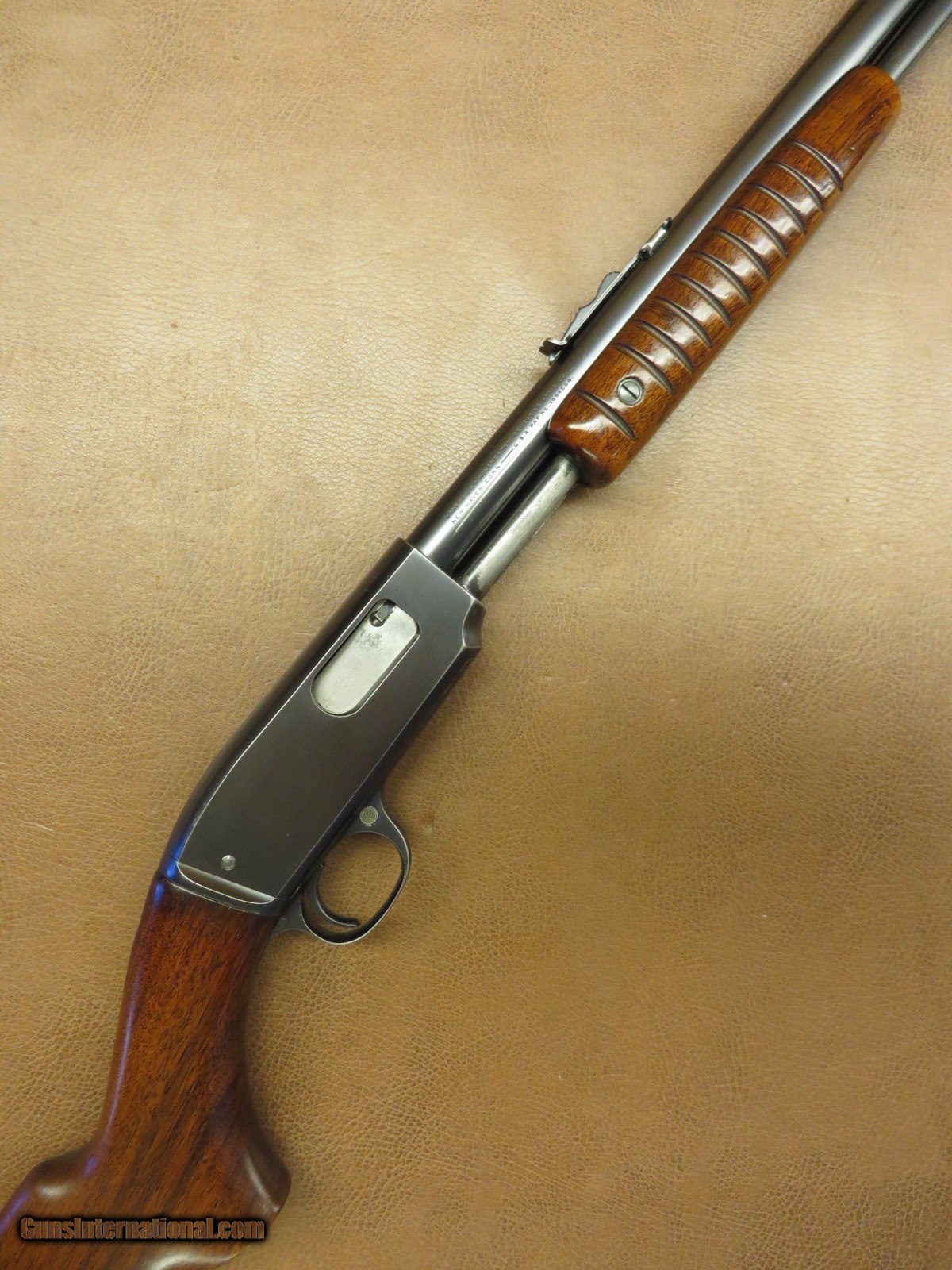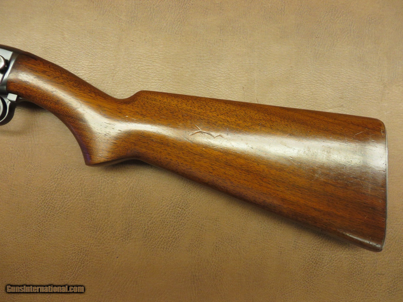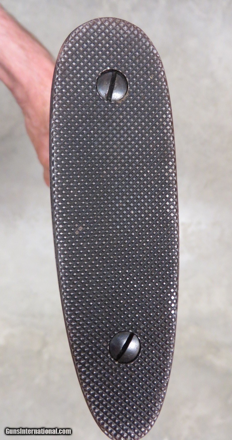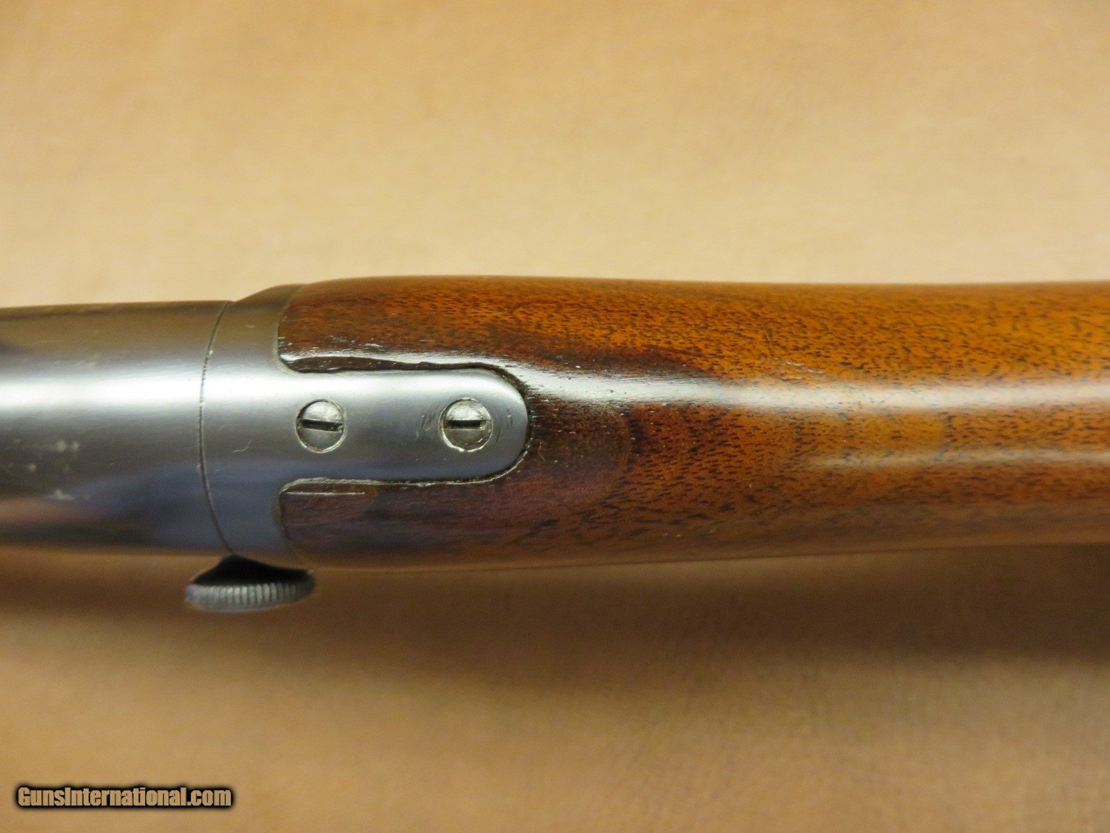 Description: .22 S.L.L.R. has 24 inch barrel with original sights and excellent bore. Matching numbers 35xxx. Tang is factory drilled and tapped for tang sight. Non checkered walnut with original checkered steel butt plate. Blue is 95%+ except for the magazine tube which has the usual wear and flaking. Wood is about 90%. SOLD |
