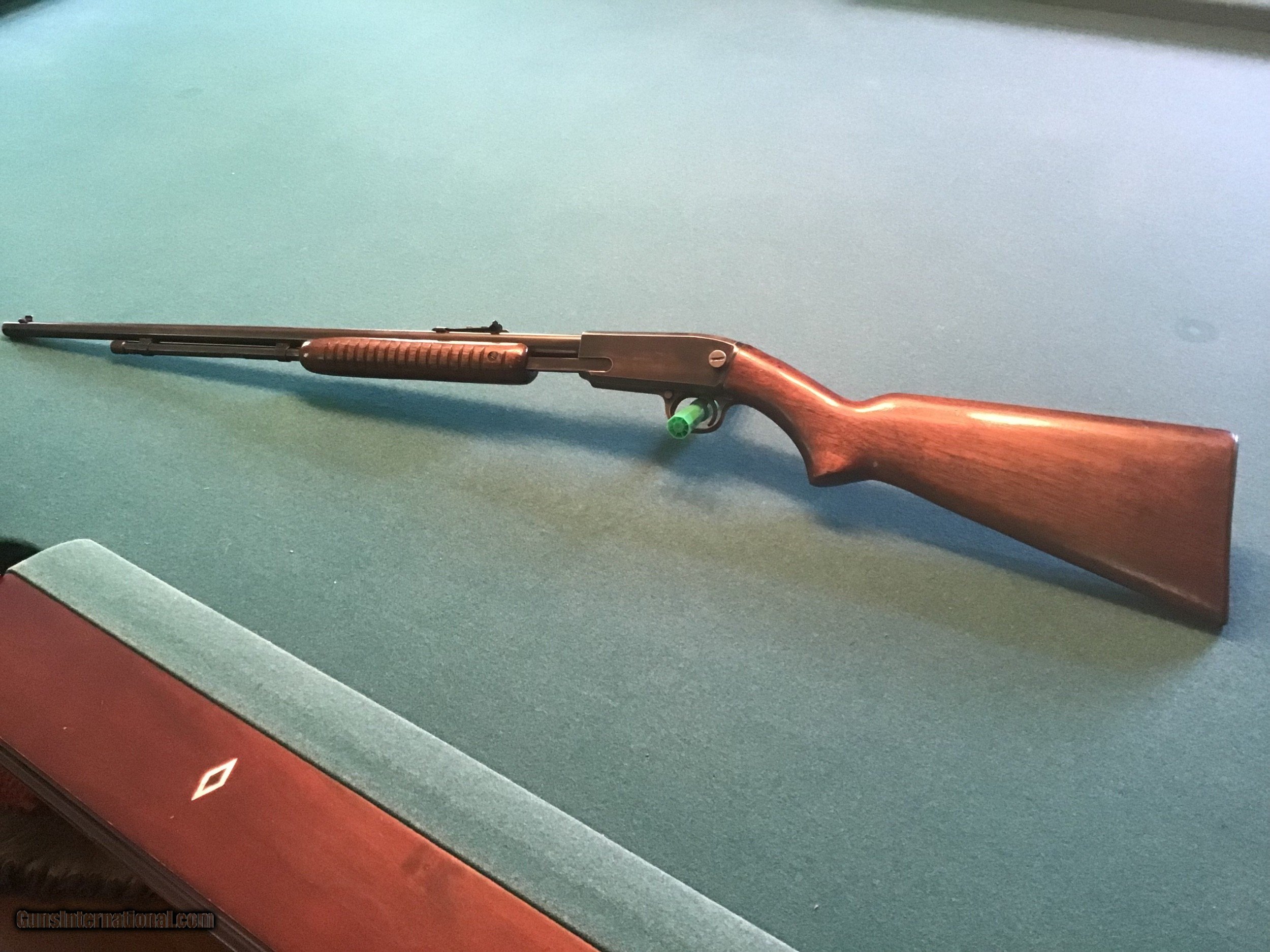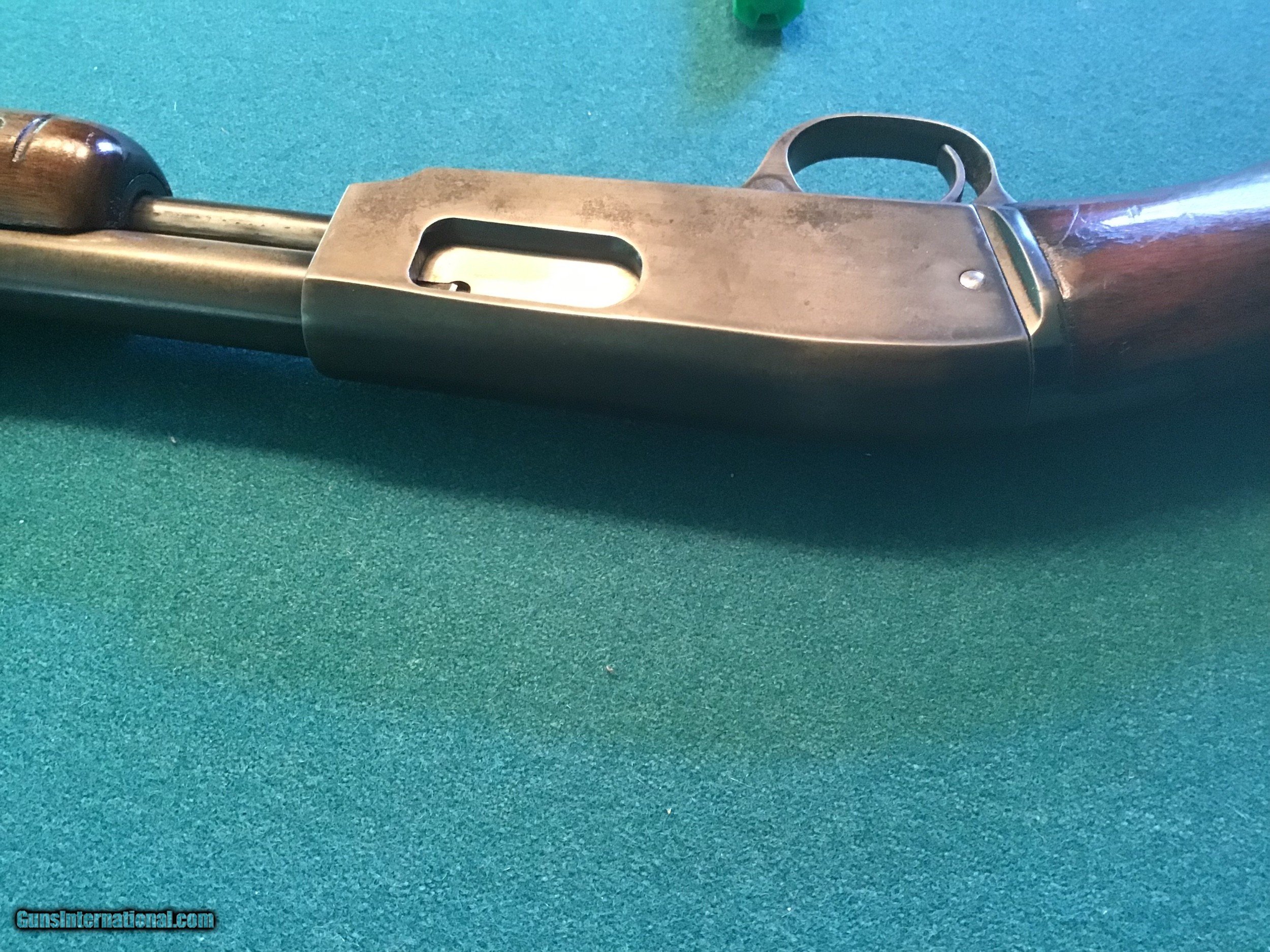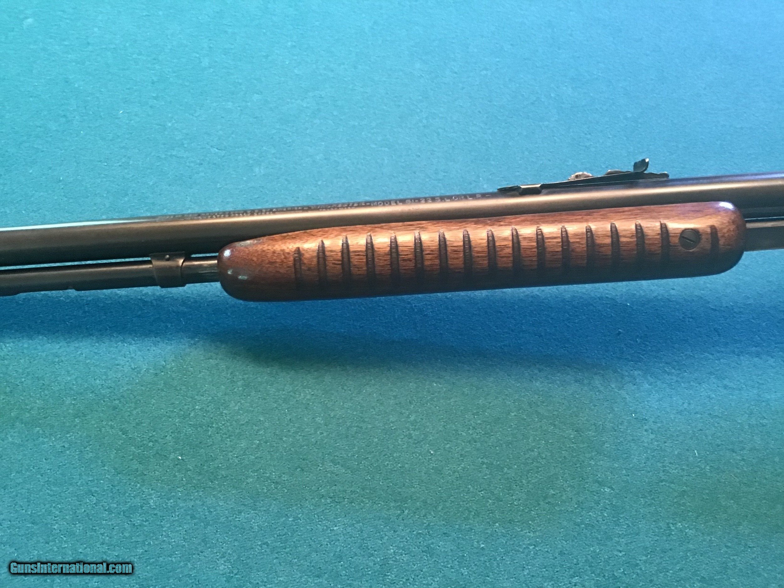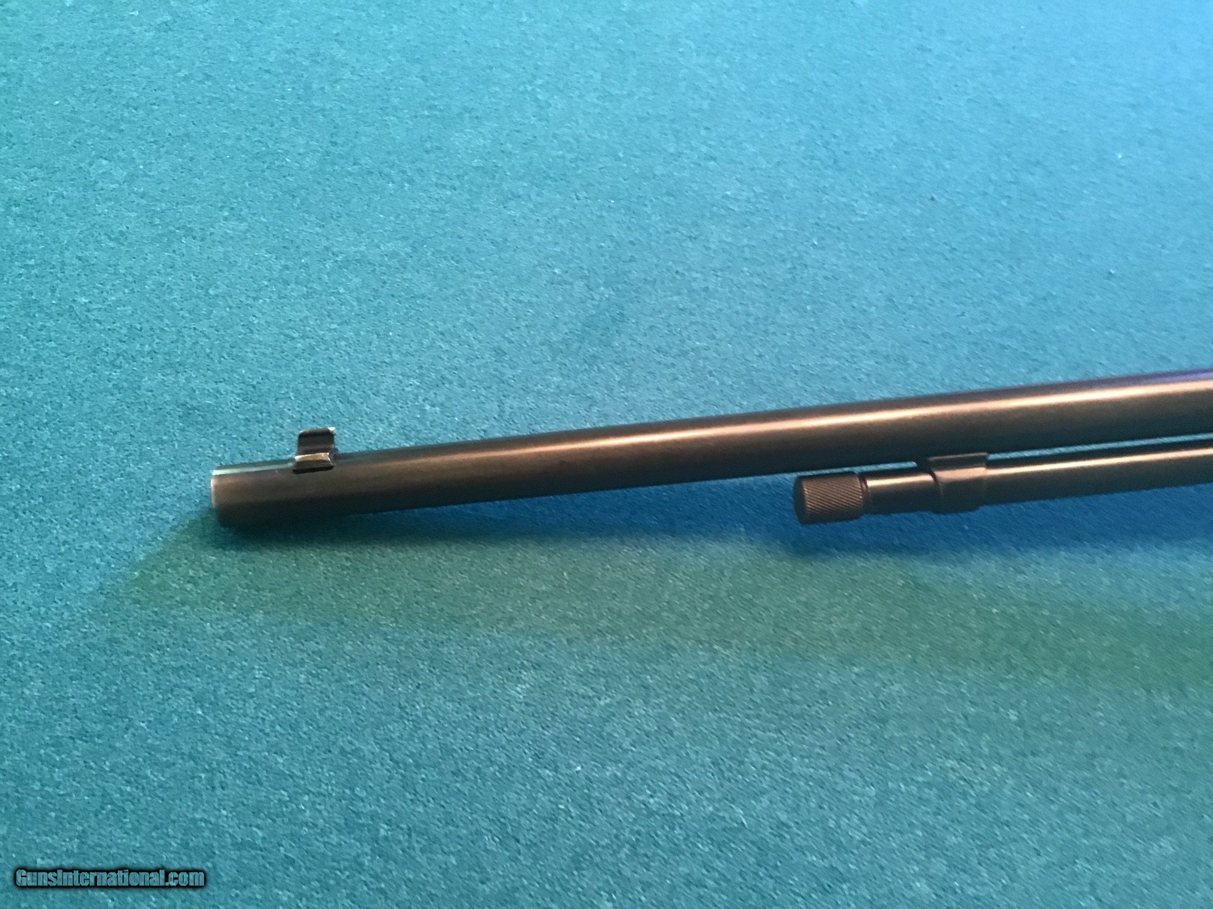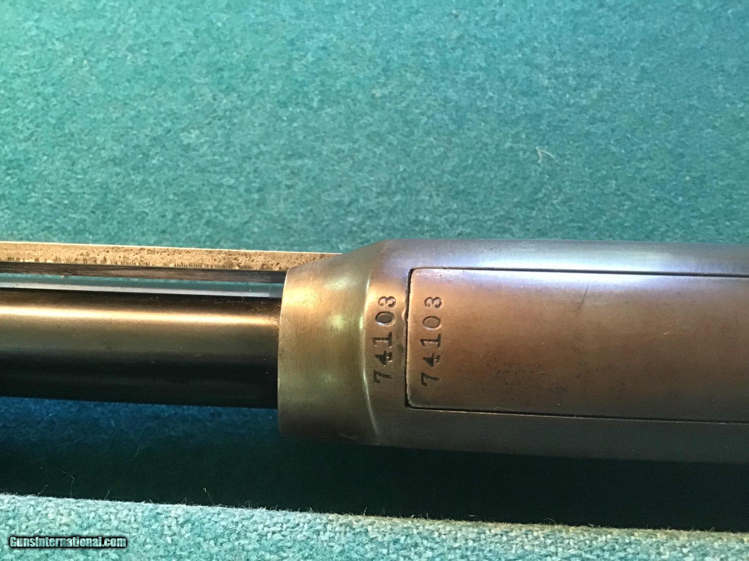 Description: Winchester model 61 barrel good metal has gray patina barrel and receiver wood rate good to excellent some handling marks grooved forend flat bottom slide action SOLD Curio/Relic: Yes Rifle Caliber: .22 Long Rifle Manufacturer: Winchester Model: 61 Serial Number: 74103 Barrel Length: 23 Condition: Good Metal Condition: Grey petina Wood Condition: Good to excellent Bore Condition: Good Action: Slide Stock: Walnut Stock Heel: Slight curve Fore End: Grooved Butt Pad: Metal LOP: 131/2 Manufacture Date: 1946 |