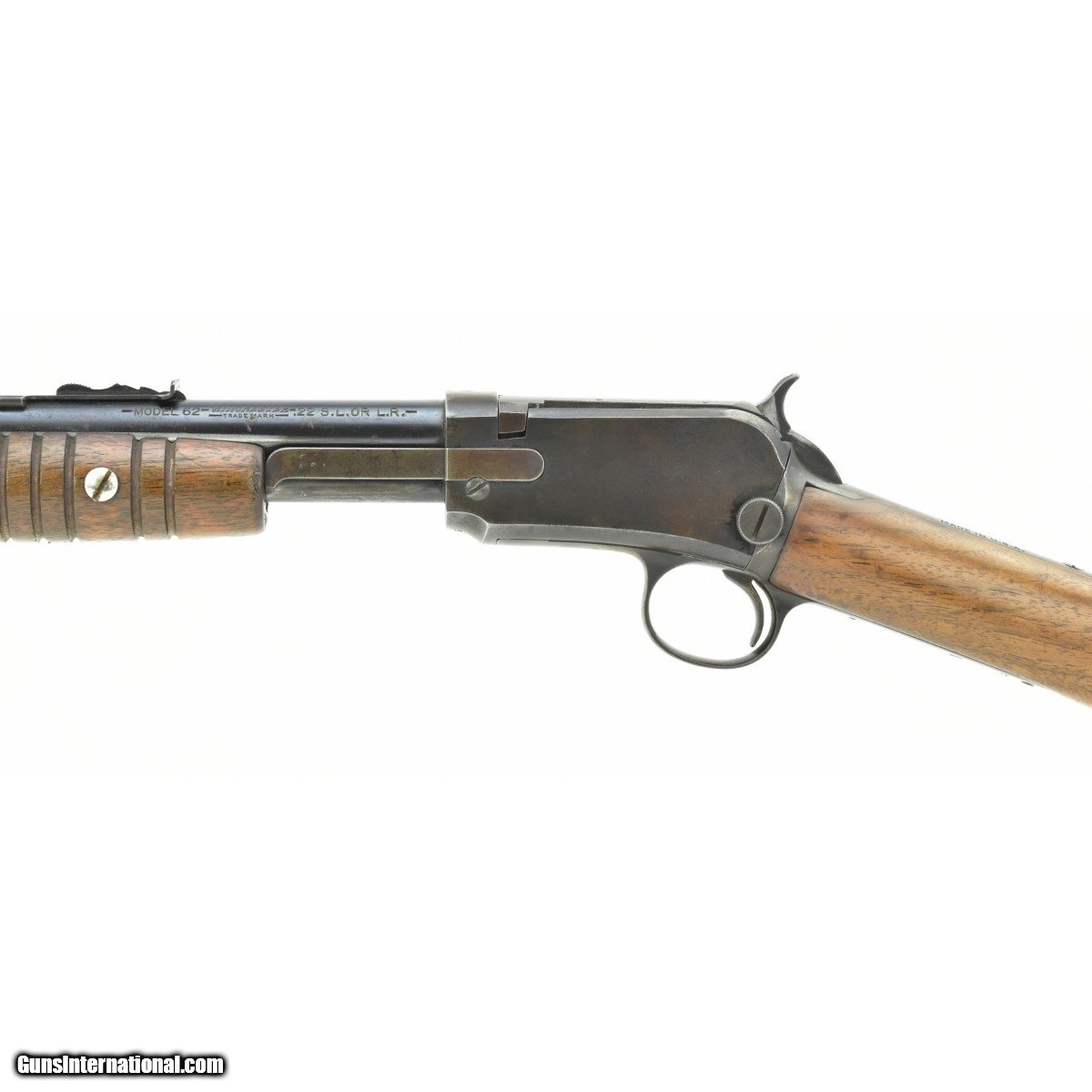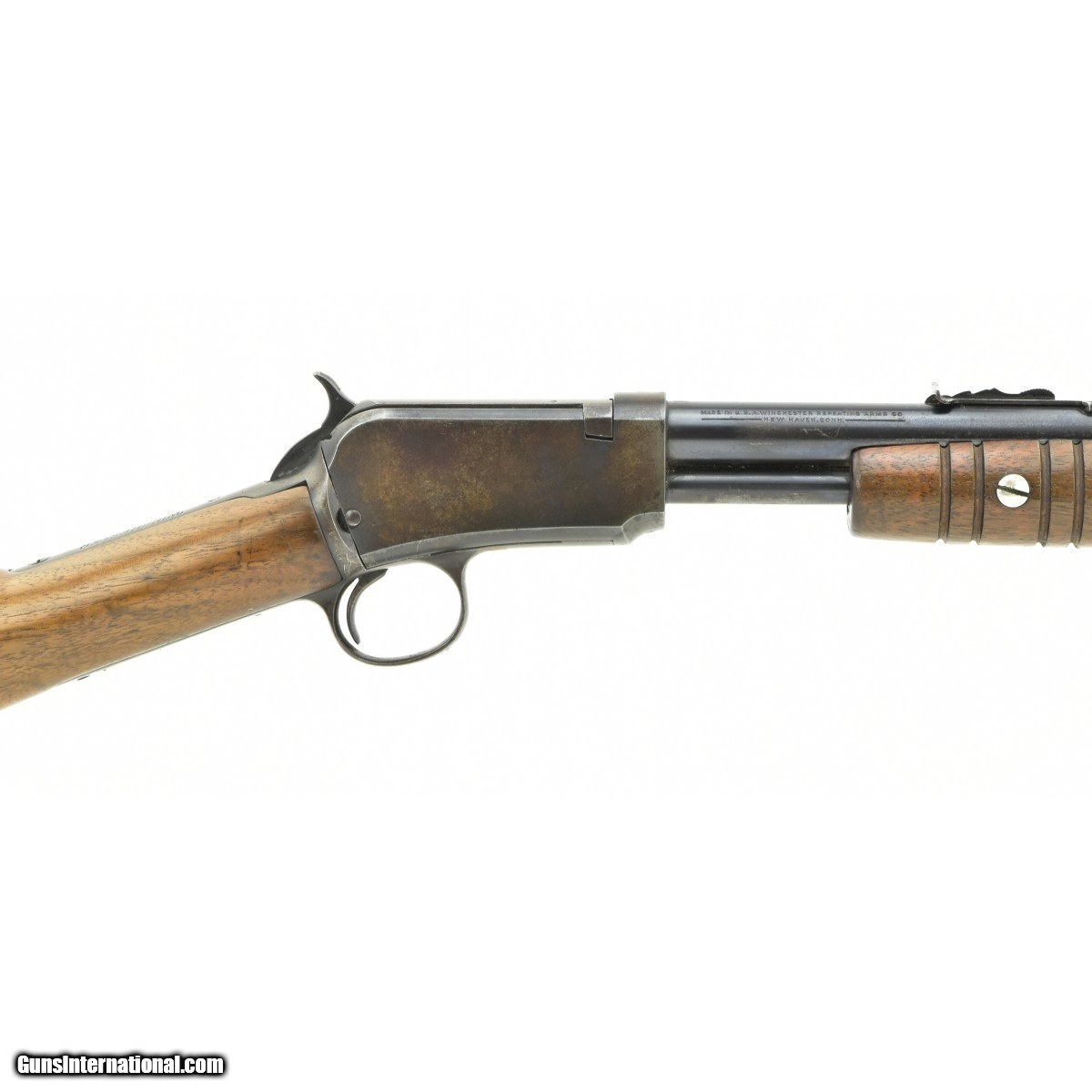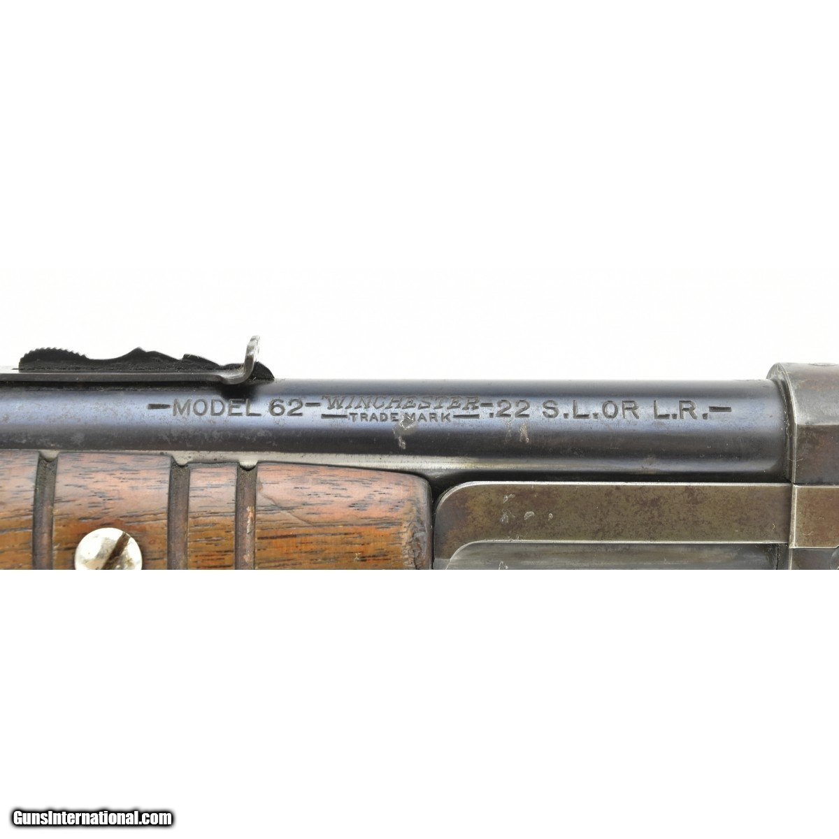 Description: " Winchester 62 .22 S, L, LR caliber rifle. Very early circa 1932 slide action rifle. 23" round barrel with fine bore. Correct sights. Approximately 90% blue finish. Stocks are very good with no cracks or chips. The forearm attachment screws are oversize replacements. Action functions correctly. All the early production features are present: small muzzle, small ten-groove forearm, high comb stock, checkered steel butt plate, low serial number “4815", and model 62 markings. This is a desirable early model 62 in better than average condition. SOLD Curio/Relic: Yes |