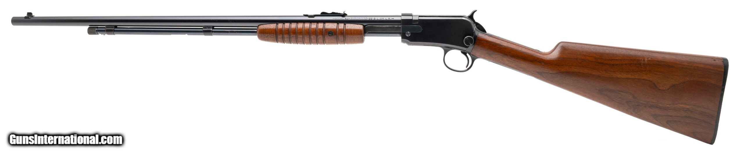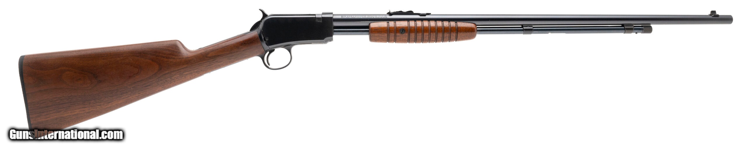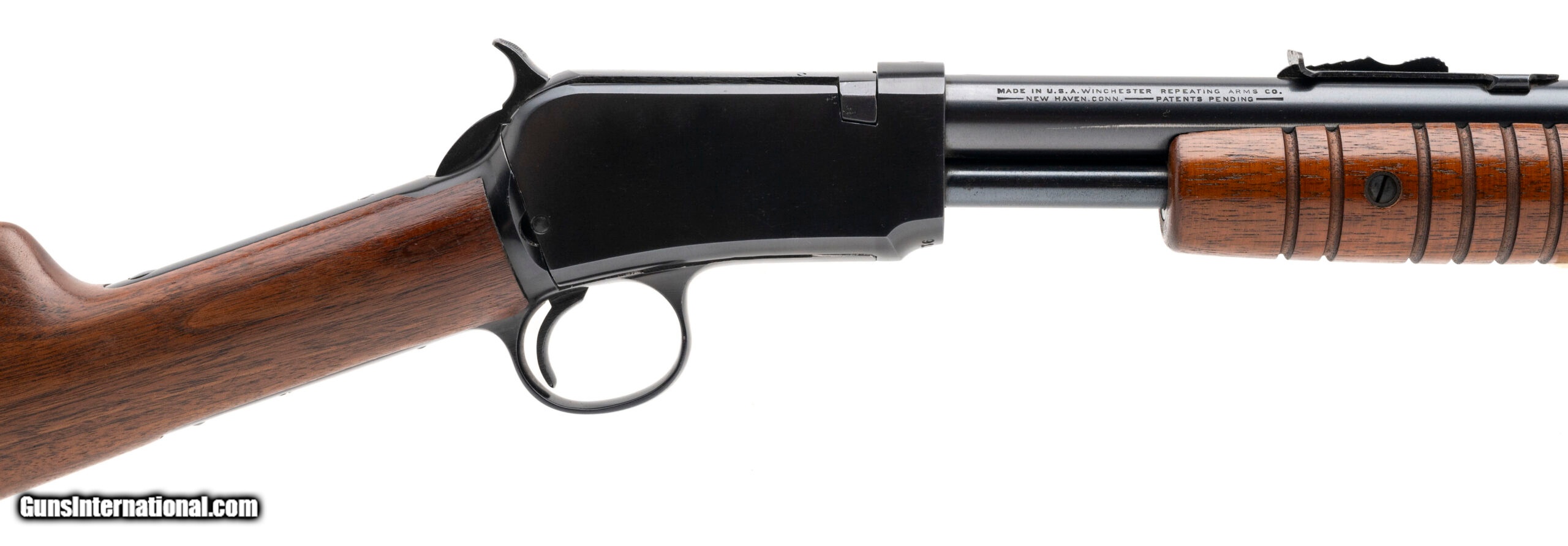 Description: "SN: 91873A. Made in 1939. .22 with a 23"" barrel. Bore is bright with strong rifling. Pre-64 pump action Winchester. Finish is in very good condition. Stock shows light handling wear on the left side. Overall very good condition. SOLD |