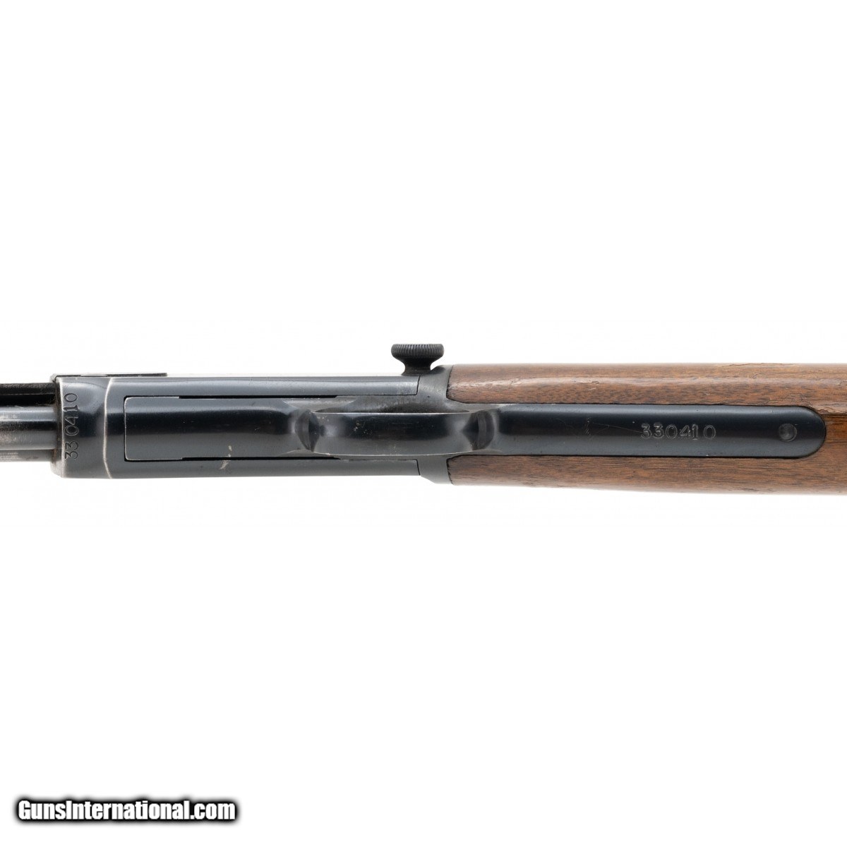 Description: " SN: 330410. Circa 1952. Chambered in .22 short, long and long rifle with a 23"" barrel, bore is excellent. Rimfire slide action rifle with 95% bluing and walnut stock. Overall very good condition with light wear on walnut furniture. SOLD |