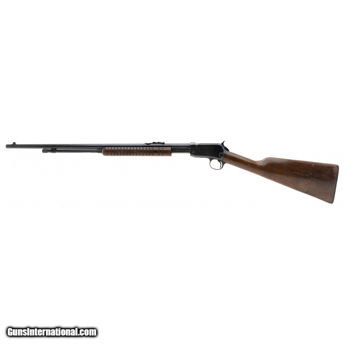 SN: 330410. Circa 1952. Chambered in .22 short, long and long rifle with a 23"" barrel, bore is excellent. Rimfire slide action rifle with 95% bluing and walnut stock. Overall very good condition with light wear on walnut furniture.