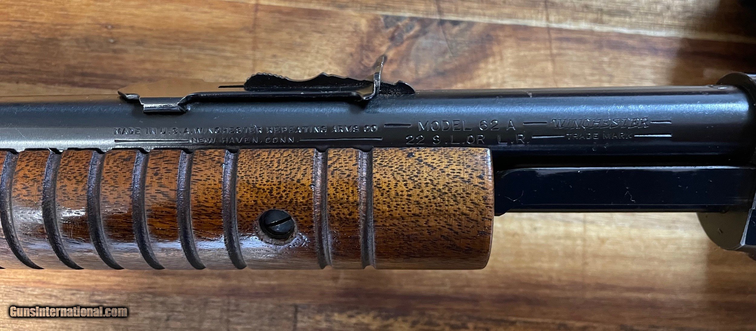 Description: 1947 Winchester Model 62A slide action take down rifle . 22 s , 22 l, or 22 LR Serial Number is 150777 barrel is 23" . Has walnut stock. gun was used so has normal signs of use . Overall the gun is in fin condition. SOLD Rifle Caliber: .22 Long Rifle, .22 Short, .22 Long Manufacturer: Winchester Model: 62 A Serial Number: 150777 Barrel Length: 23” Condition: Good |