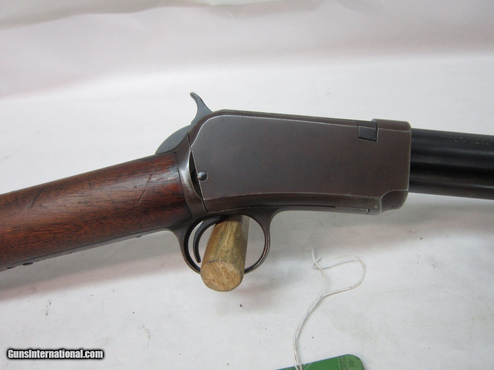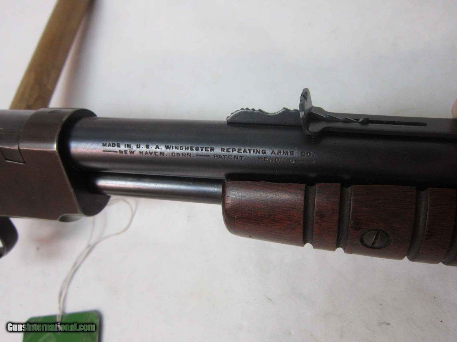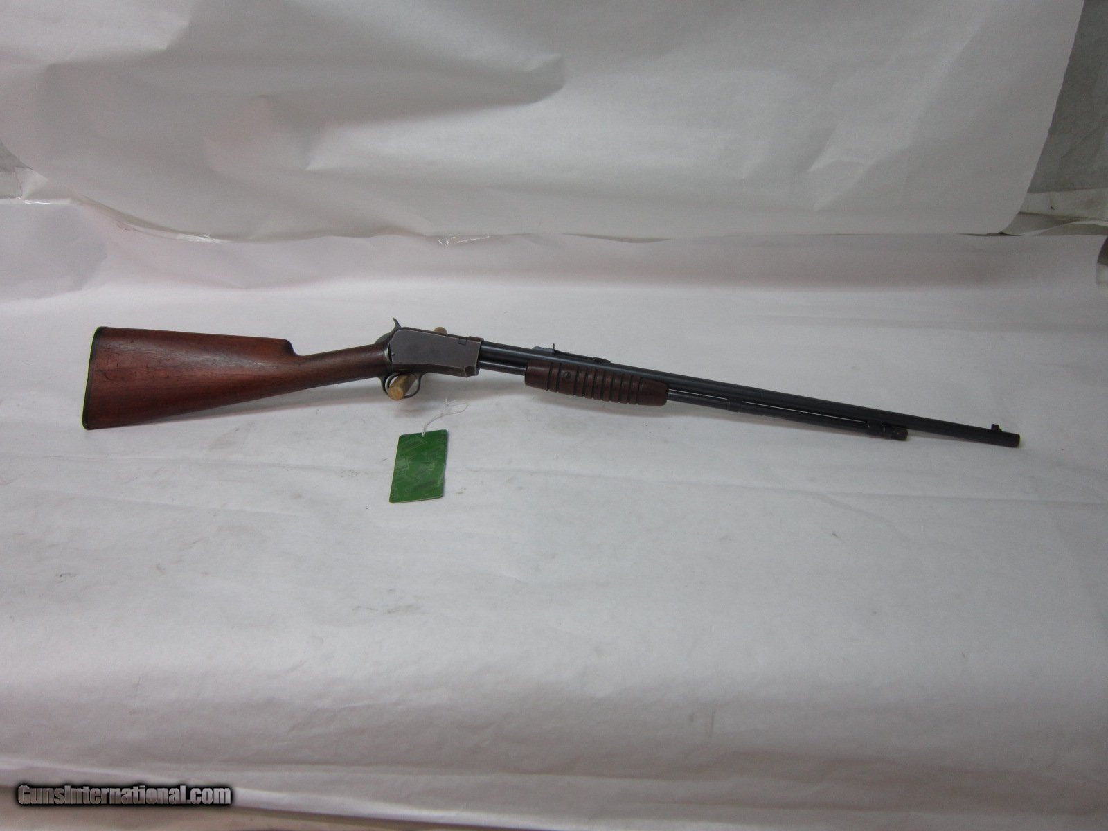 Description: Guns Listing ID: 1297984 MAKE: Winchester MODEL: 62 ACTION: Pump CALIBER: .22 Short, long, long rifle FINISH: Blued, faded to patina TYPE OF STOCK: Wood CONDITION: Good, antique BARREL LENGTH: 23\" OVERALL LENGTH: 39 1/2\" PULL LENGHT: 13 3/8\" SCOPE: N/A SIGHTS: Buck horn and silver bead on post NUMBER OF MAGS: N/A CAPACITY: 12+1 CHOKE TYPE: N/A CASE: N/A ACCESSORIES: N/A SERIAL #: 23758 ADDITIONAL DESC: A good condition antique rifle. The external finish does show it‚‚s age, with some fading of the original bluing and the receiver has taken on a \"plumb\" patina coloring. The 23 inch barrel has a bulge about half way down the bore and should NOT (!!!) be fired. The rifle does have fairly tight bolt lock up and would be a prime candidate for re-lining. The left side of the barrel has also been drilled and tapped for a barrel mounted side mount optic. Our gunsmith plugged three of the holes, but one of the original screws has broken off and is stuck in the front hole. Sorry, but we do not have the factory/importer‚‚s box, owner‚‚s manual, sling, ammunition, cleaning kit, or any other tools or accessories for the rifle. While the rifle has been cleaned, lubed and inspected by our gunsmith, it has not been test fired. We do not ship directly to C&R holders. This rifle will be shipped by FedEx ground to the \"lower 48\" for $35. No, our gunsmith doesn‚‚t have access to the correct tooling or a lathe and is un-able to re-line the bore for SOLD Manufacturer: WINCHESTER Model: 62 Caliber Info: .22 LR Condition: Used - Non-Certified Barrels: 23 BARREL Finish: PATINA |