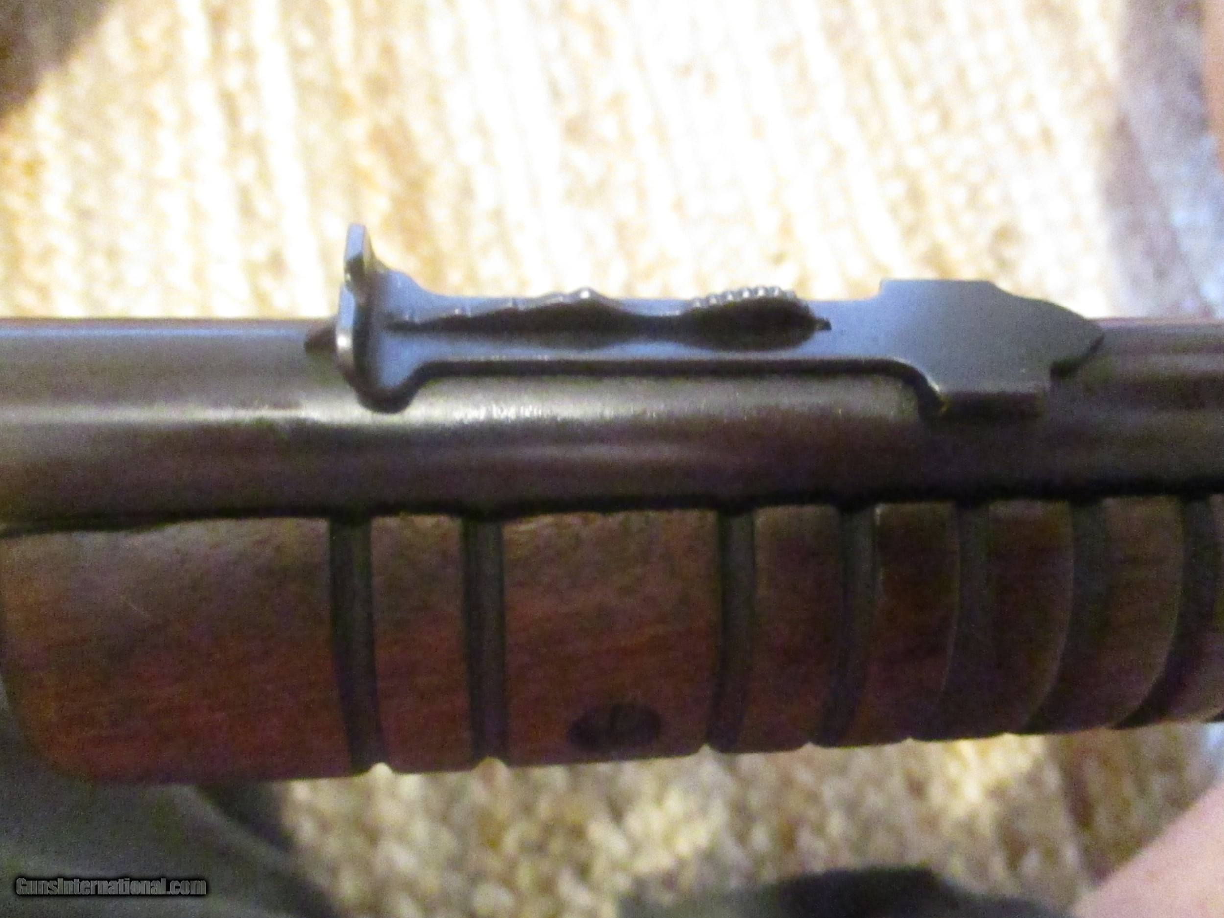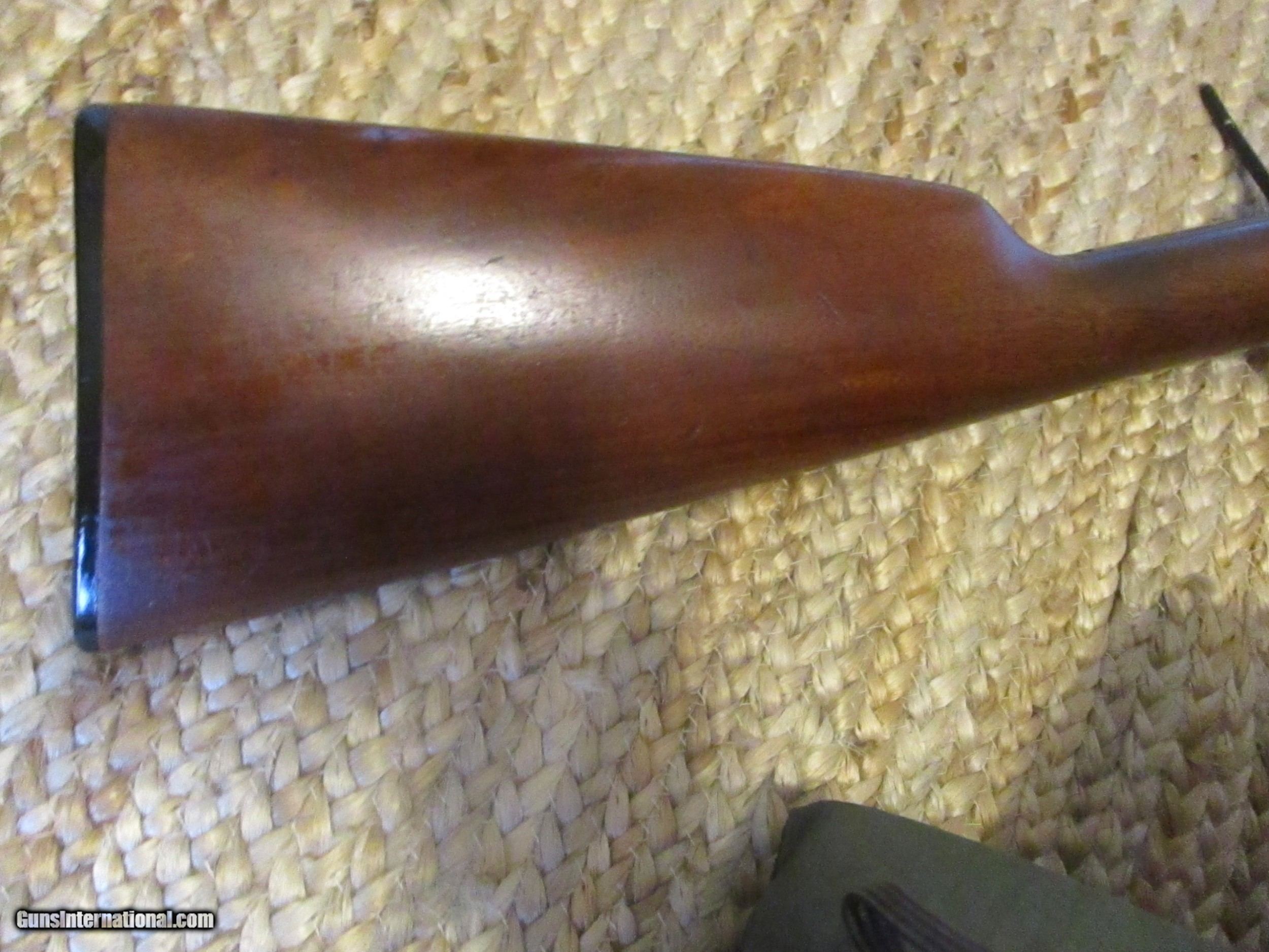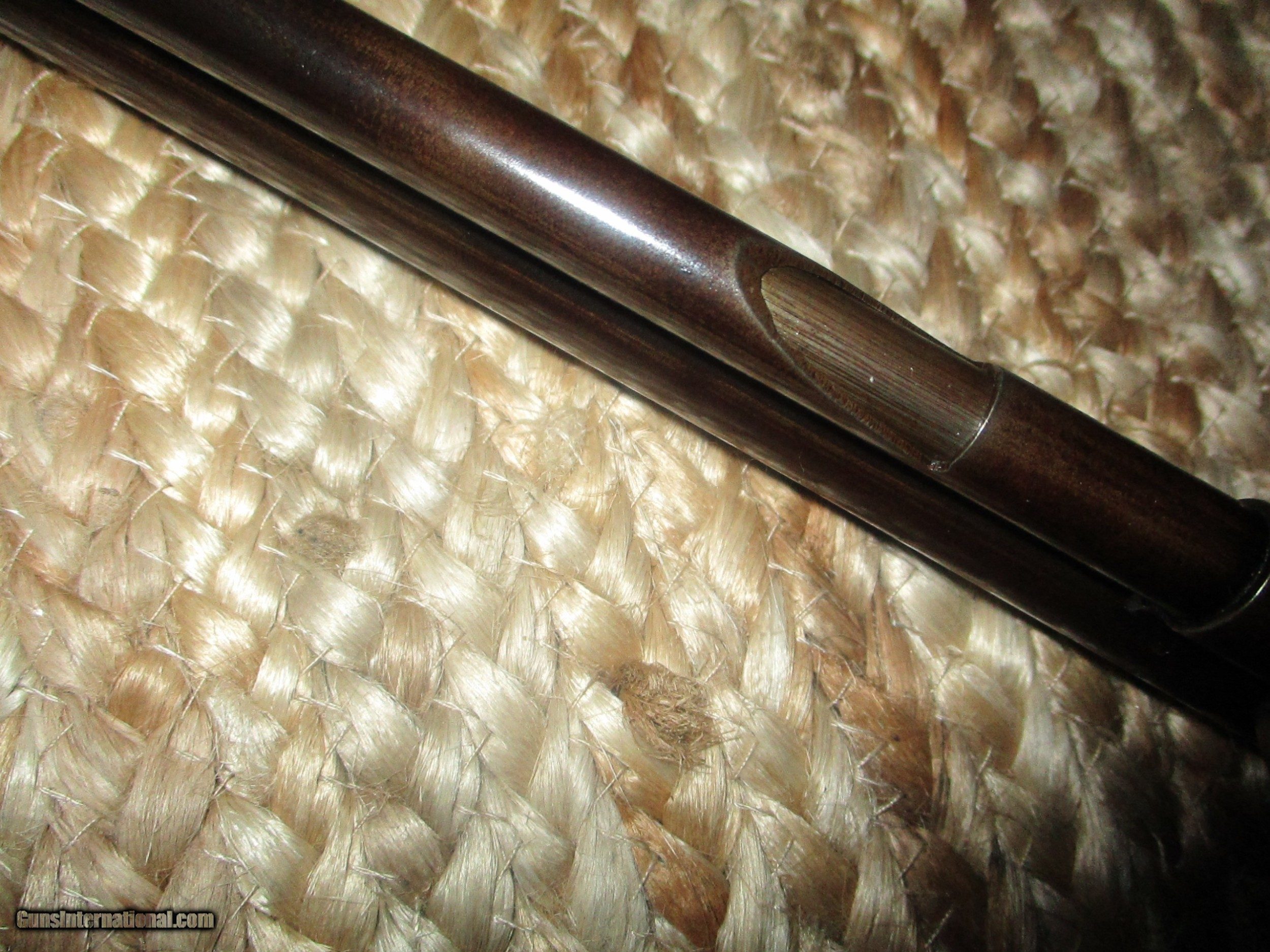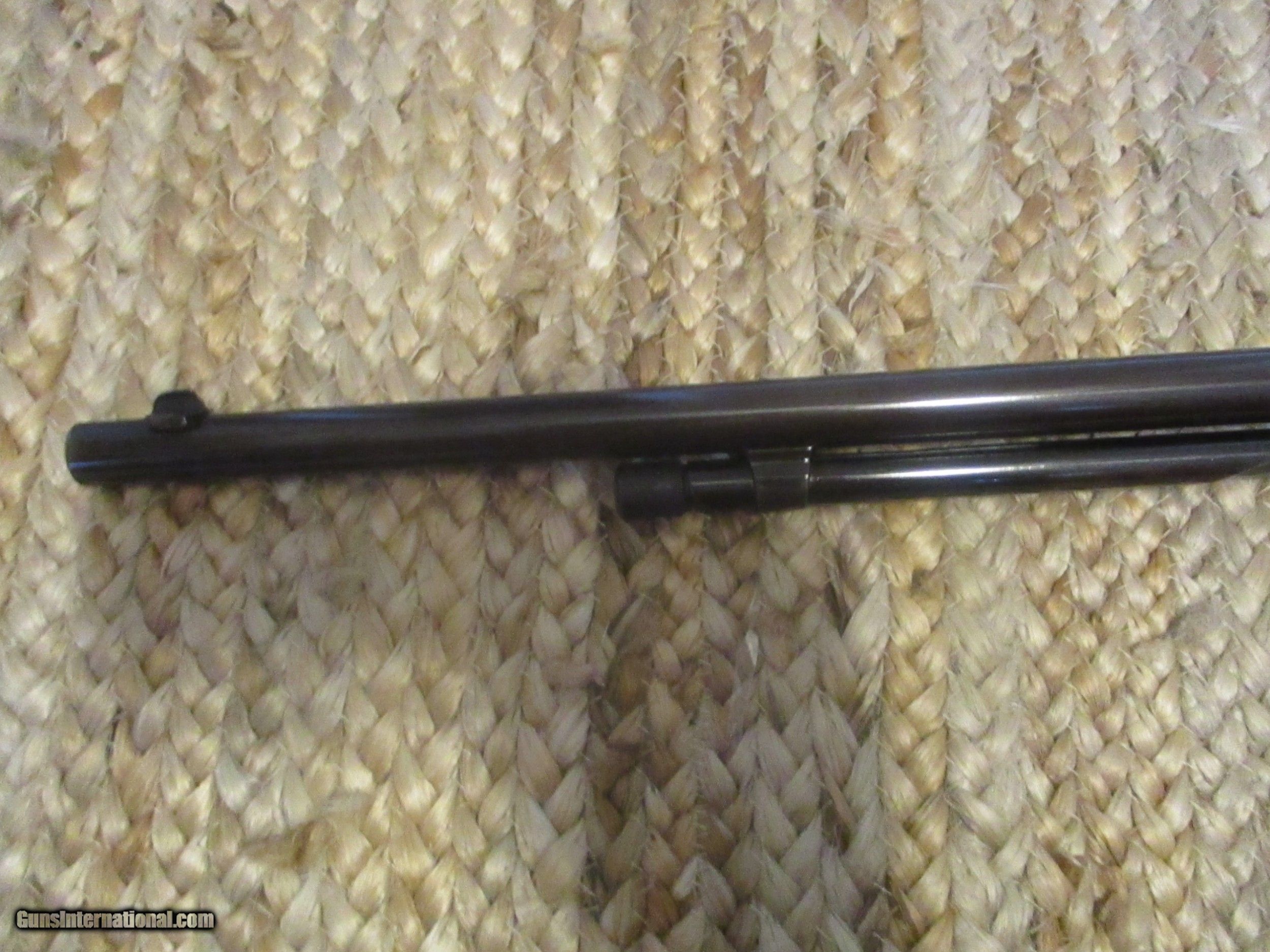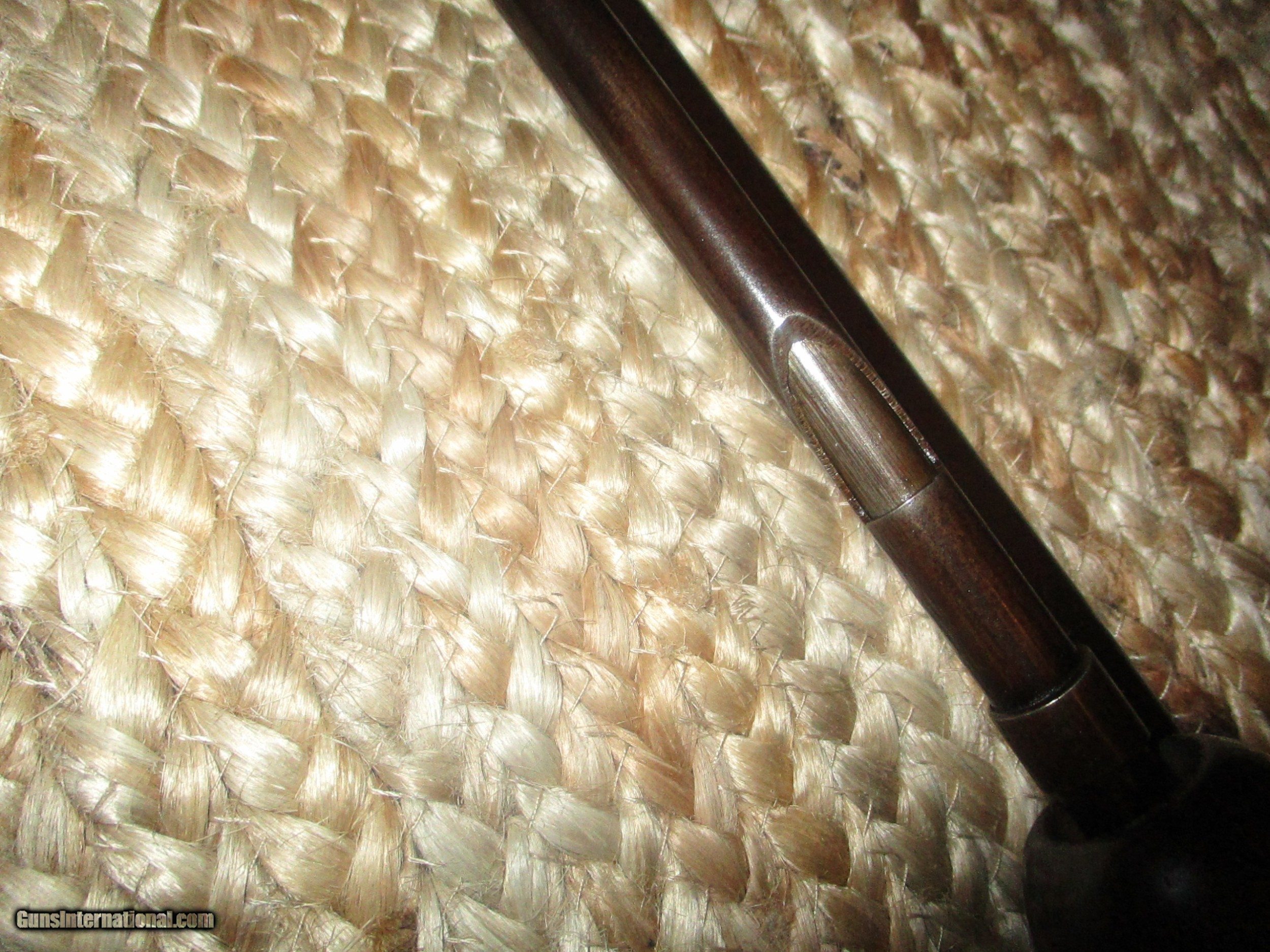 Description: 23" bbl., open sights, brass bead front, blue/patina, no rust or freckles, perfectly smooth metal, all blue receiver with 90% blue, nice solid walnut stock, 17 band forearm, no cracks, hairlines or repairs, original Winchester buttplate, bore excellent, with vivid rifling, no dark areas! Very nice original 40's Gallery gun. SOLD |