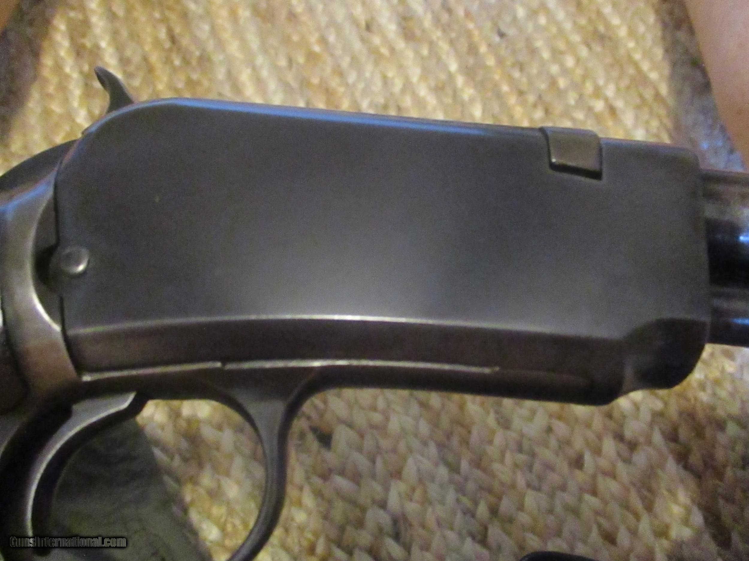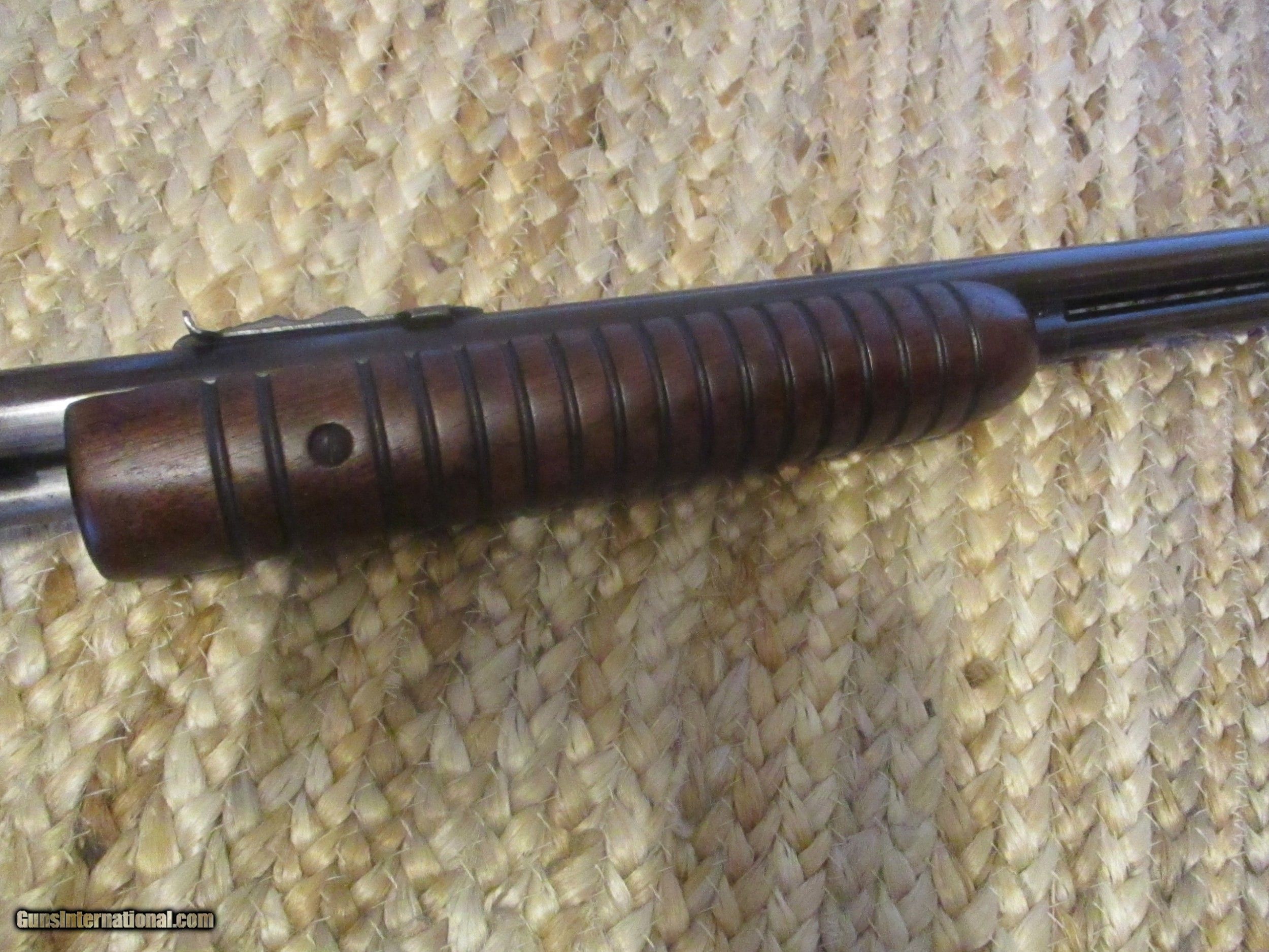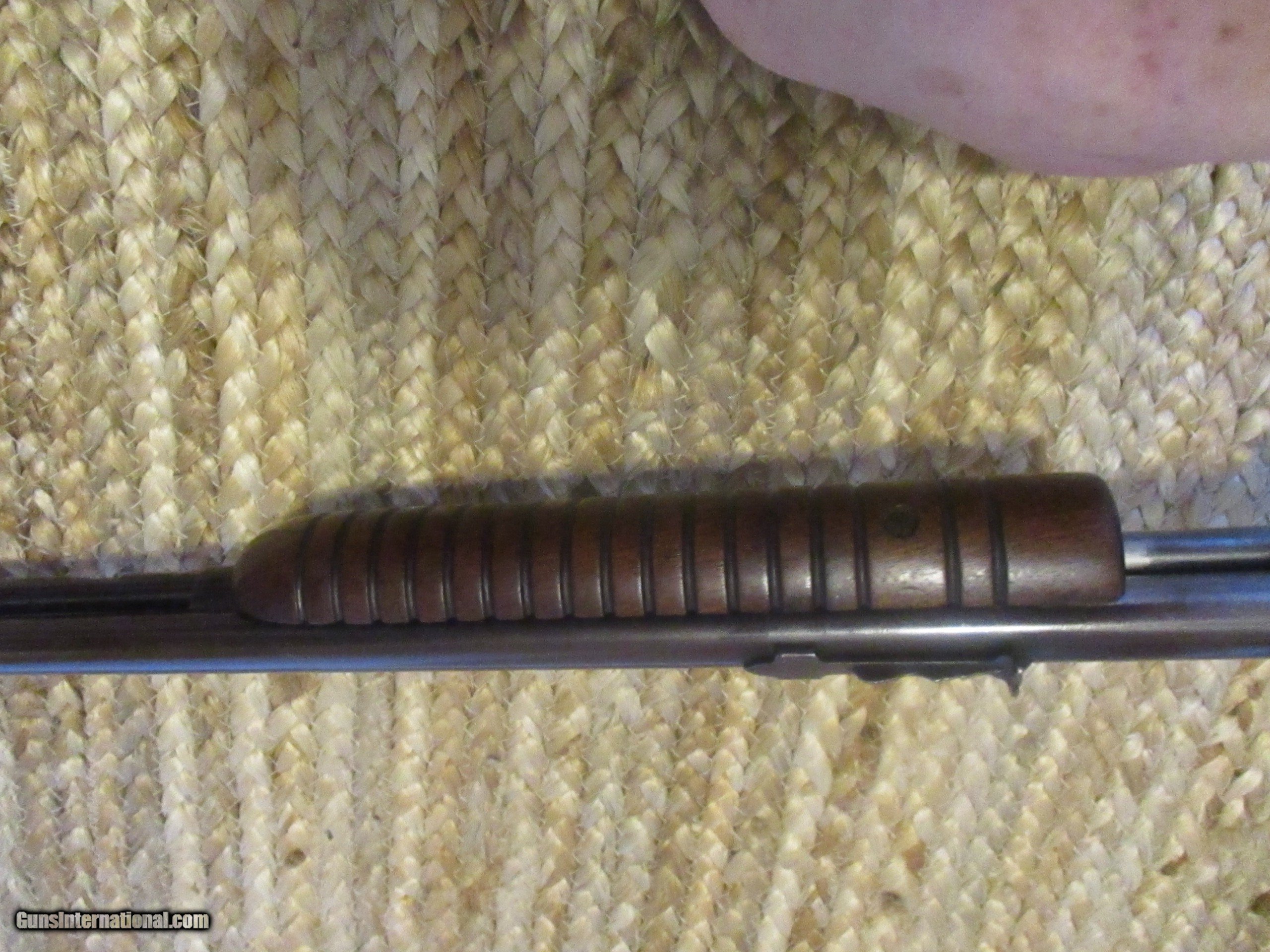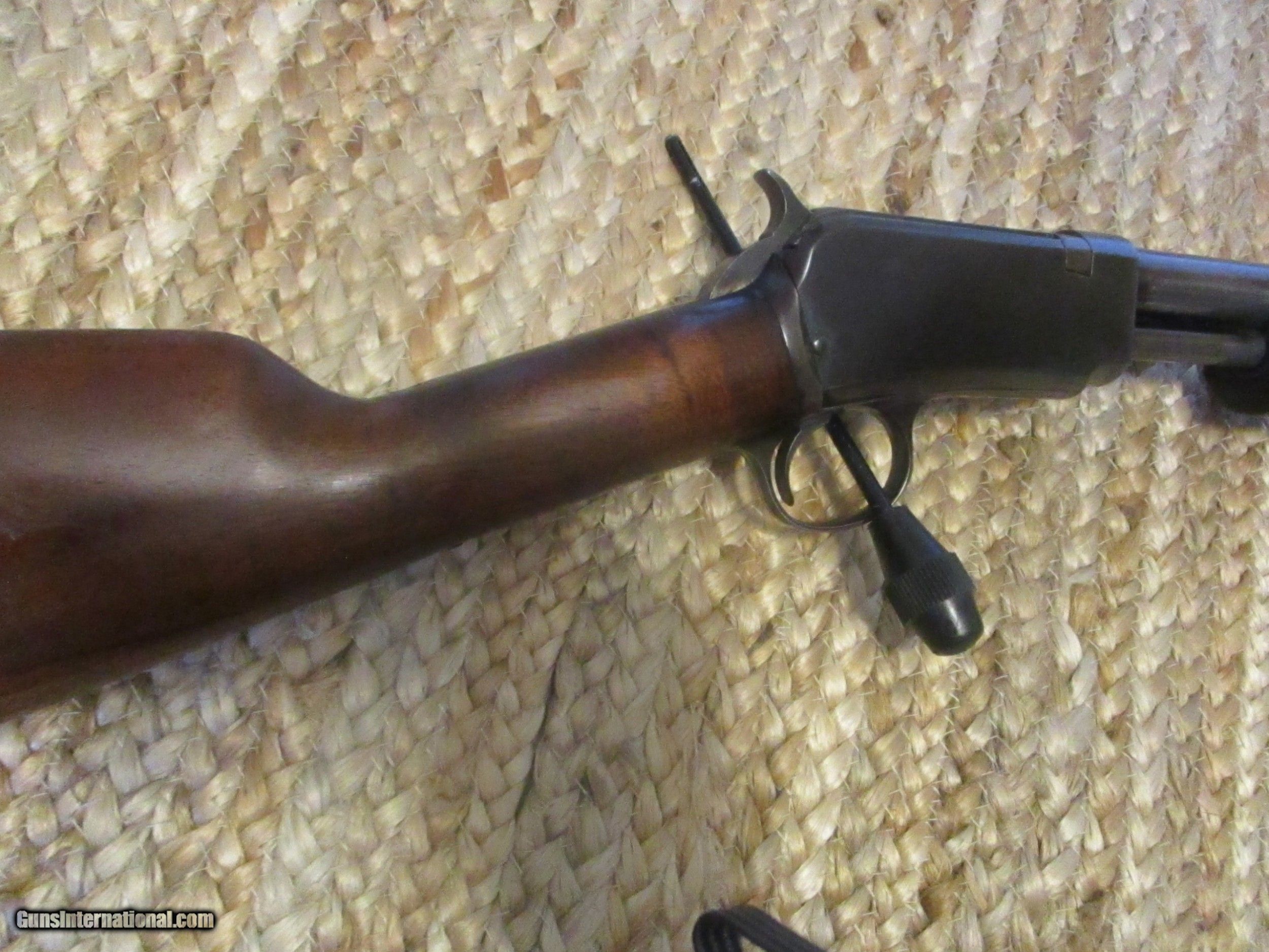 Description: 23" bbl., open sights, brass bead front, blue/patina, no rust or freckles, perfectly smooth metal, all blue receiver with 90% blue, nice solid walnut stock, 17 band forearm, no cracks, hairlines or repairs, original Winchester buttplate, bore excellent, with vivid rifling, no dark areas! Very nice original 40's Gallery gun. SOLD |