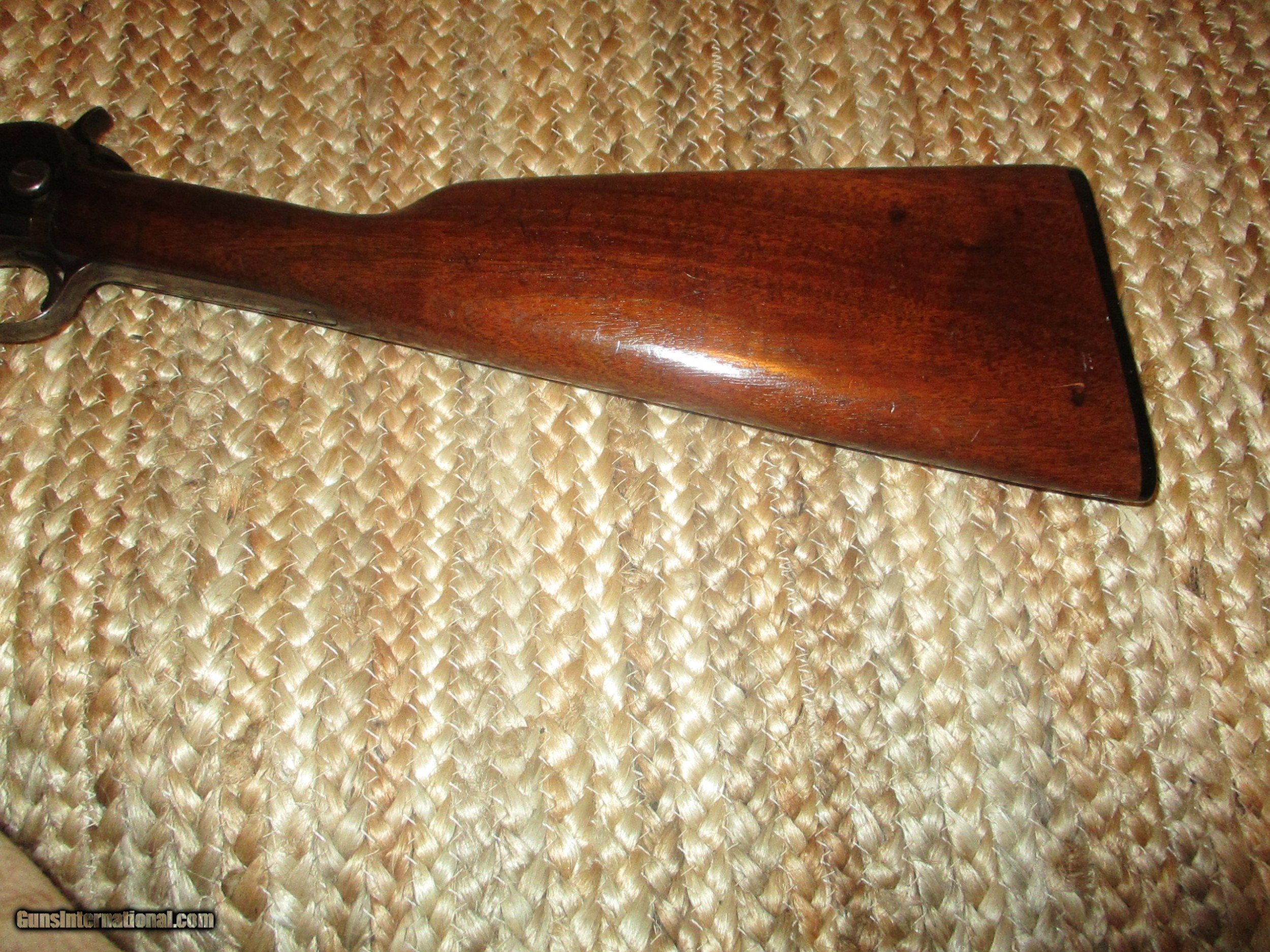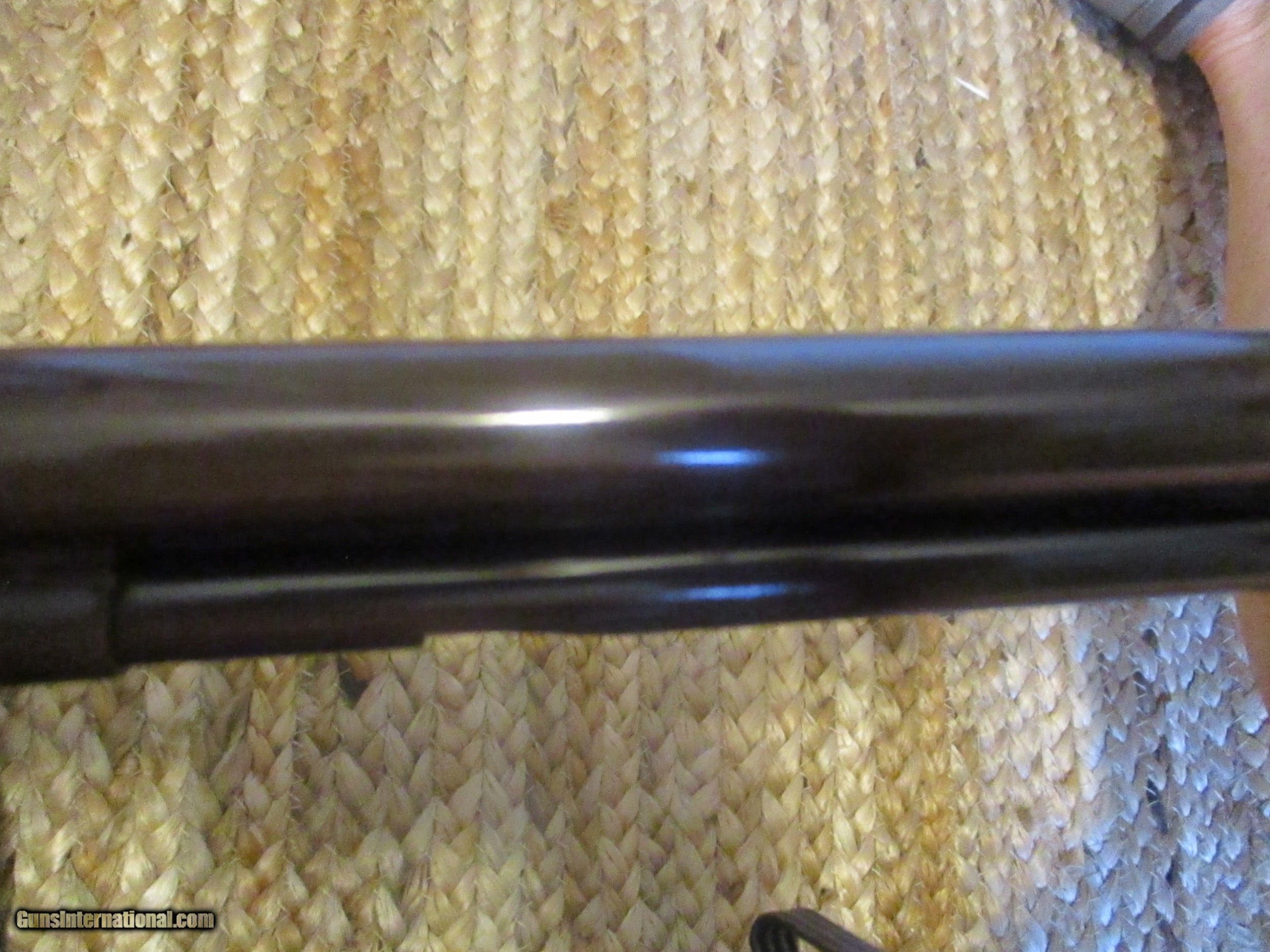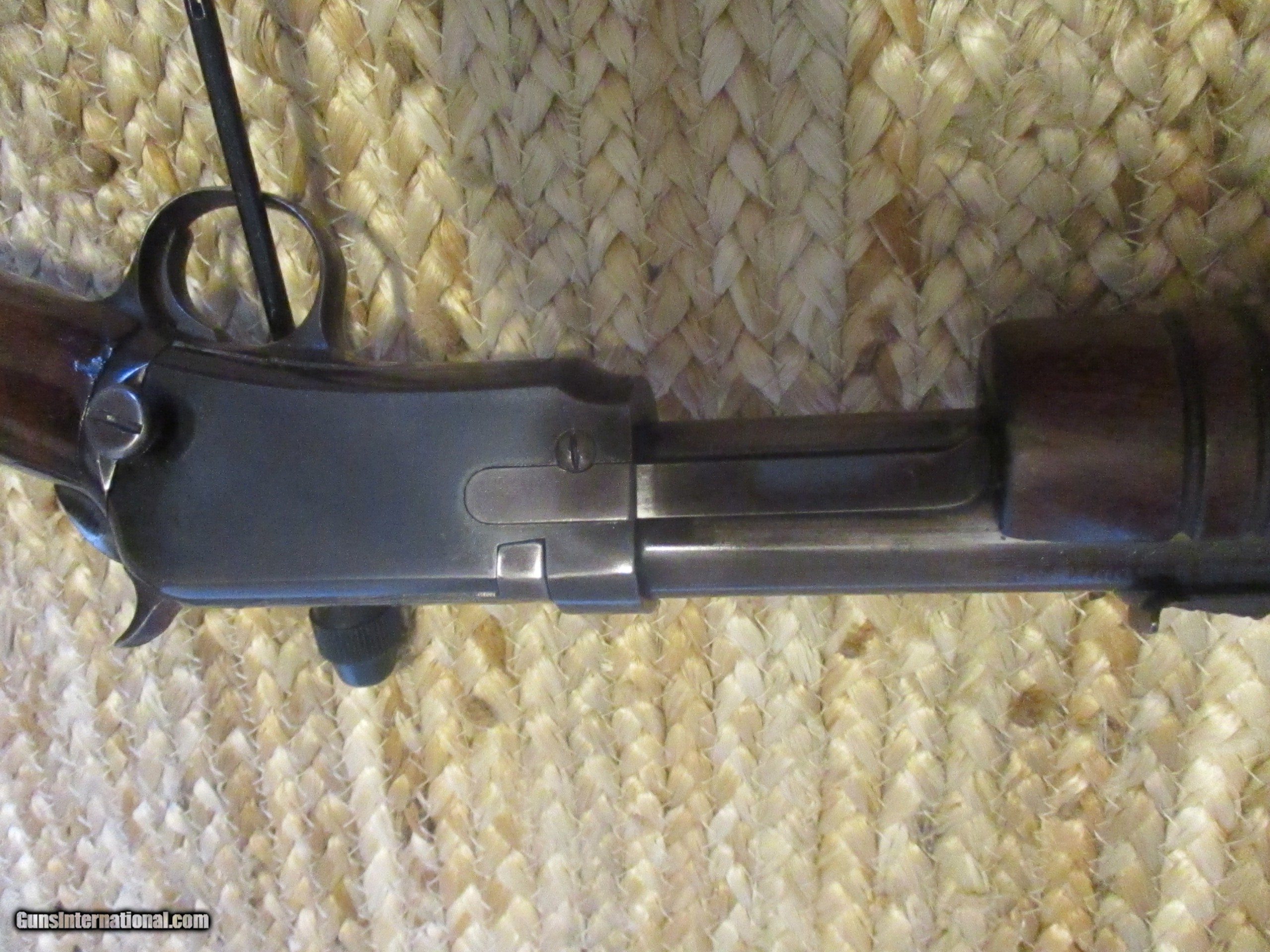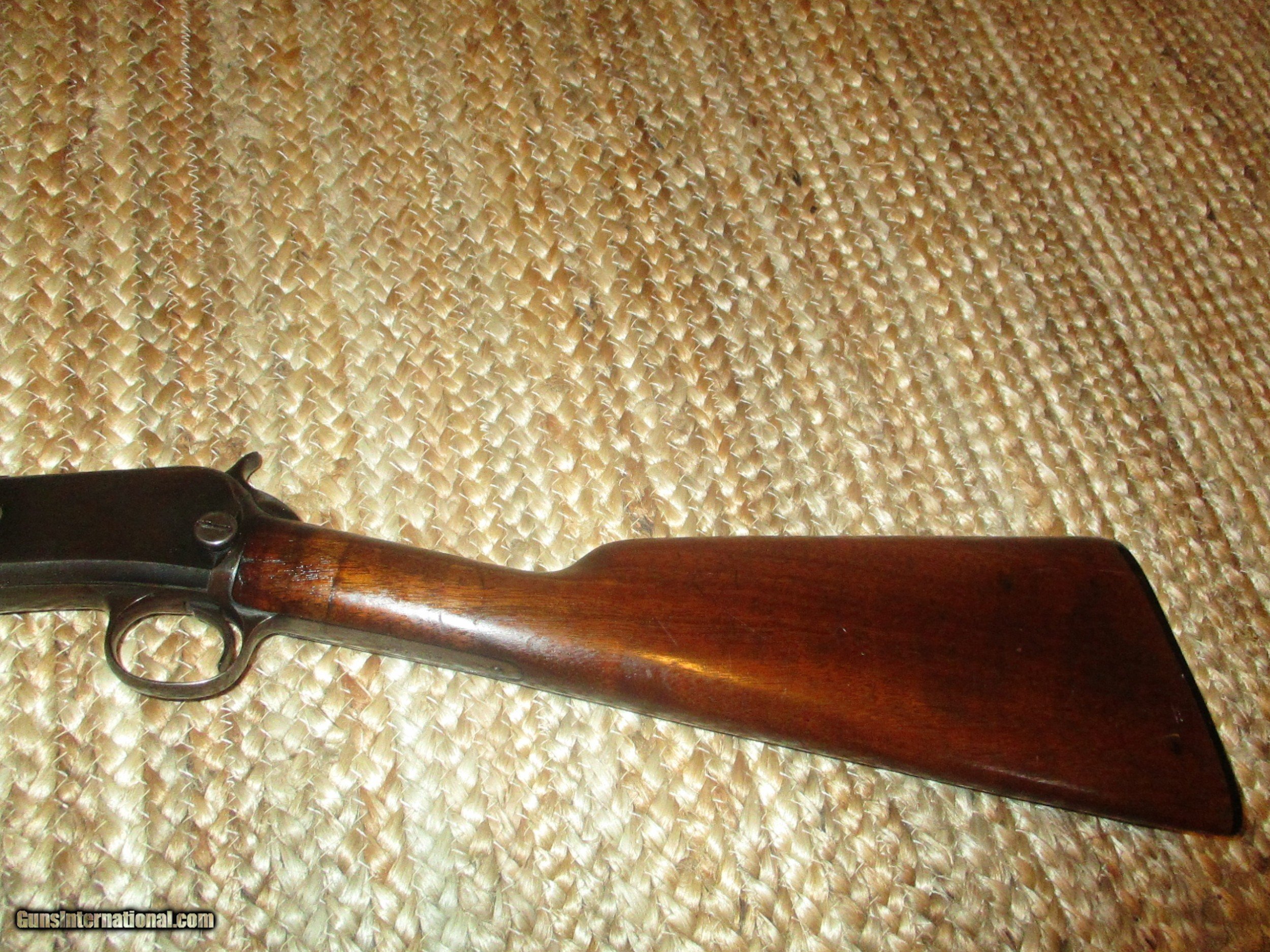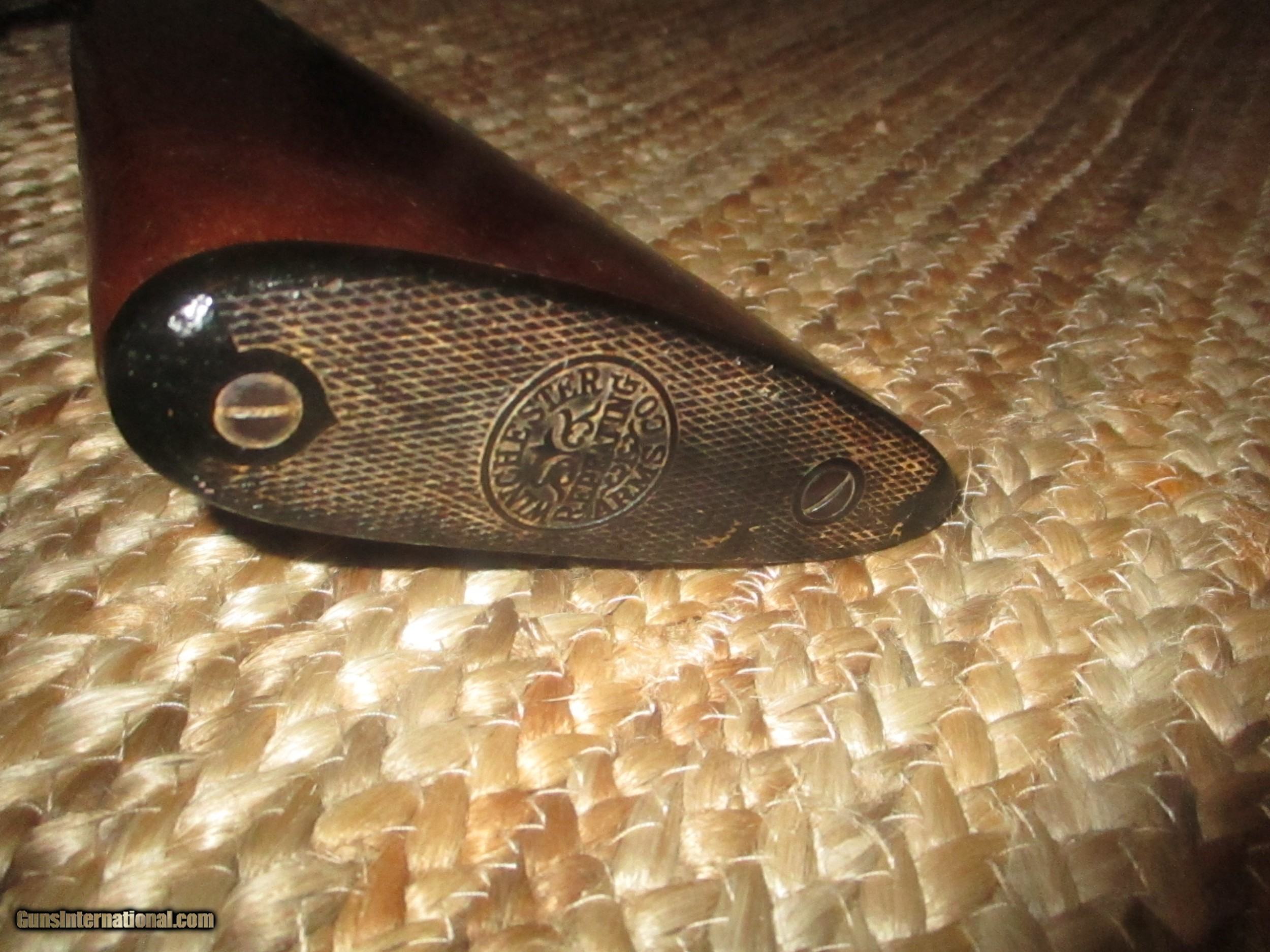 Description: 23" bbl., open sights, brass bead front, blue/patina, no rust or freckles, perfectly smooth metal, all blue receiver with 90% blue, nice solid walnut stock, 17 band forearm, no cracks, hairlines or repairs, original Winchester buttplate, bore excellent, with vivid rifling, no dark areas! Very nice original 40's Gallery gun. SOLD |
