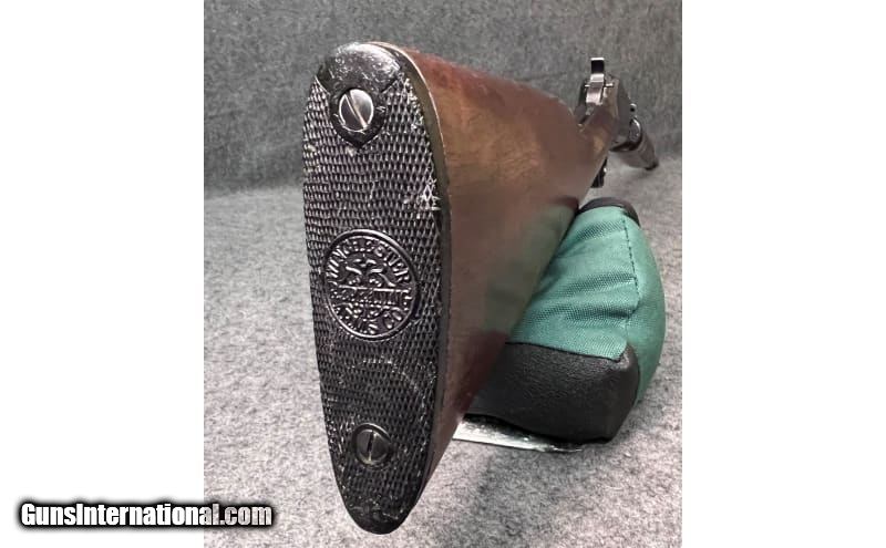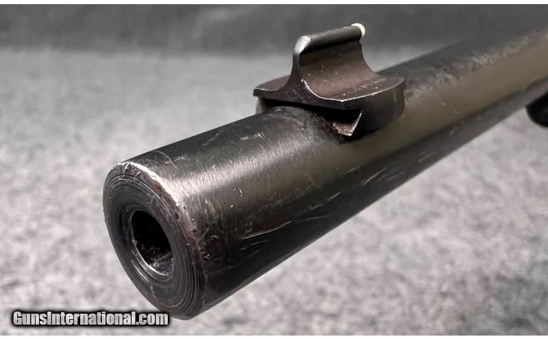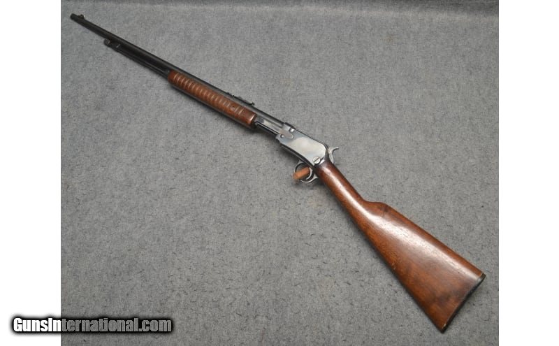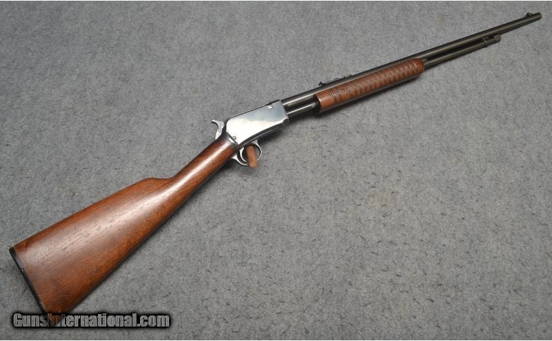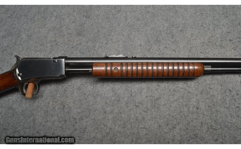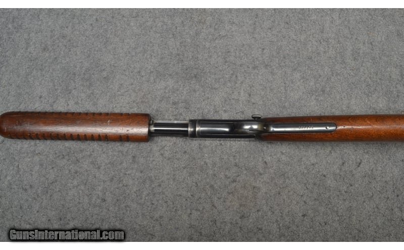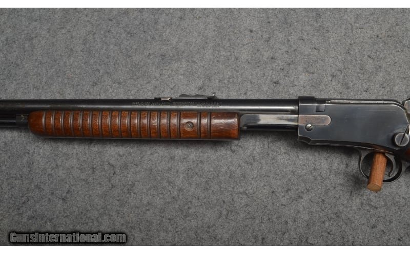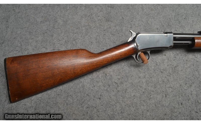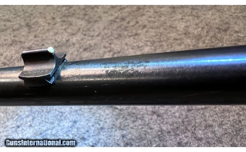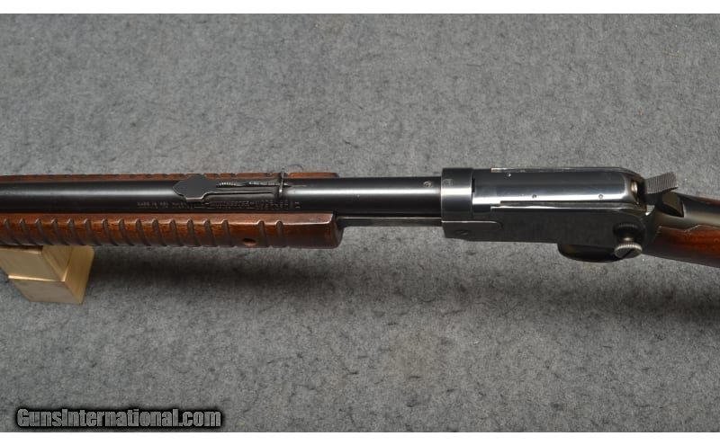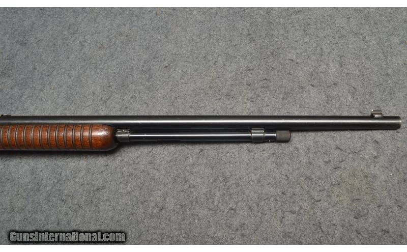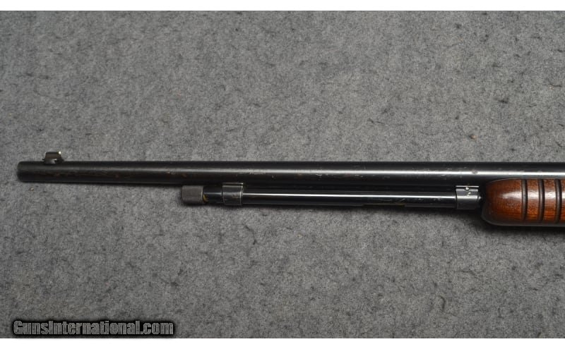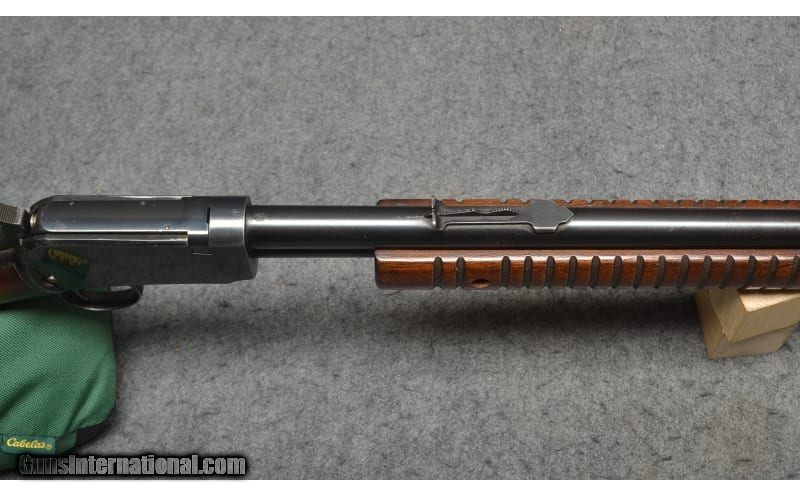 Description: This 1957 vintage slide-action, take-down, rimfire rifle is a Winchester Model 62A chambered for .22 Short, Long, or Long Rifle. The Winchester Model 62A was the last in line of a series of slide-action, tube-fed rimfire rifles. This specimen has a fixed dovetailed blade white bead front sight, adjustable v-notch rear sight, 17 groove forearm, and an external hammer. It has matching receiver and tang serial numbers. The barrel bluing shows considerable wear along its length; the bluing on the receiver however is quite good showing some loss on the sharp edges. The furniture shows considerable wear, mars and handling marks to the forearm, the stock has a great patina but does show moderate to light handling wear. .22 Short/Long/Long Rifle SOLD Curio/Relic: Yes Metal Condition: "Barrel bluing shows considerable wear along its length, bluing on receiver however is quite good showing some loss on the sharp edges Wood Condition: "Considerable wear, mars and handling marks to the forearm, the stock has a great patina but does show moderate to light handling wear Bore Condition: "Bore is shiny, with some rifling visible Barrels: "23"" round, tapered barrel Stock Dimensions: 39½ inches overall length Fore End: Wide side-grooved pump forearm with 17 grooves Butt Pad: Original Winchester Repeating Arms hard plastic butt plate Weight: 5 lb 5 oz Sights: "Fixed dovetailed blade white bead front sight, adjustable v-notch rear sight Item Location: Wichita, KS |