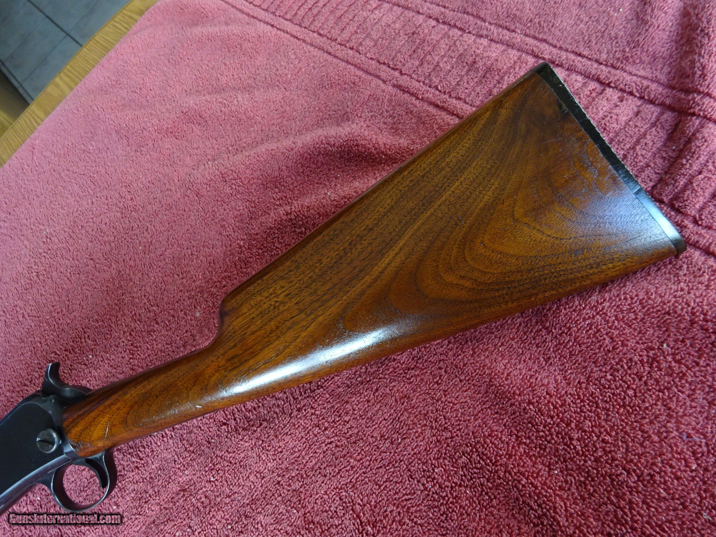 Description: WINCHESTER MODEL 62-A, 22 S. L. OR L.R. 98% BARREL BLUE, MIRROR PERFECT BORE. FRAME HAS SLIGHT BLUE WEAR ON THE SHARP EDGES. EXCEPTIONAL WOOD, NICELY FIGURED WITH DARK STREAKS, WOOD IS EXCELLENT WITH NORMAL HANDLING MARKS IN THE VARNISH, PERFECT BUTTPLATE. MADE IN 1940, NICE 100% ORIGINAL GUN. $875.00 + $50.00 Insured shipping to an FFL address. See all Pats gun listings on this site! We also have hundreds of pieces of ORIGINAL gun company advertising & memorabilia available for sale on our site SPORTINGCOLLECTIBLES. We have no reprints or reproductions. Email for more information. SOLD Curio/Relic: Yes |